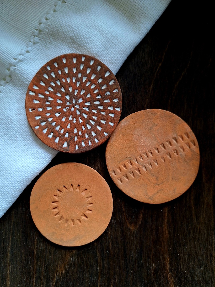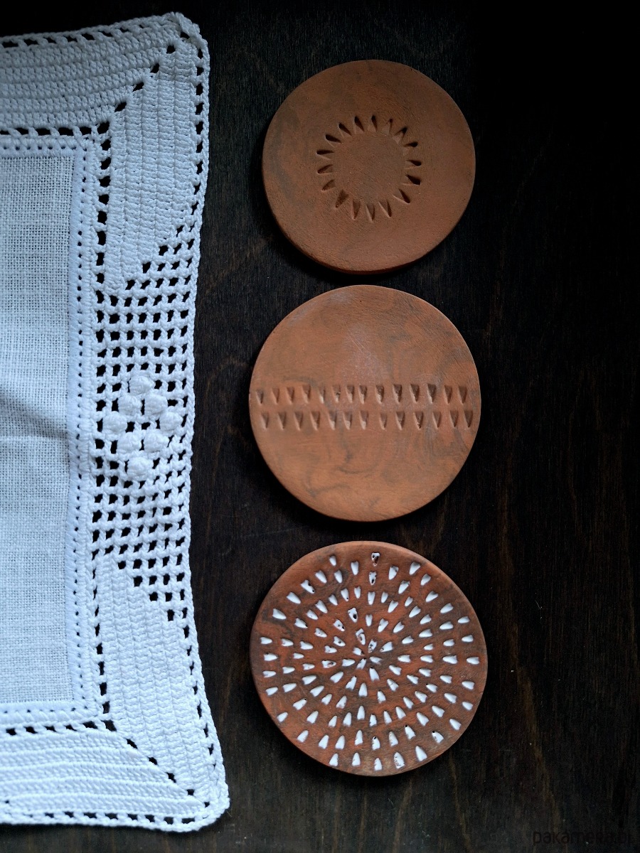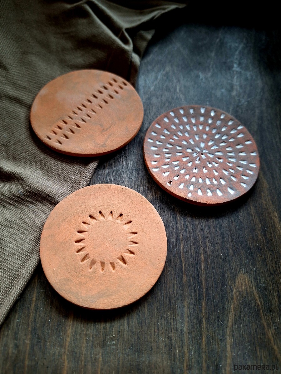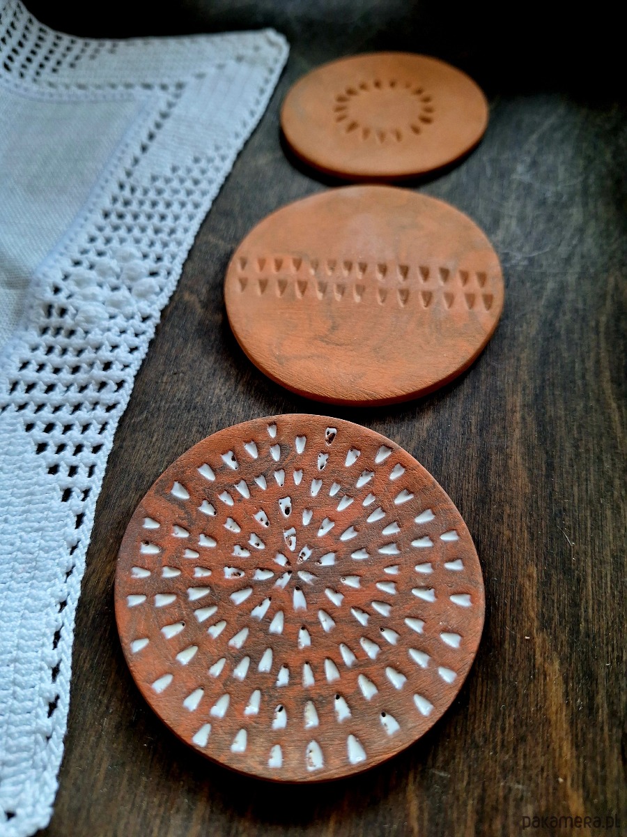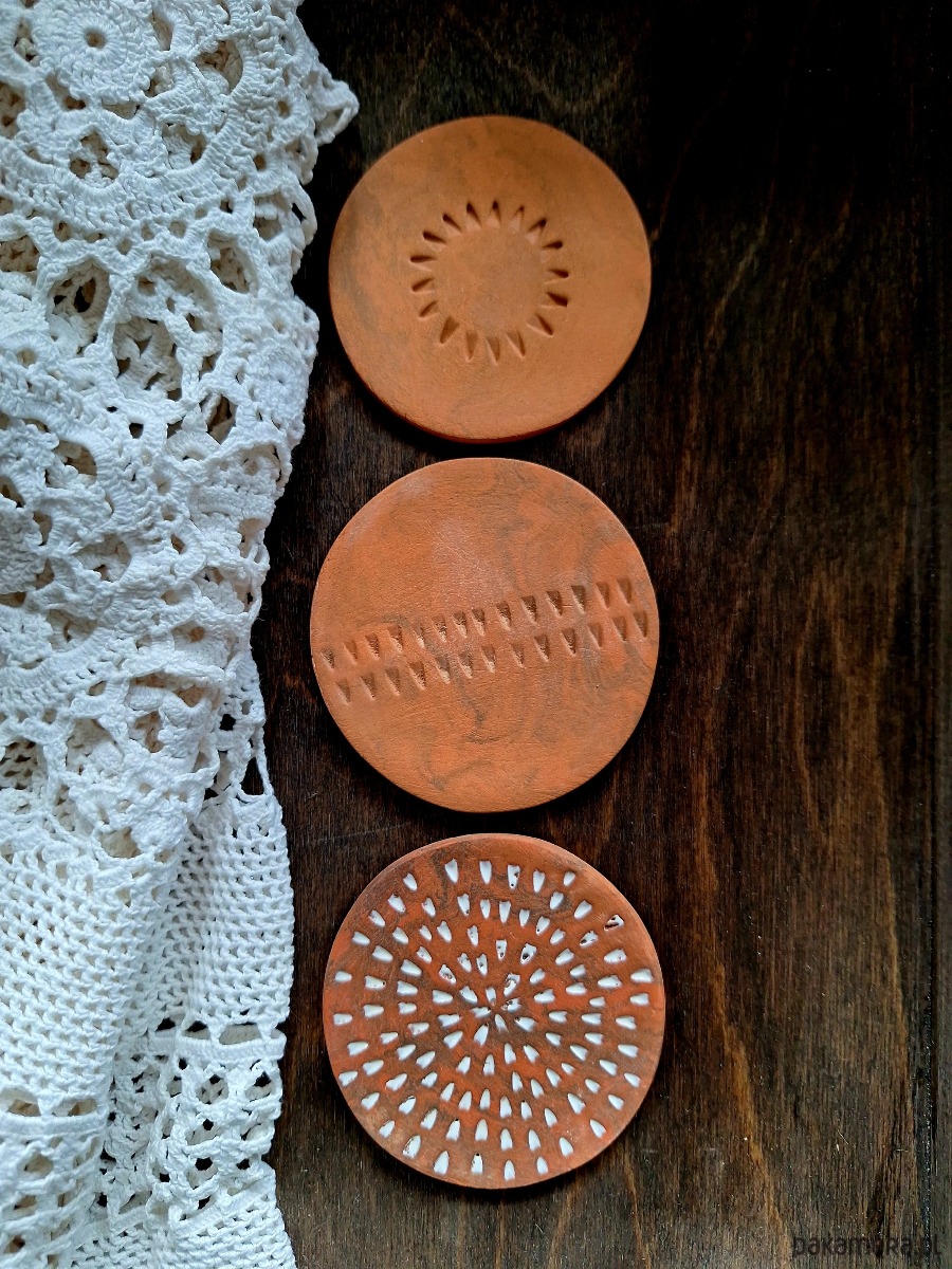 Ceramiczna dekoracja ze zdobieniami 3 sztuki. Ozdoba stanowi wypalony biskwit w kolorze rudym/pomarańczowym, na jednym biale szkliwo. Dekor ręcznie formowany, może stanowić podstawkę pod świeczkę, stempel lub magnes.