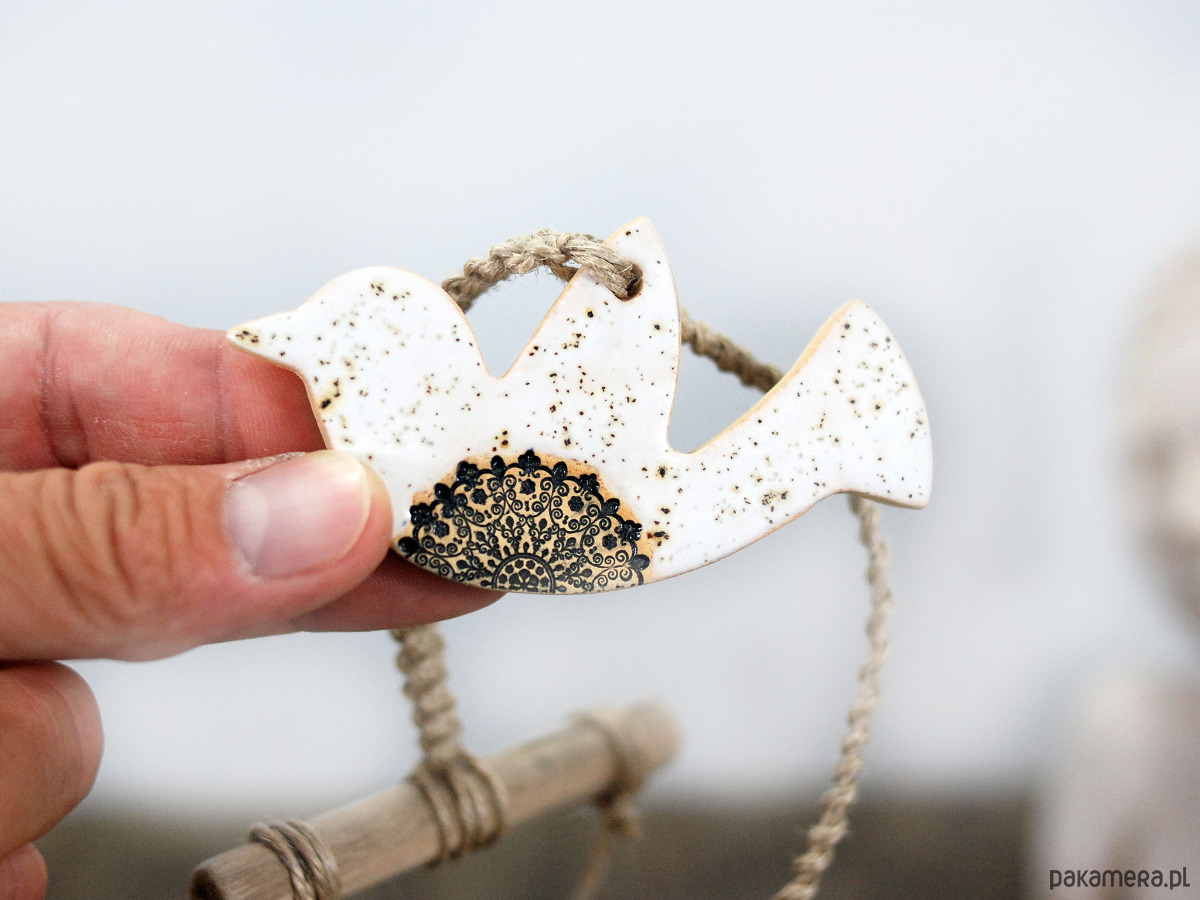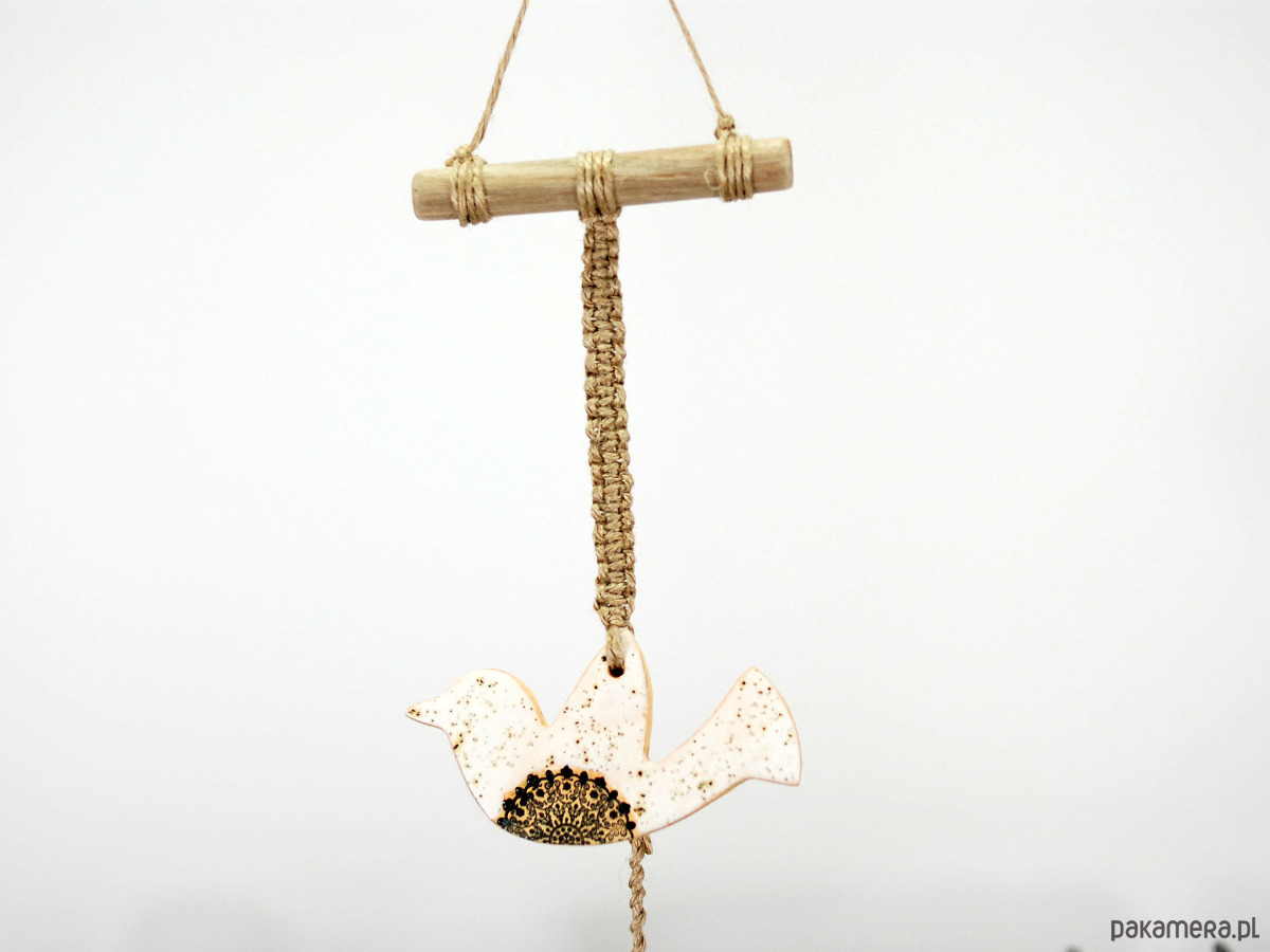Ręcznie wykonana dekoracja składa się z ceramicznego ptaszka zdobionego motywem mandali oraz dzwonka, zawieszonych na naturalnej gałązce za pomocą plecionych sznurków macrame.