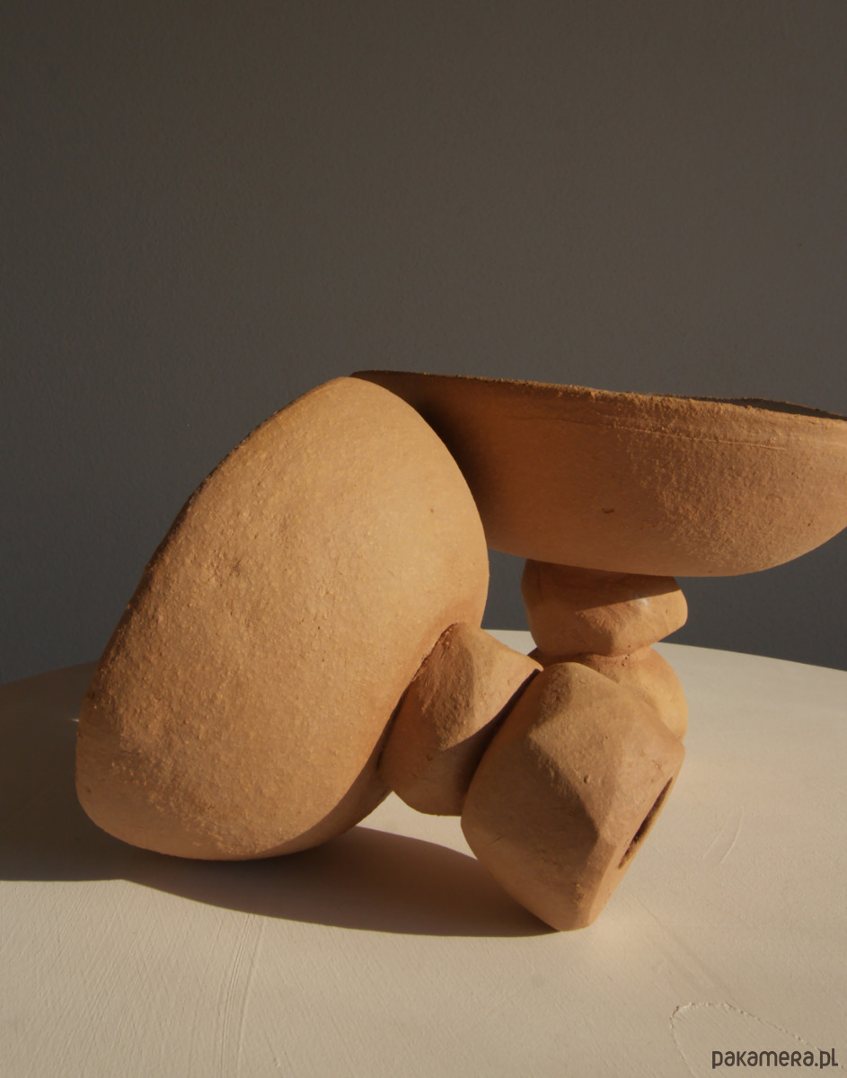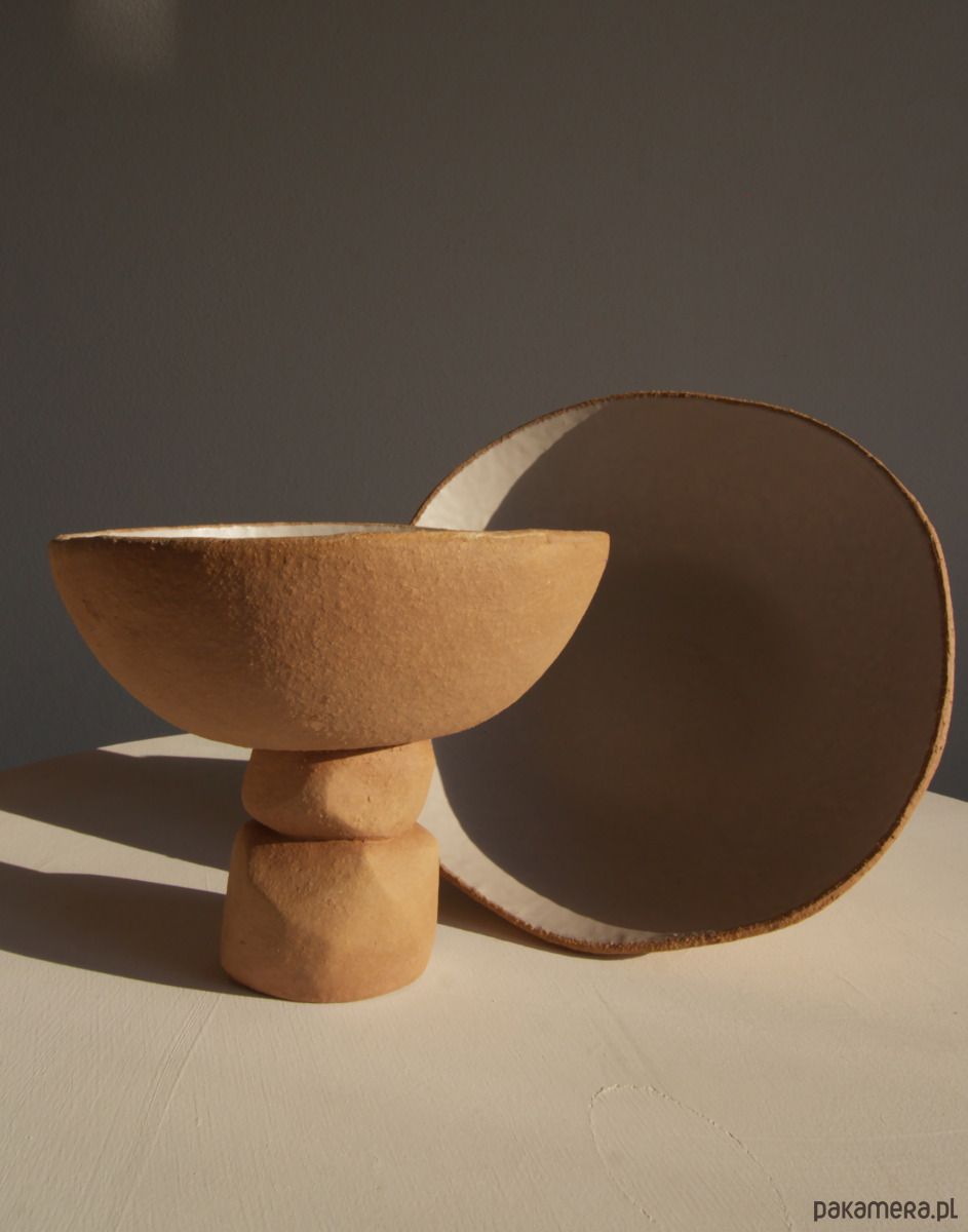 Unikatowa ceramiczna misa na nóżce, w której kontrast materiałów i faktur tworzy spokojną, naturalną całość. Wnętrze misy pokryte jest białym, matowym szkliwem, miękkim wizualnie i subtelnym w odbiorze. Zewnętrzna powierzchnia pozostaje nieszkliwiona, ukazując naturalną glinę o ciepłym, brązowym odcieniu i surowej, organicznej strukturze.