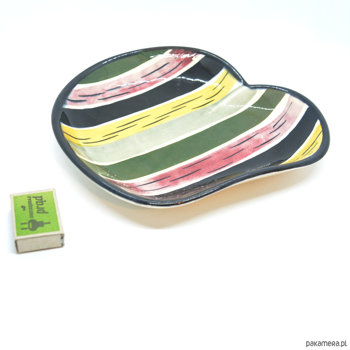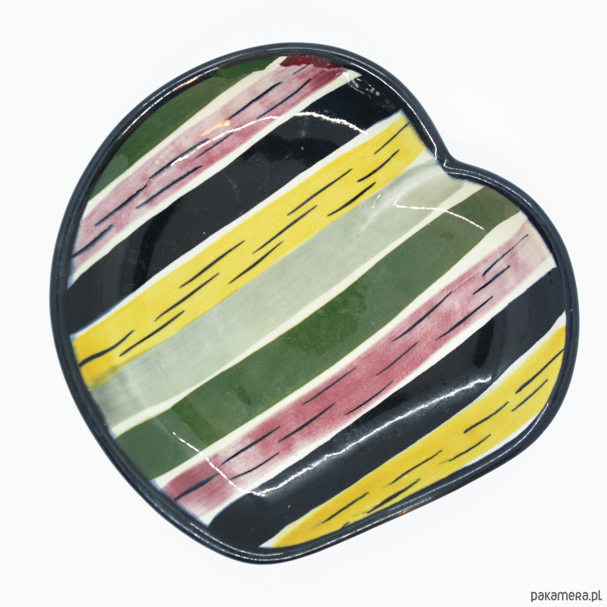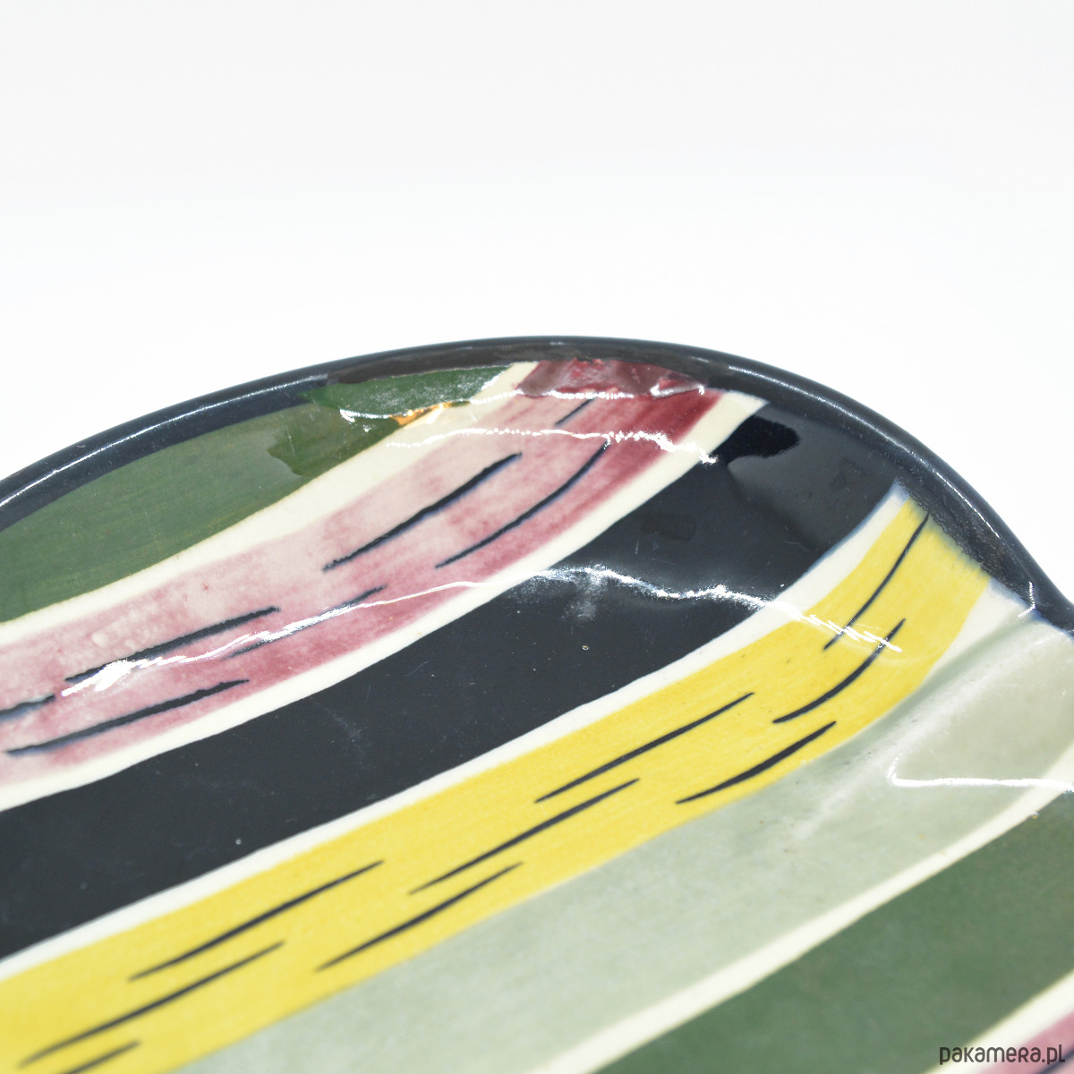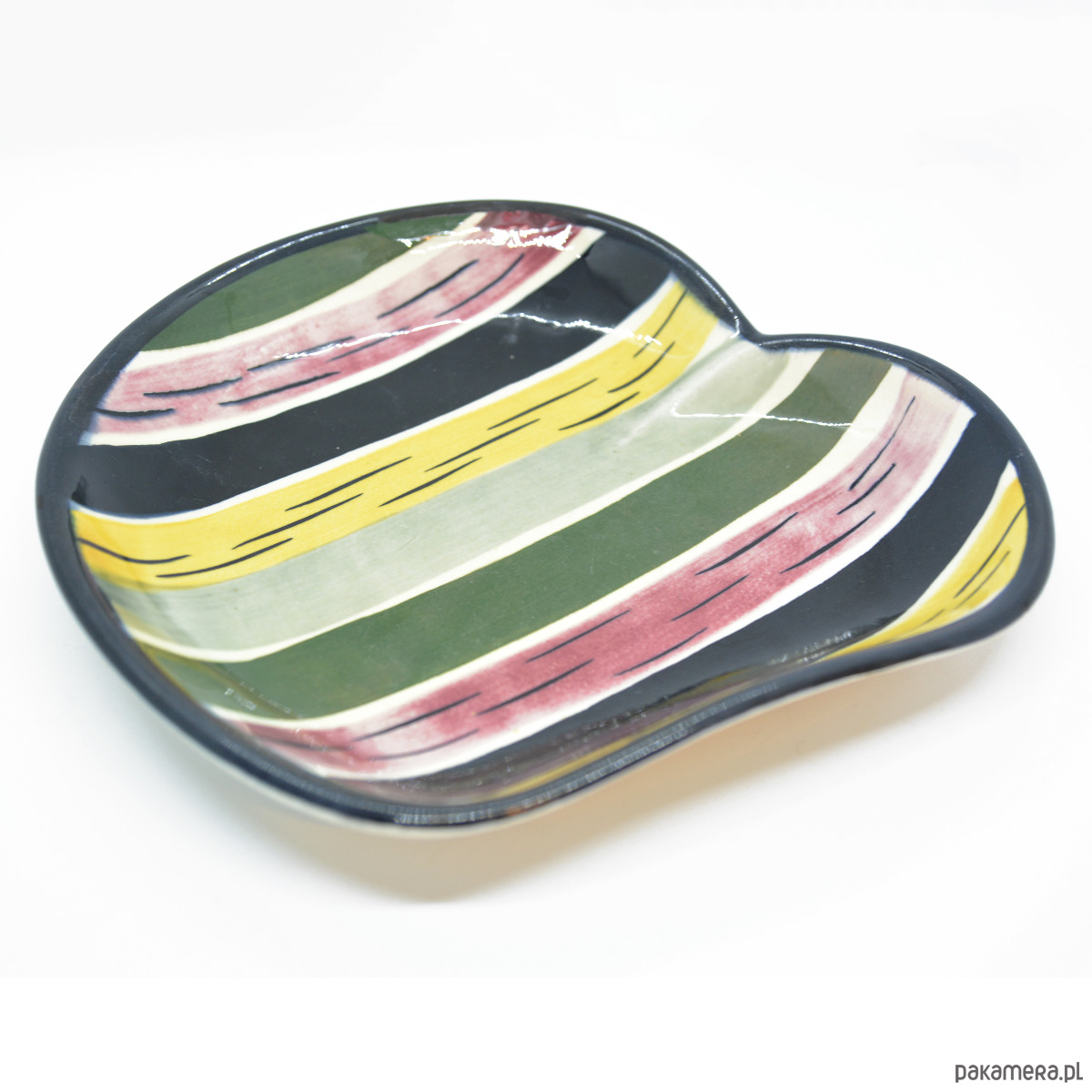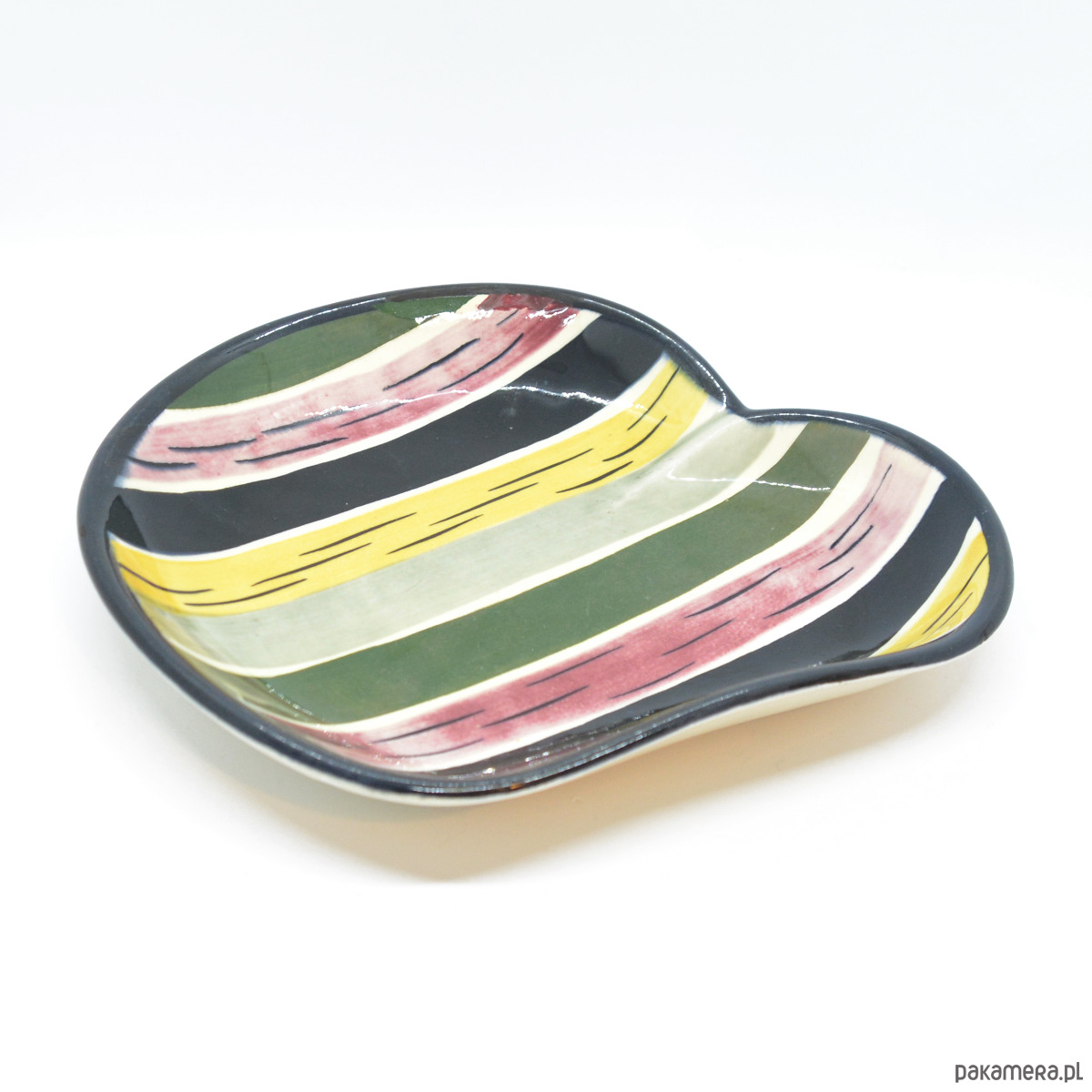 Ceramiczna patera na owoce wyprodukowana przez firmę Strehla na przełomie lat 60. i 70. w Niemczech Wschodnich. Patera o pięknej ręcznie wykonanej malaturze w stylu picasso modern. Patera w stanie bardzo dobrym, brak uszkodzeń, niewielkie ślady użytkowania. Przedmiot od sygnowana od spodu Strehla Import.Wymiary: wysokość 4 cm | szerokość 23 cm | głębokość 24 cm | średnica podstawy 11,5 cm