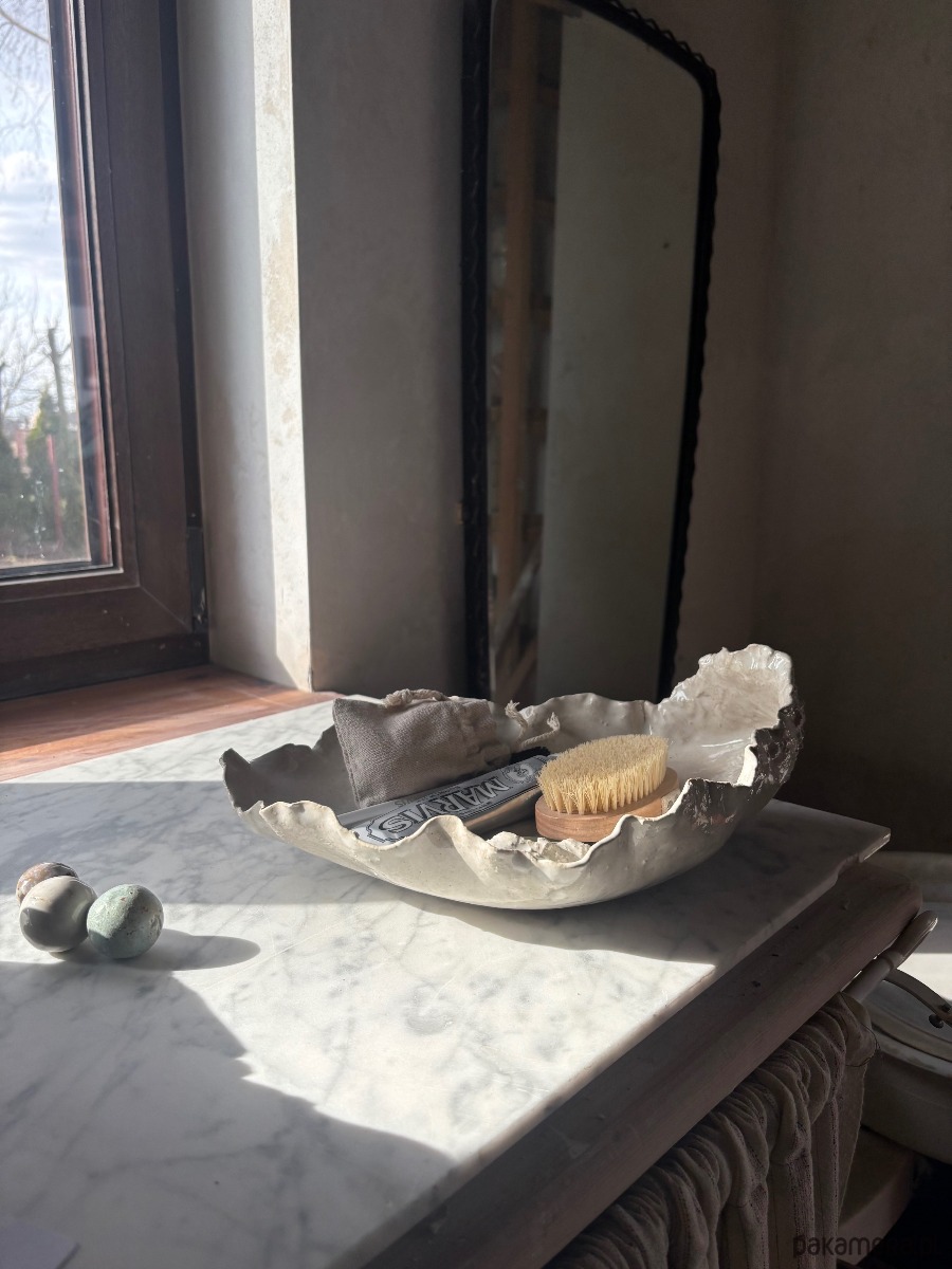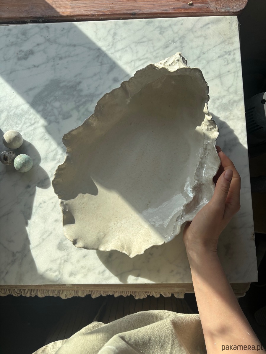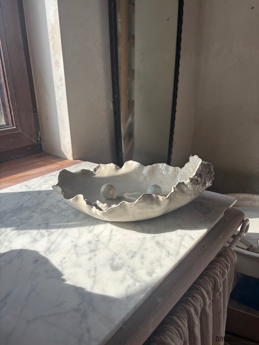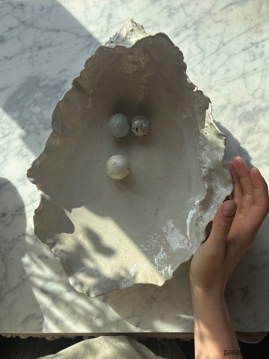 Ceramiczna, unikatowa, ręcznie stworzona patera w kształcie ostrygi. Idealna na sushi, sałaty, przekąski, drobiazgi lub jako widowiskowy element dekoracyjny przestrzeni. Organiczność, surowość, a jednocześnie elegancja obiektu sprawiają, że wprowadza ona do wnętrza harmonię i świeny design.