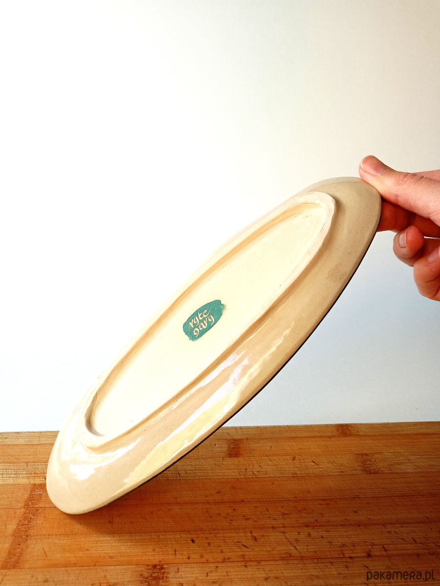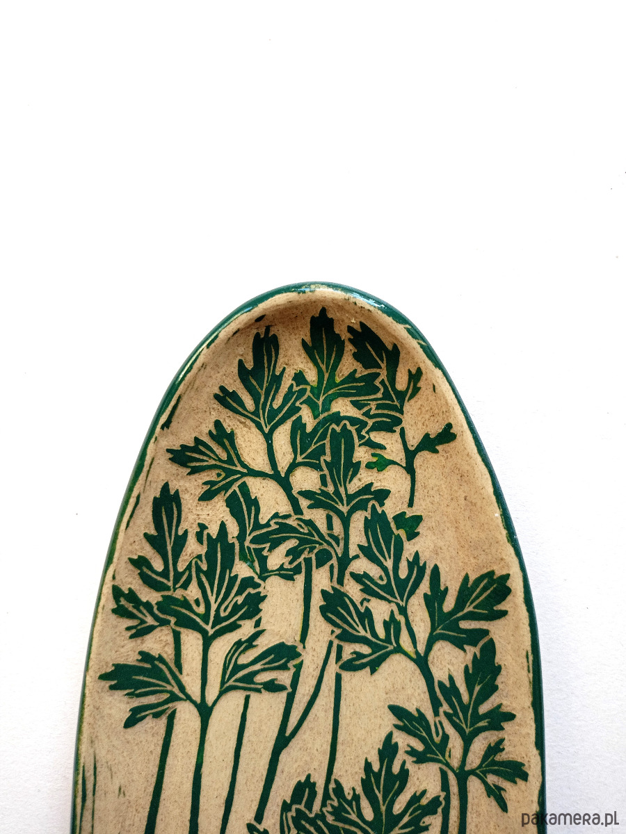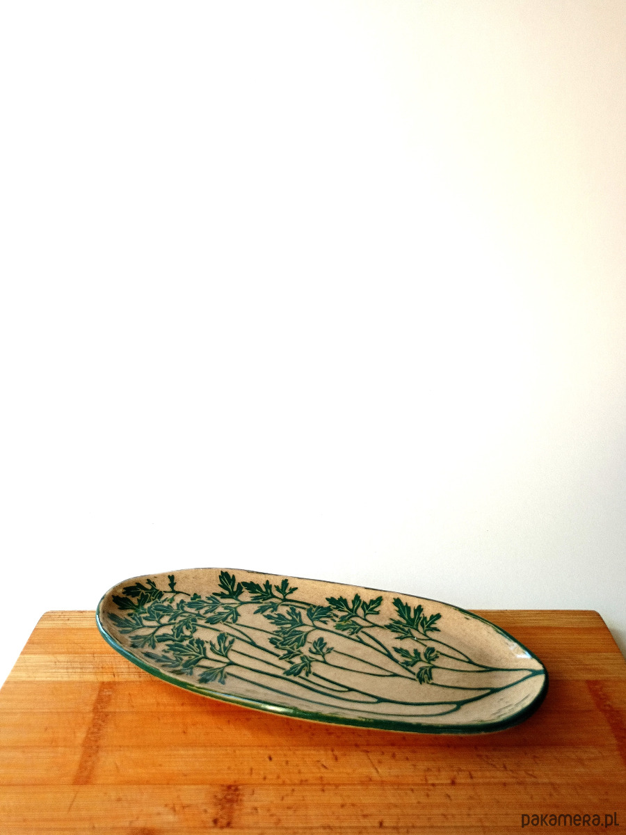 Patera o wydłużonym, owalnym kształcie ozdobiona motywem liści natki pietruszki. Bo czasem najpiękniejsze rzeczy są tuż obok nas (i więdną w lodówce).