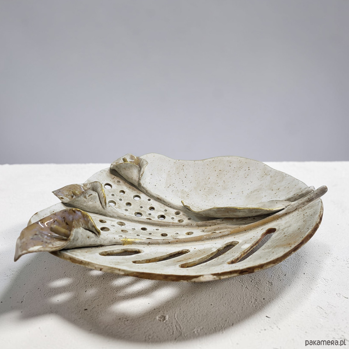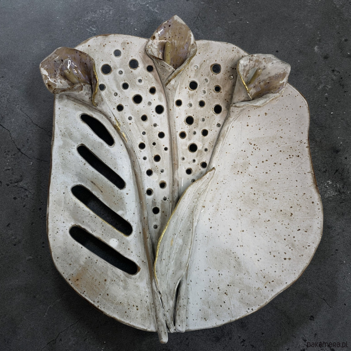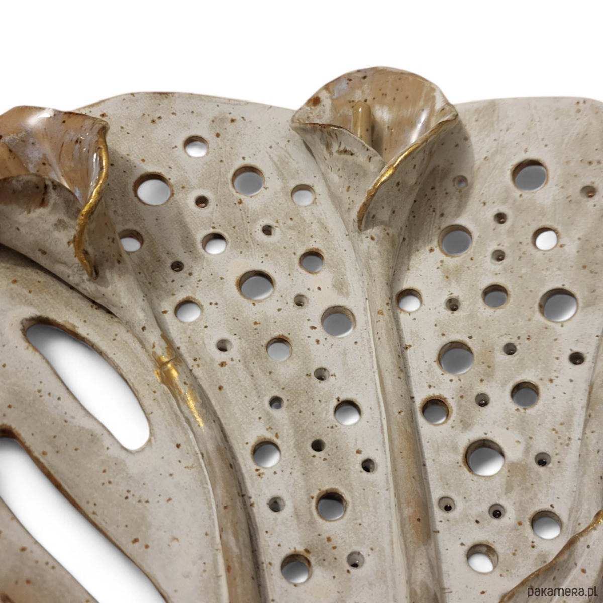 Bogata faktura, ażurowe detale i subtelne szkliwienia tworzą dynamiczną, organiczną kompozycję. Złote akcenty oraz element kintsugi podkreślają unikatowy charakter pracy.