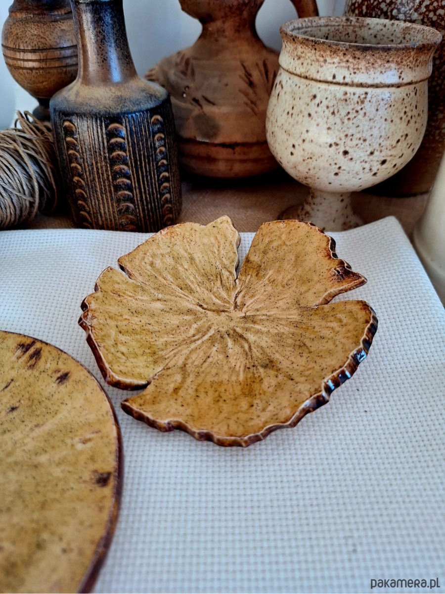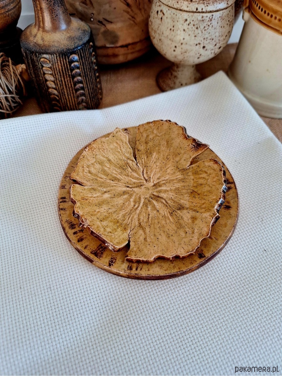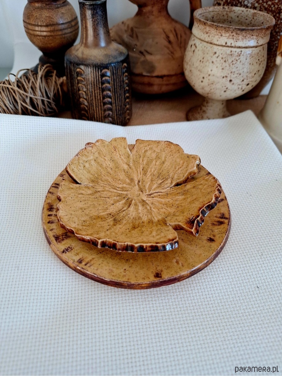 Komplet ceramiczny obejmujący dwie podstawki, mogą funkcjonować odzielnie lub jako kompatybilny zestaw. Pierwszy wiekszy stanowi okrągły talerzyk, drugi przypomina kwiat. Przeznaczenie różnorodne: podstawki na biżuterię, klucze, świeczki czy kadzidła i palo santo. Ozdoba ręcznie formowana i szkliwiona w kolorze miodowym z miescowymi ciemniejszymi brązowymi przebłyskami. Drobny unikatowy prezent dla miłośniczki oryginalnej ceramiki.