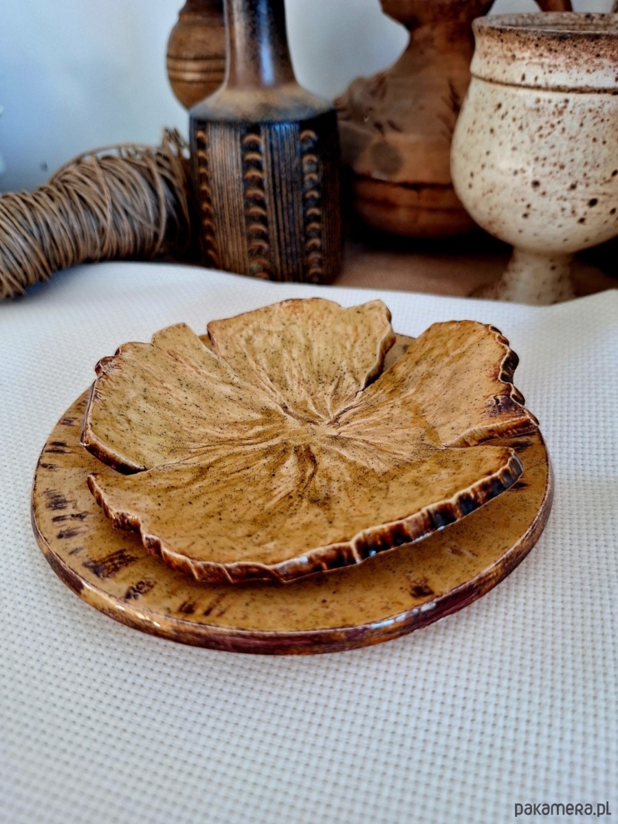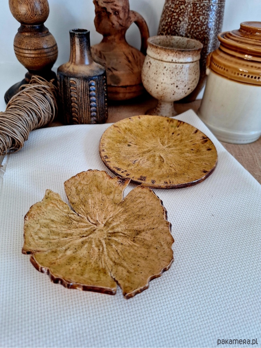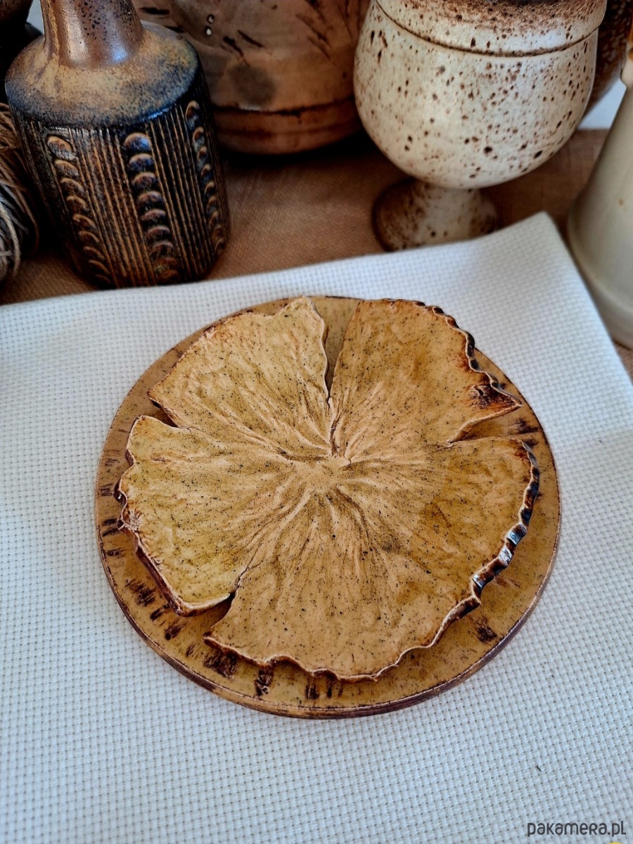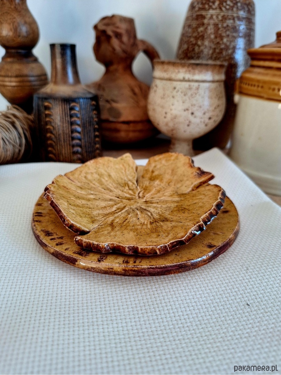 Komplet ceramiczny obejmujący dwie podstawki, mogą funkcjonować odzielnie lub jako kompatybilny zestaw. Pierwszy wiekszy stanowi okrągły talerzyk, drugi przypomina kwiat. Przeznaczenie różnorodne: podstawki na biżuterię, klucze, świeczki czy kadzidła i palo santo. Ozdoba ręcznie formowana i szkliwiona w kolorze miodowym z miescowymi ciemniejszymi brązowymi przebłyskami. Drobny unikatowy prezent dla miłośniczki oryginalnej ceramiki.