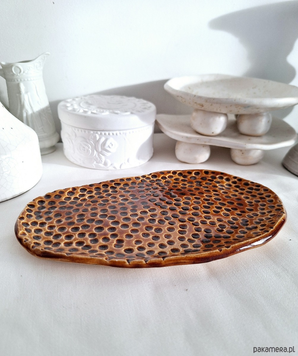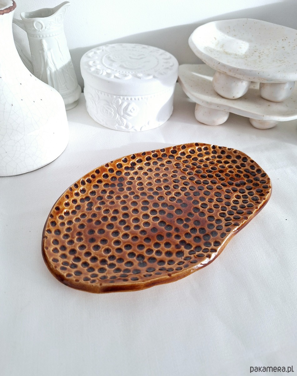Ceramiczna podstawka na biżuterię, świece, klucze, okulary, kadzidła i palo santo. Ozdoba ręcznie formowana i szkliwiona. Piękny bursztynowy błyszczący kolor z charakterystycznymi żłobieniami z ciemniejszym szkliwem. Drobny unikatowy prezent dla miłośniczki biżuterii.