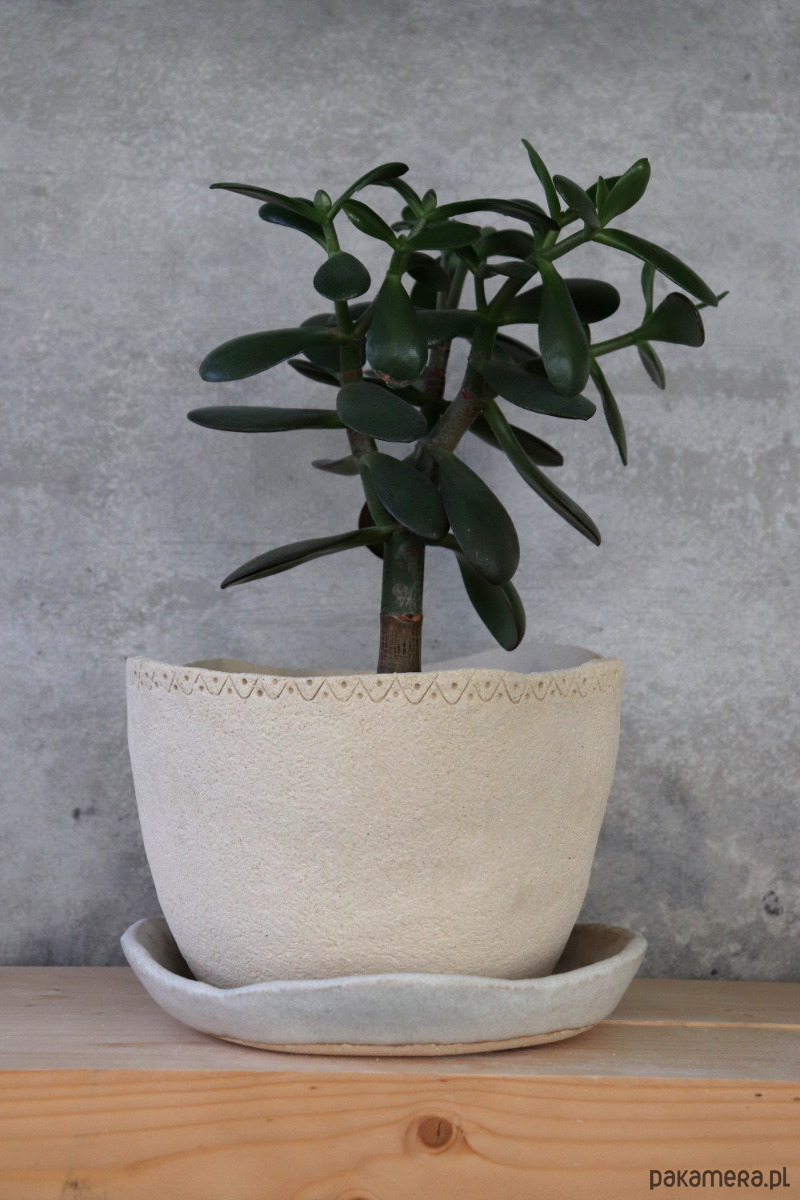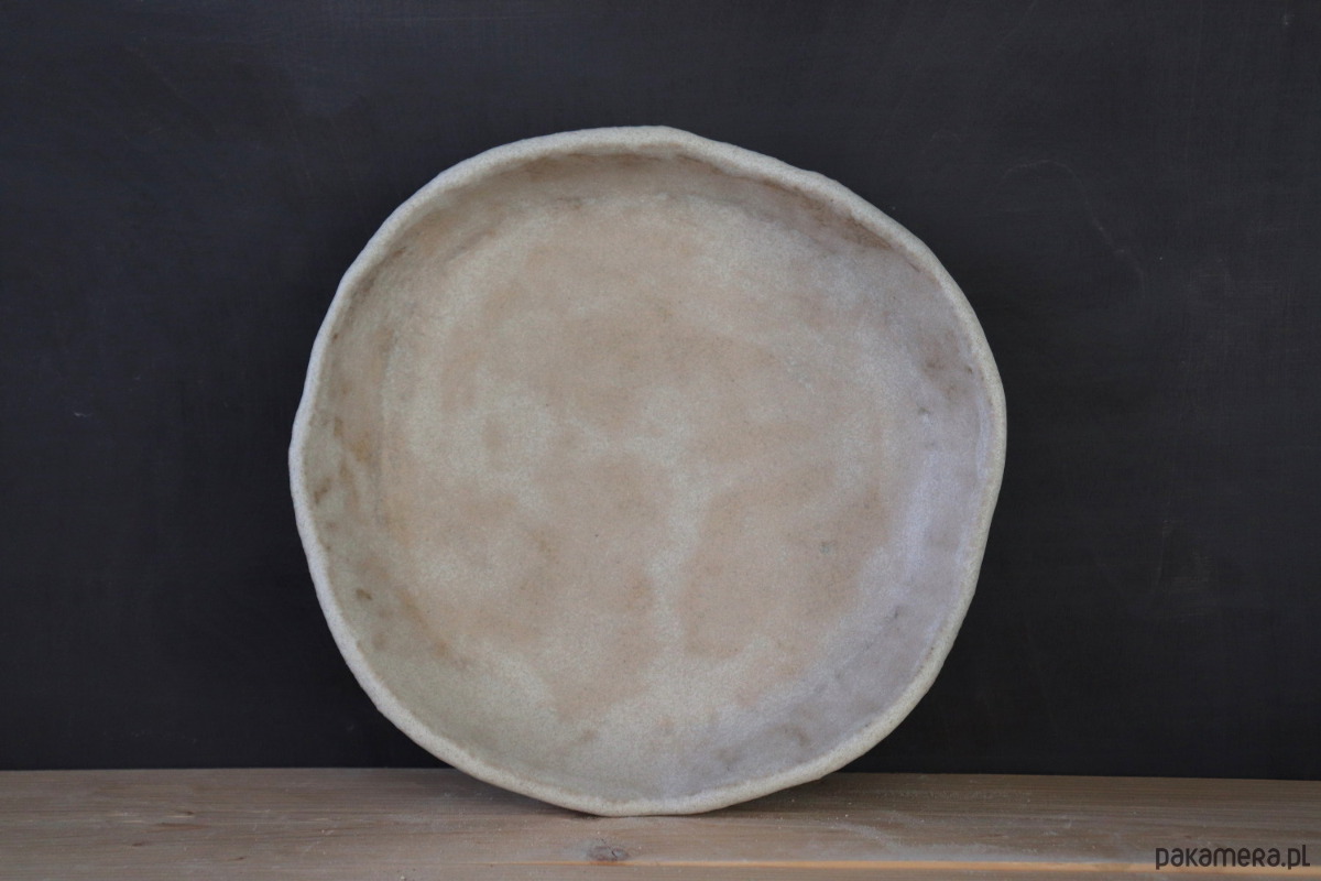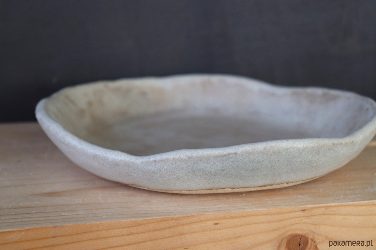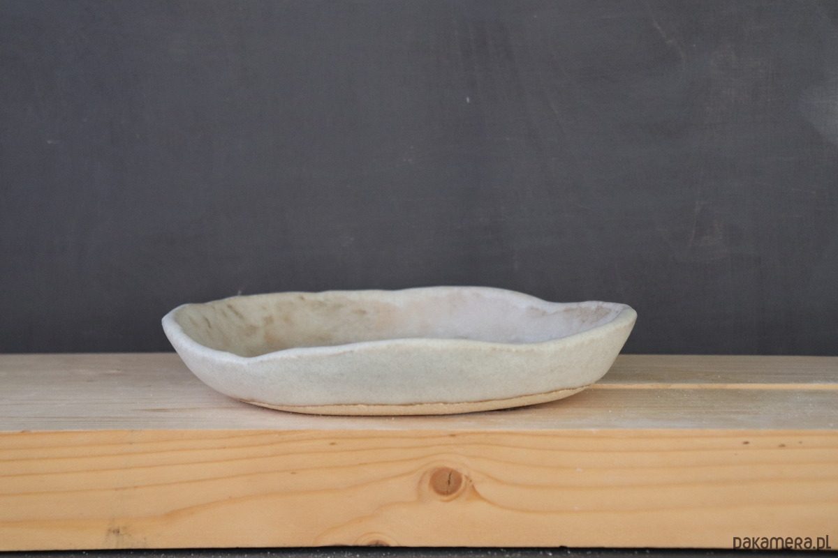 Podstawka do doniczki wykonana z jasnokremowej gliny, pokryta biało-beżowym szkliwem. Podstawka może być też używana jako talerz, miseczka lub patera, ponieważ użyte szkliwa nadają się do kontaktu z żywnością. Naczynie zostało wykonane ręcznie, bez użycia koła garncarskiego.