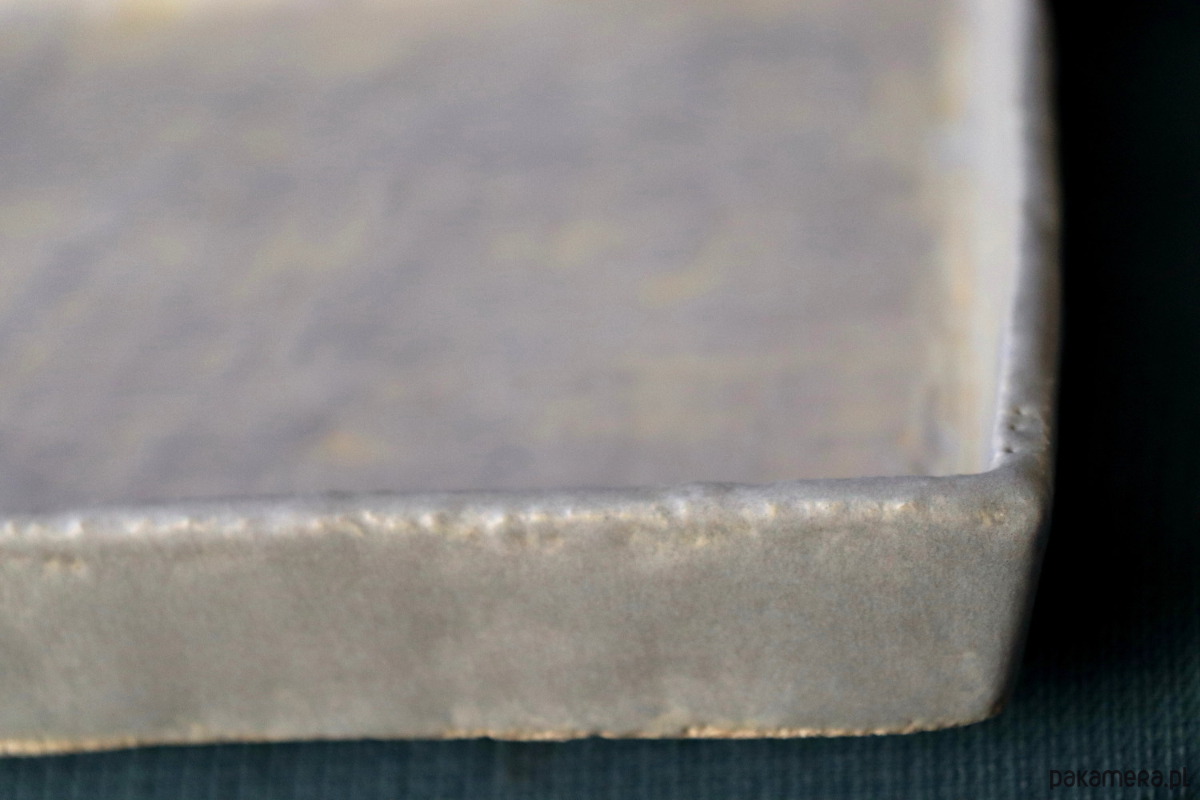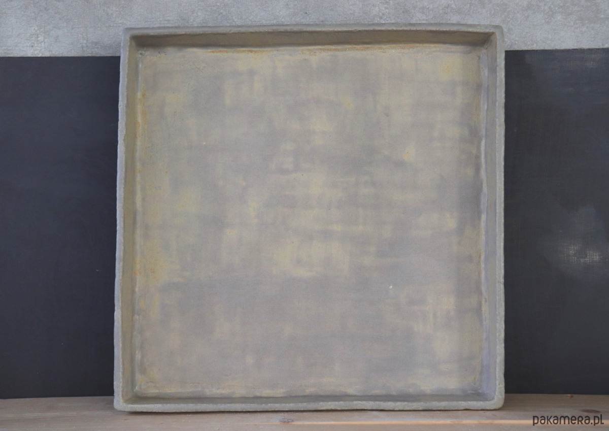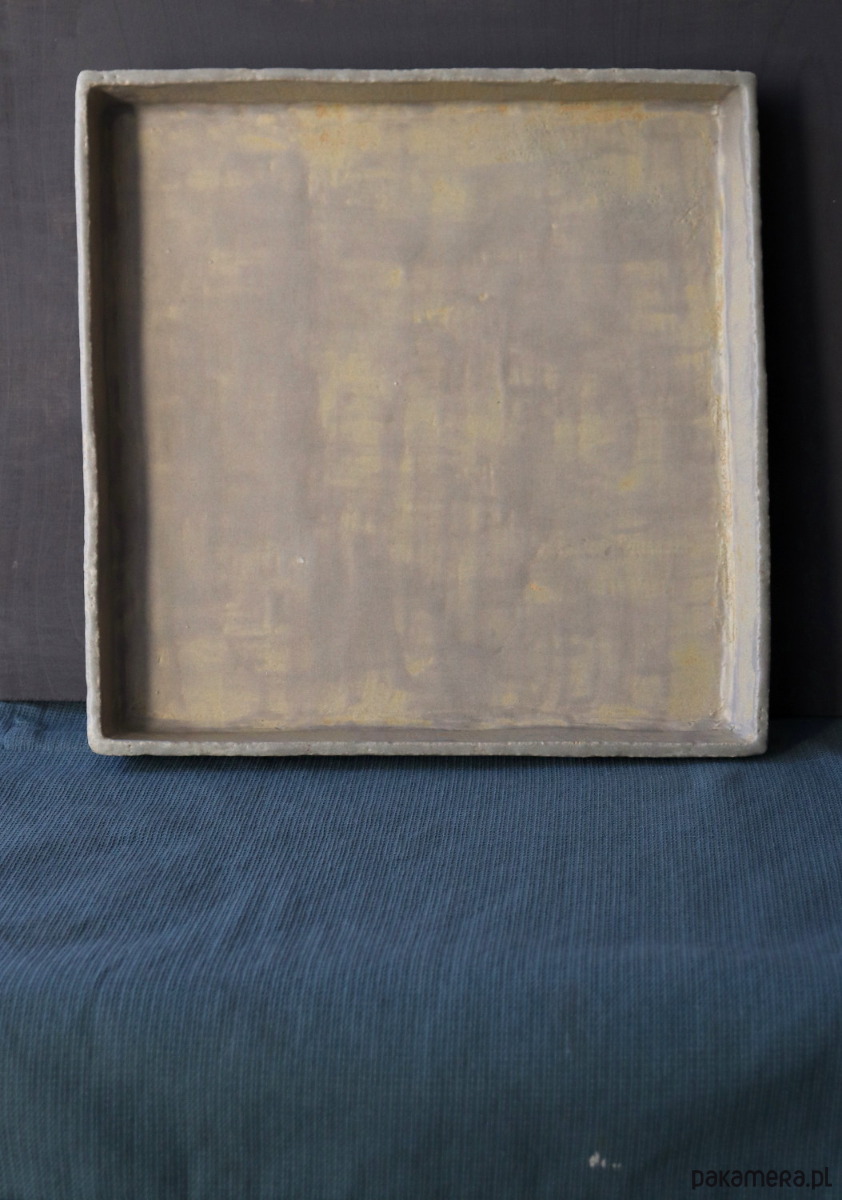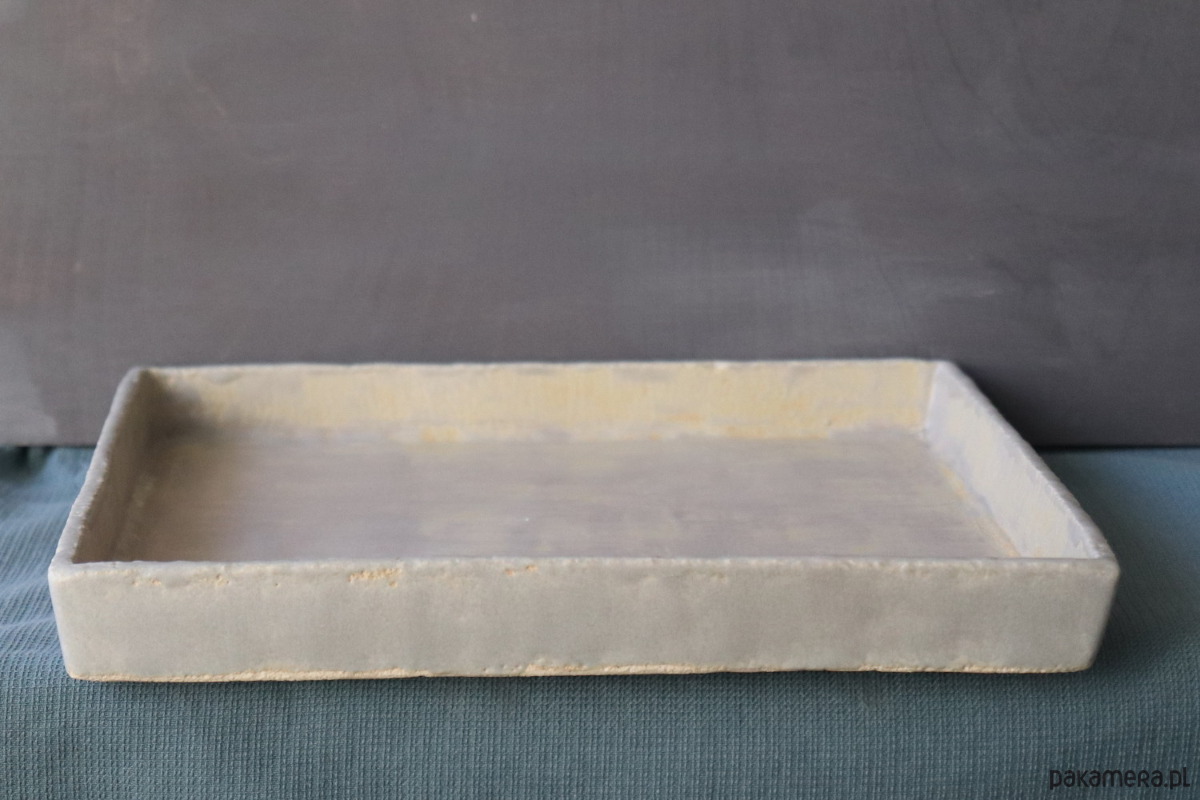 Podstawka do doniczki wykonana z jasnokremowej gliny, pokryta jasnoszarym szkliwem z delikatnymi jasnobeżowymi przebarwieniami (szczególnie w środku podstawki).