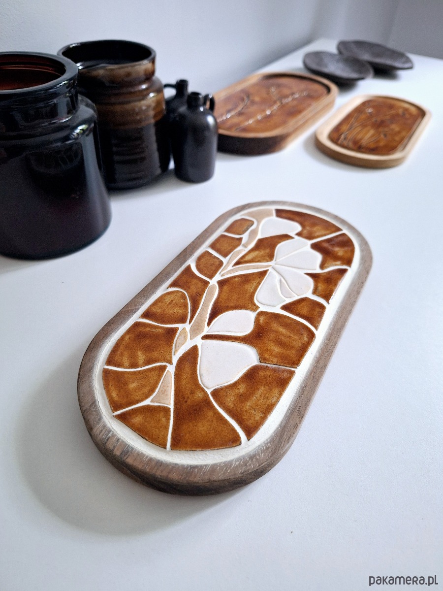 Ceramiczna podstawka na biżuterię, świece, klucze, okulary, kadzidła i palo santo. Może również stanowić piekną dekorację ścienną. Ozdoba stanowi mozaikę ręcznie formowaną, komponowaną i szkliwioną w kolorach bieli i bursztynu. Elementy ceramiczne umieszczone są w drewnianej podstawie z drzewa akacjowego. Piękny unikatowy prezent dla miłośników ceramiki i mozaiki.