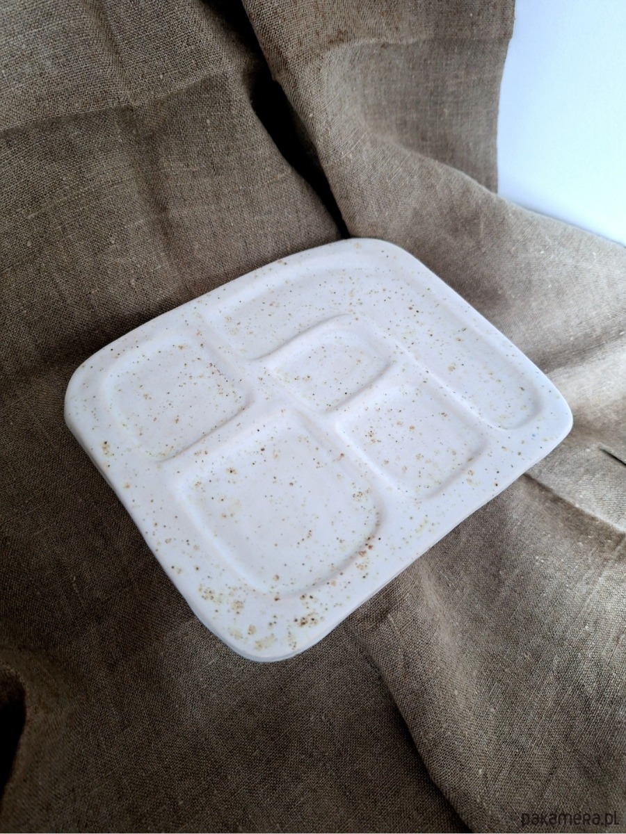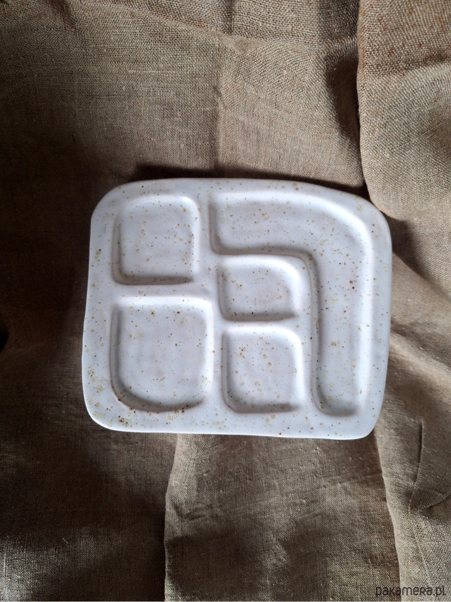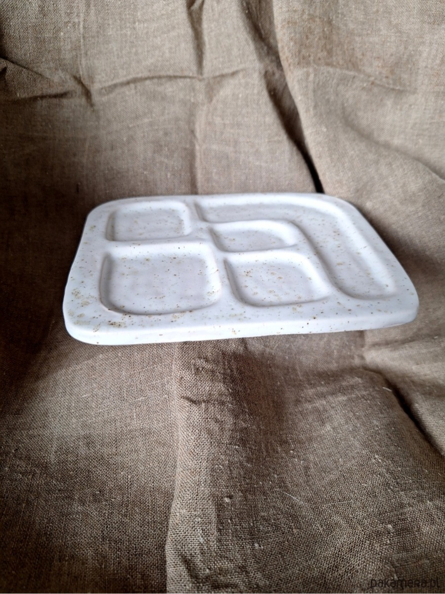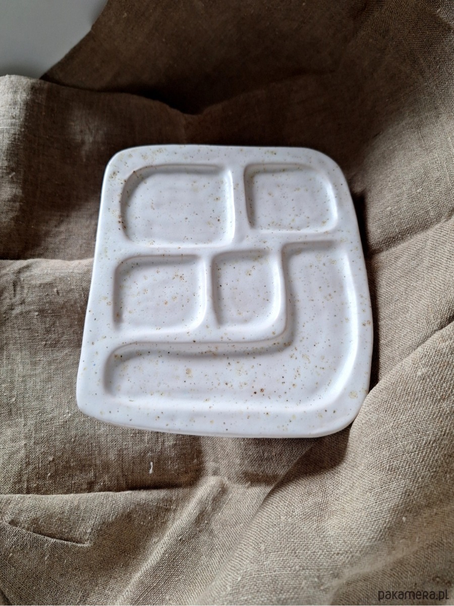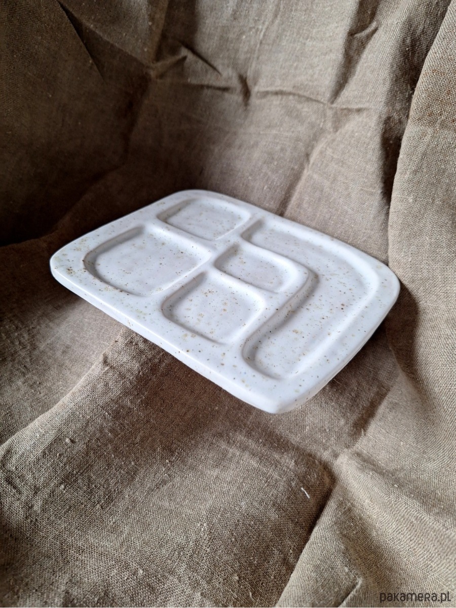 Ceramiczna podstawka dekoracyjna przeznaczona na biżuterię i drobne przedmioty. Może być również wykorzystana na świeczki czy palo santo. Kształt prostokąta z wyżłobionymi przegrodami porządkującymi przestrzeń.