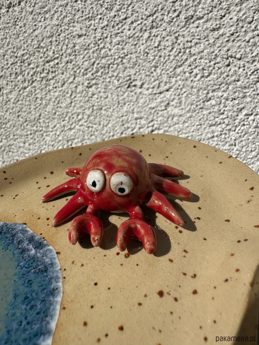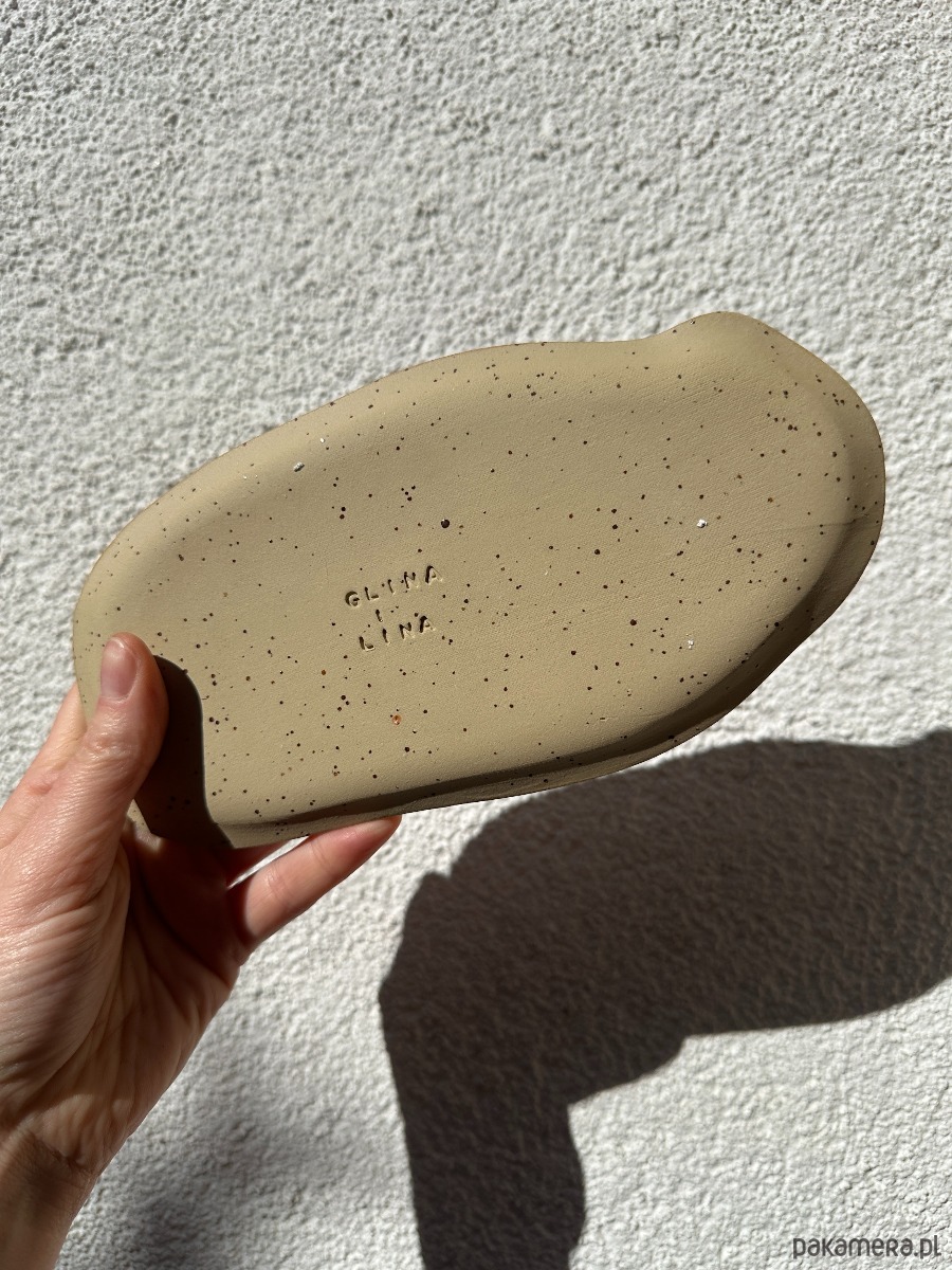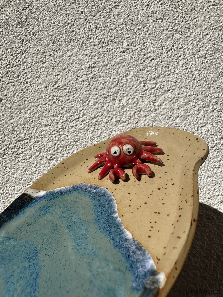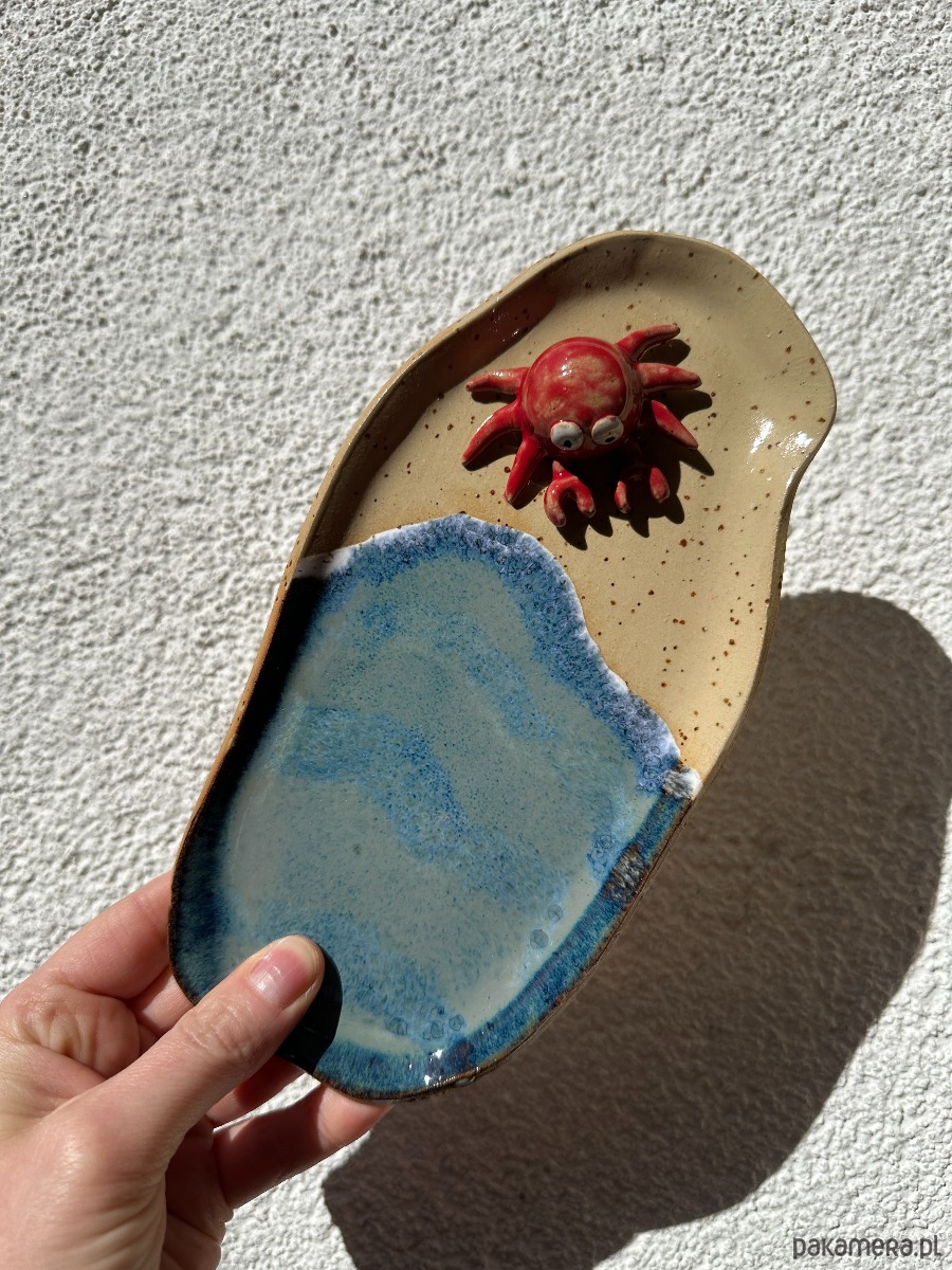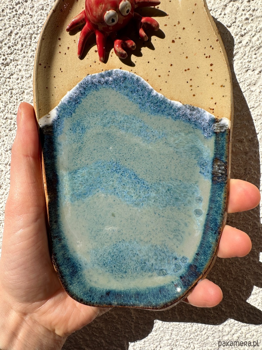 Ręcznie wykonana ceramiczna podstawka z kropkowanej gliny, inspirowana spokojem nadmorskiego krajobrazu. Połączenie piaskowego beżu z głębokim odcieniem oceanu oraz uroczy detal w postaci małego kraba tworzą wyjątkowy, niepowtarzalny charakter.