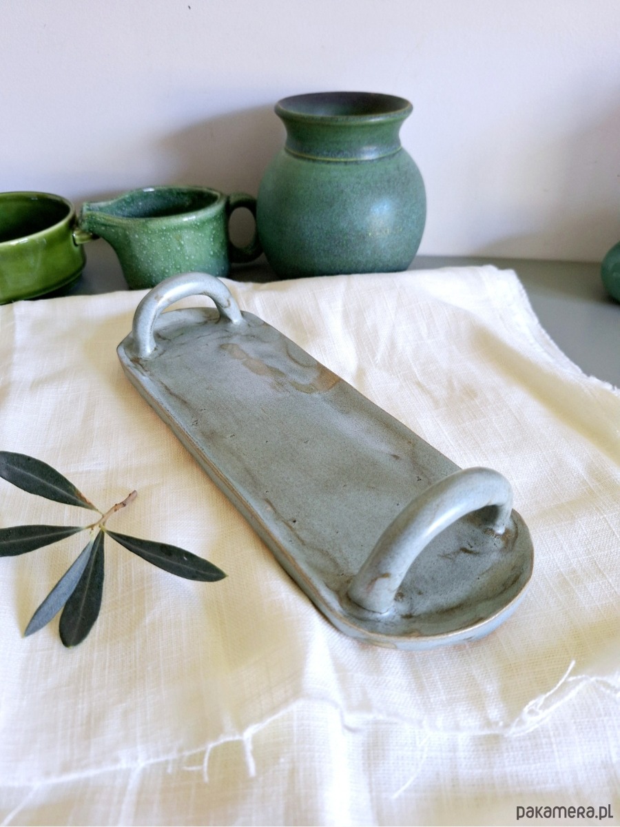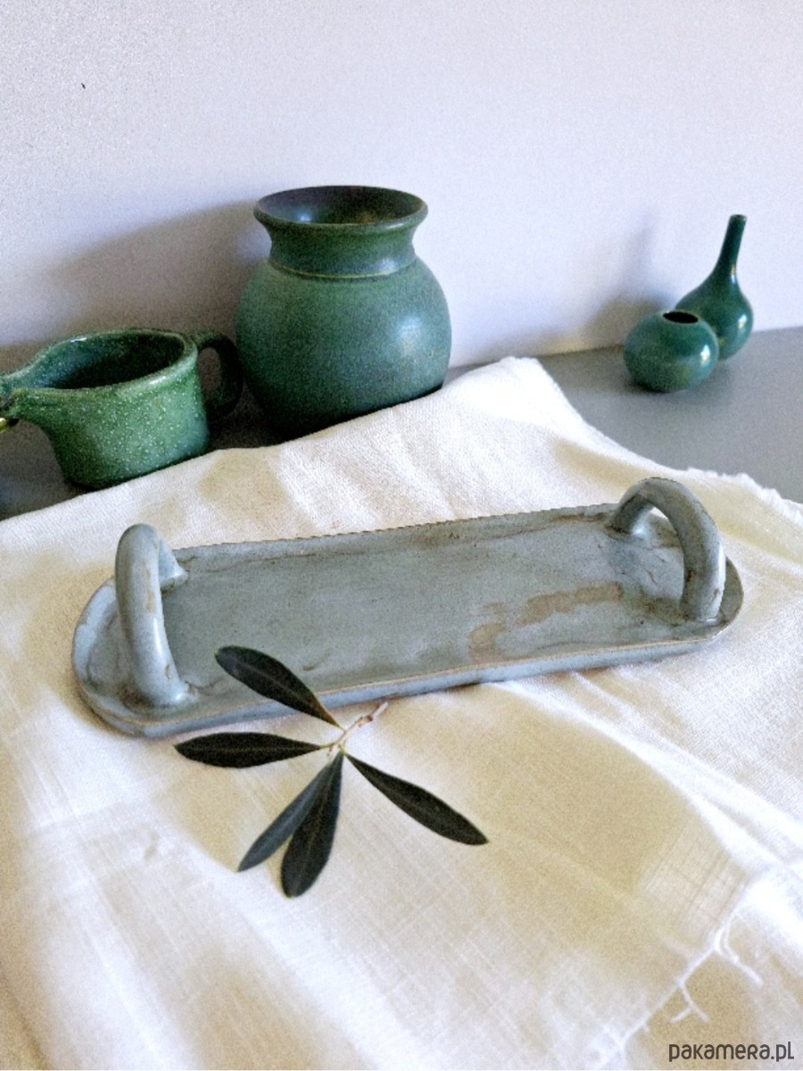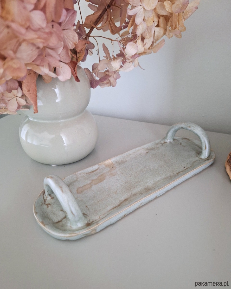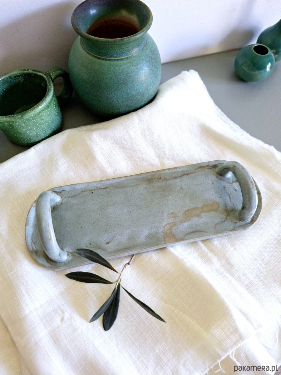 Ceramiczna podstawka dekoracyjna z uchwytami. Podstawka ręcznie formowana, w kolorze miętowo-zielonym, znakomicie sprawdzi się pod biżuterię, klucze, świeczki, kadzidło.
