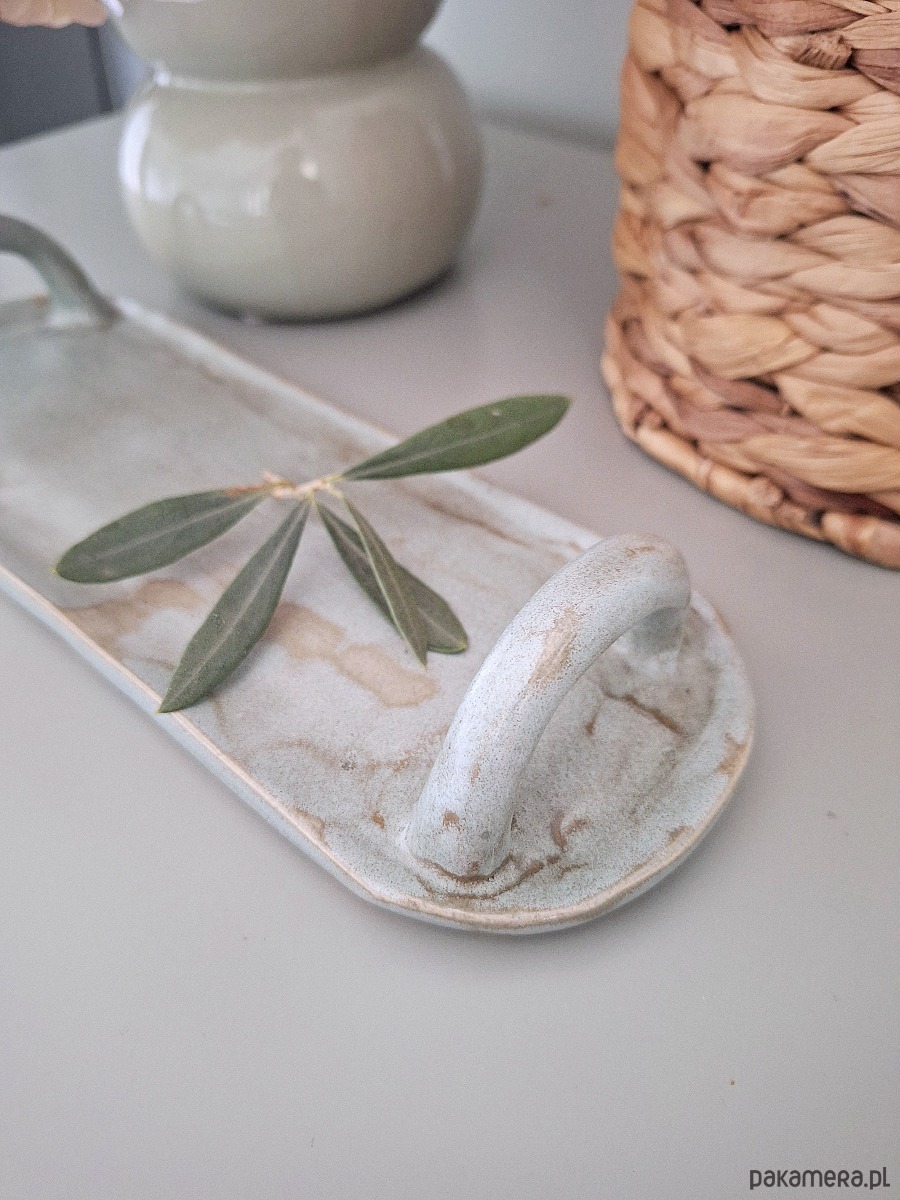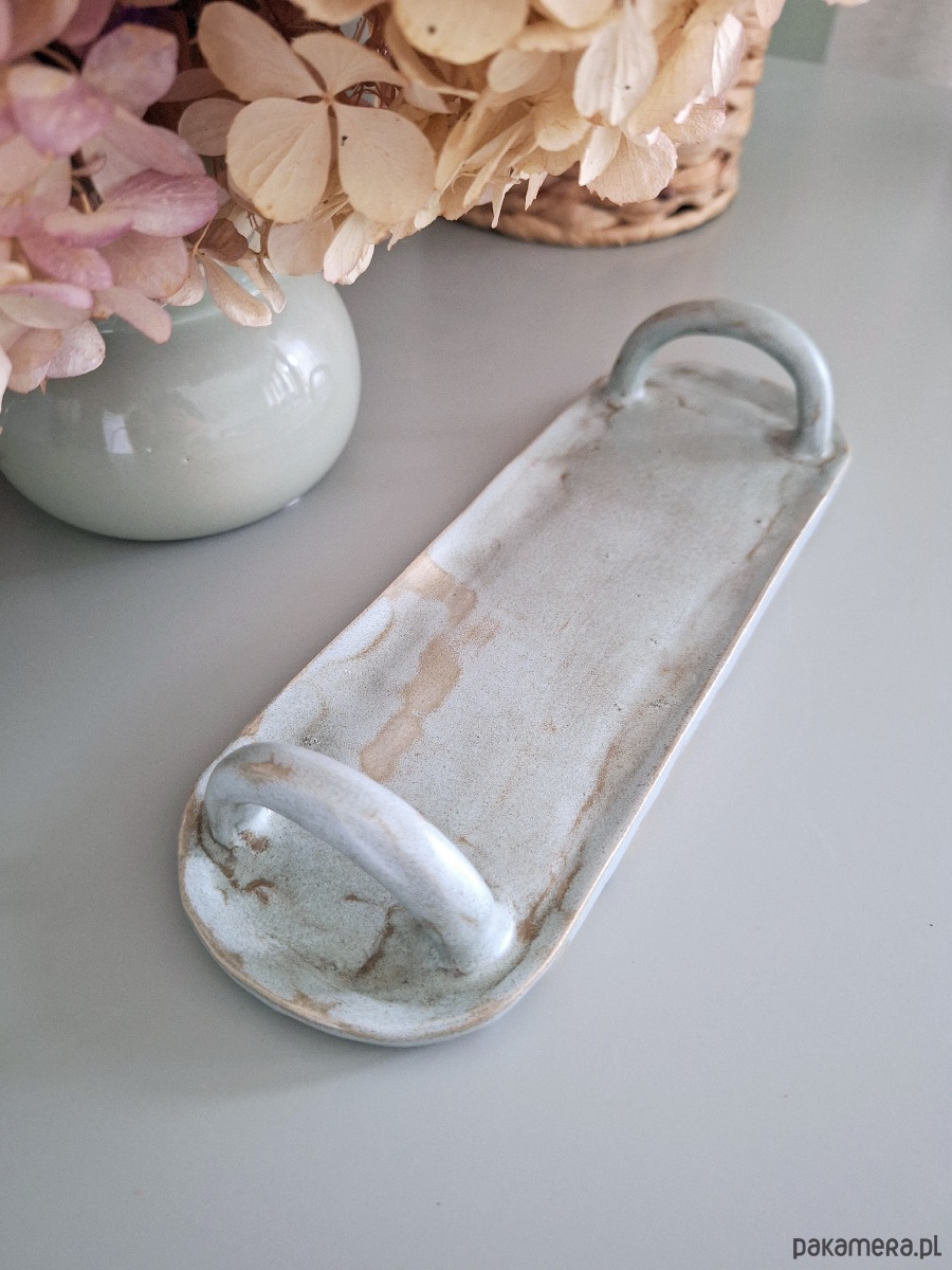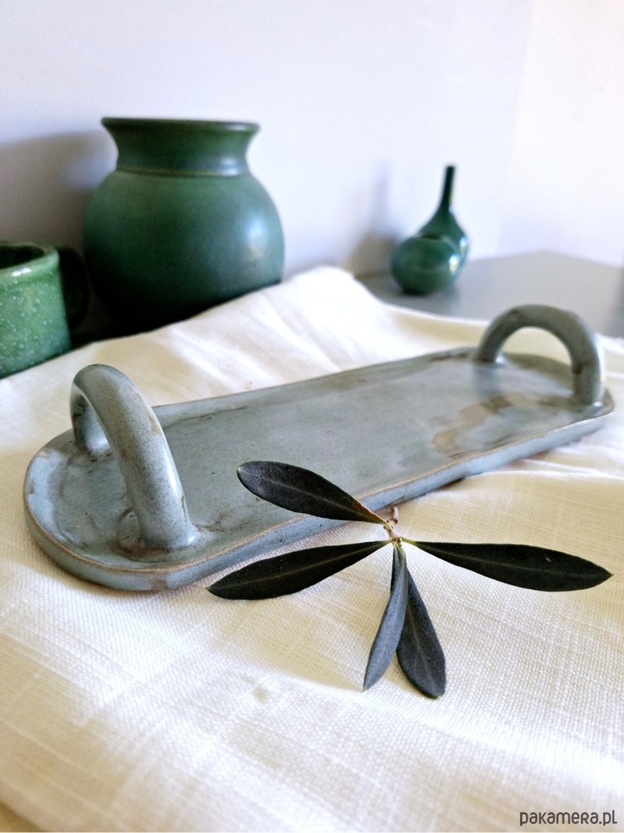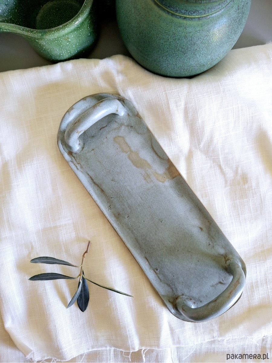 Ceramiczna podstawka dekoracyjna z uchwytami. Podstawka ręcznie formowana, w kolorze miętowo-zielonym, znakomicie sprawdzi się pod biżuterię, klucze, świeczki, kadzidło.