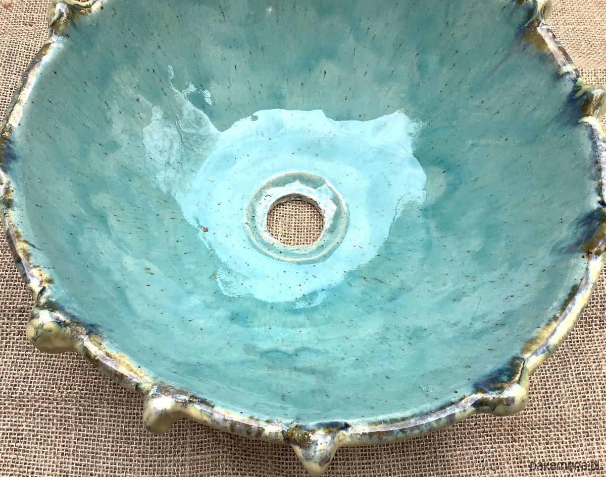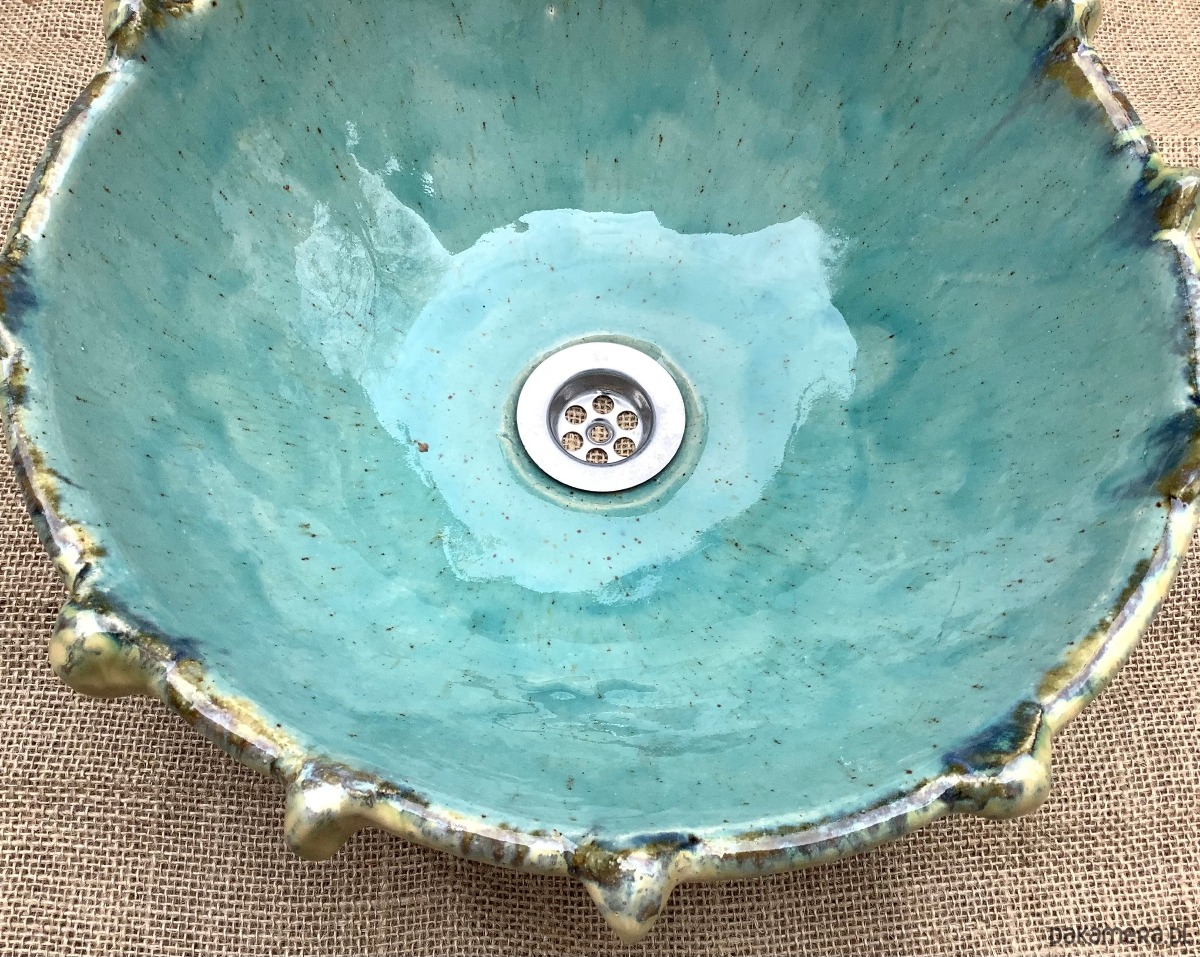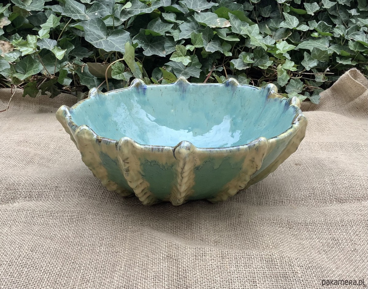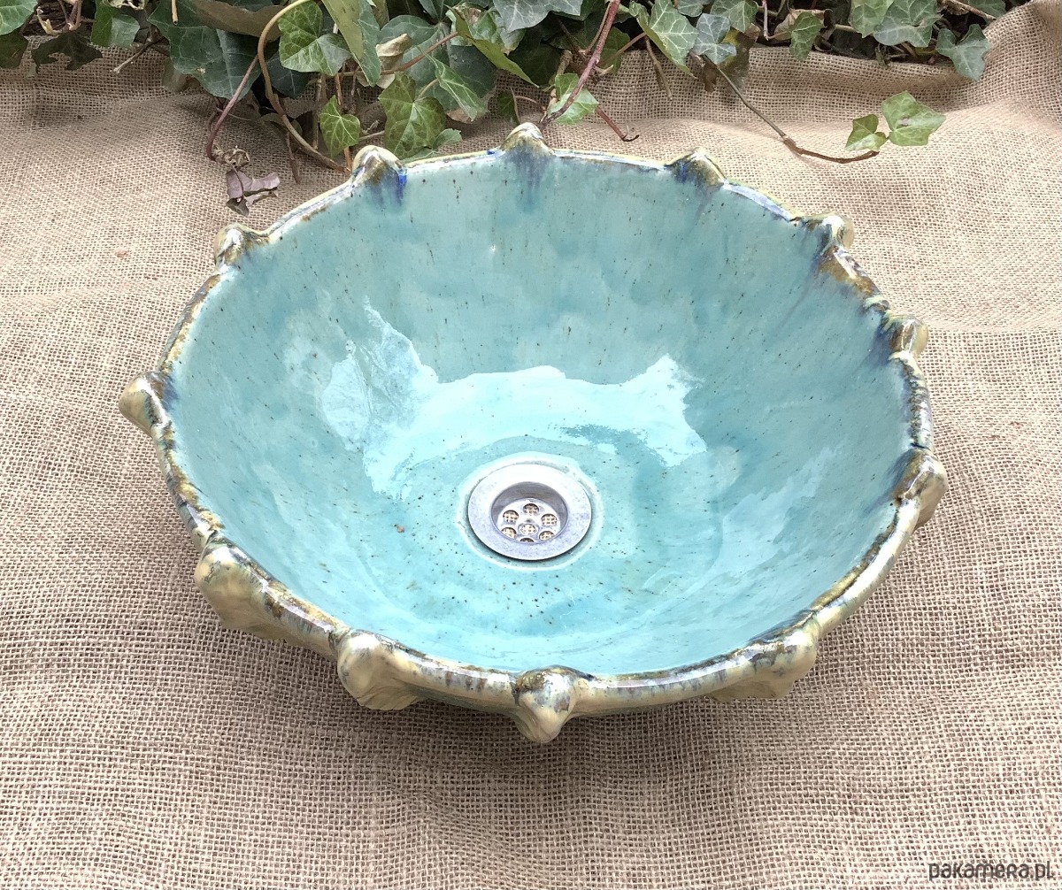 Umywalka został zrobiona na wzór jeżowca. Poszkliwiona wenątrz pięknym błękitnym szkliwem z drobniutkimi kropeczkami, na zewnątrz w odcieniu niebiesko -zielonym z beżowymiakcentami.