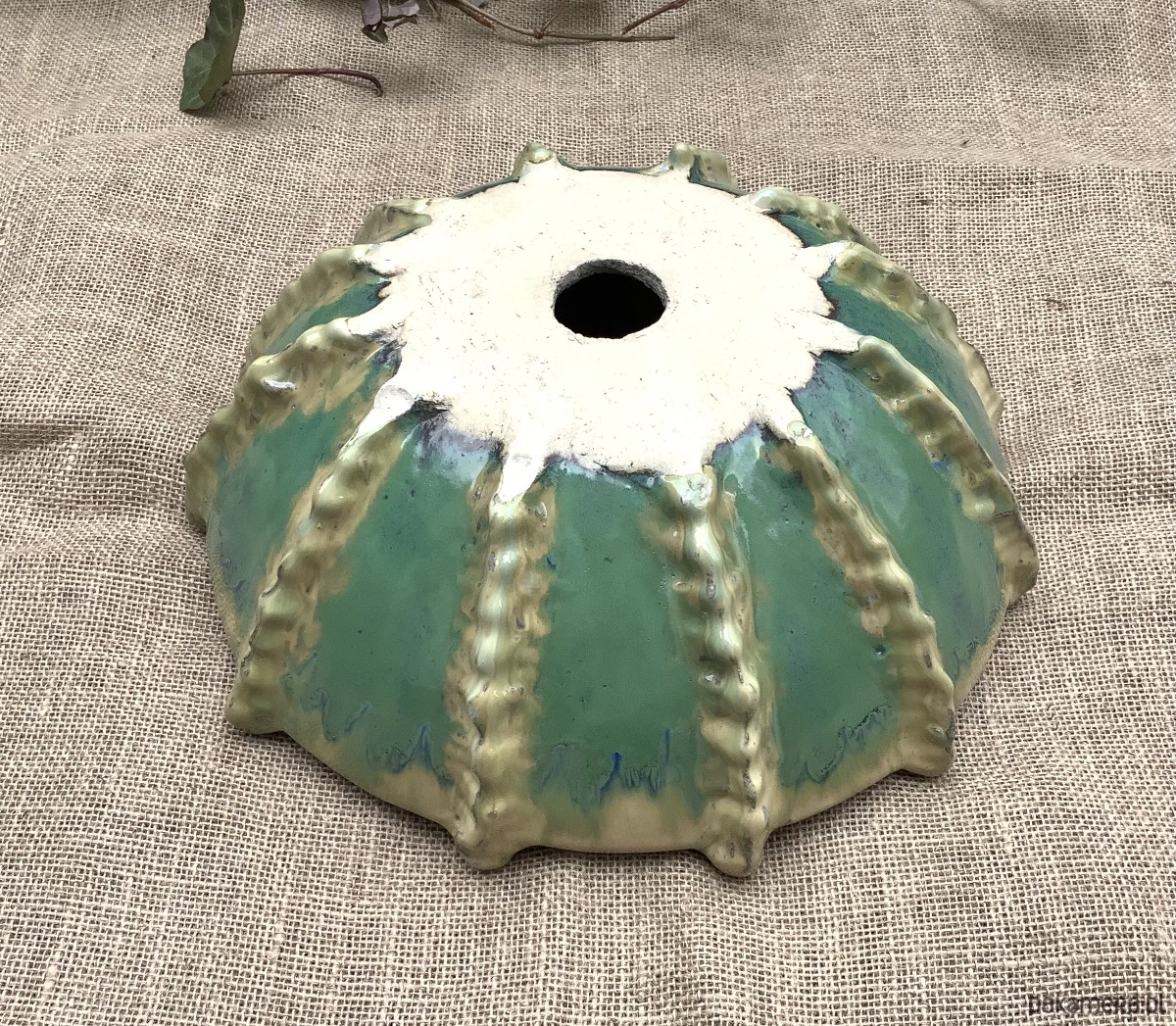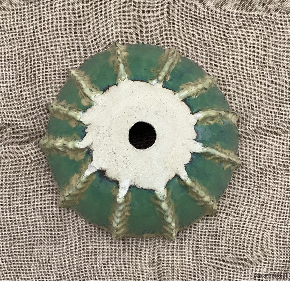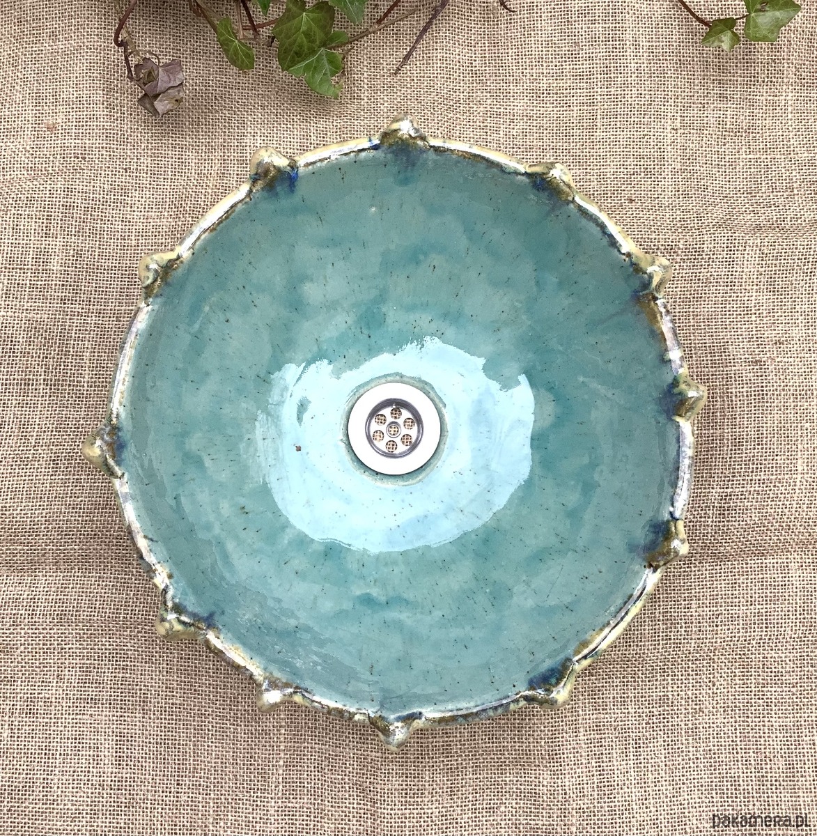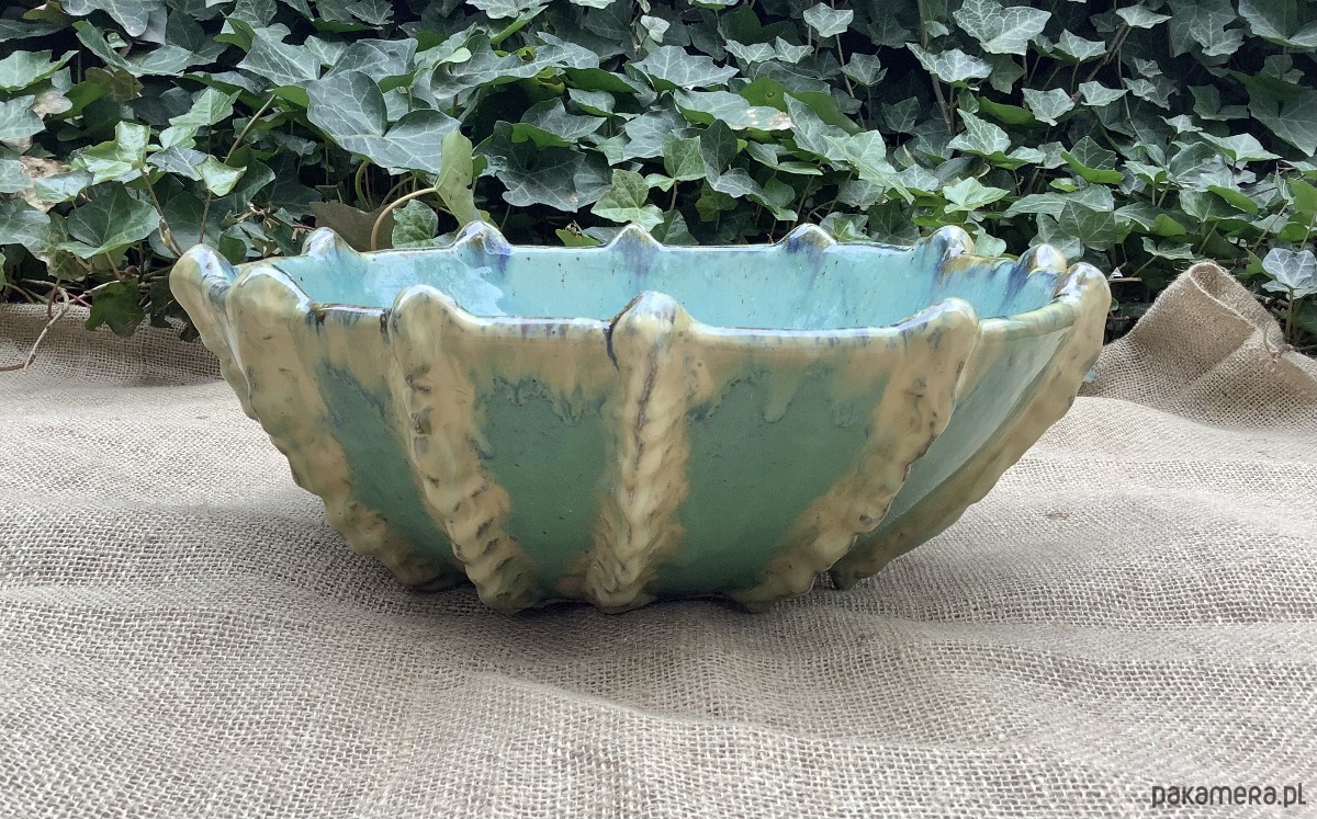 Umywalka został zrobiona na wzór jeżowca. Poszkliwiona wenątrz pięknym błękitnym szkliwem z drobniutkimi kropeczkami, na zewnątrz w odcieniu niebiesko -zielonym z beżowymiakcentami.