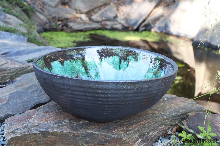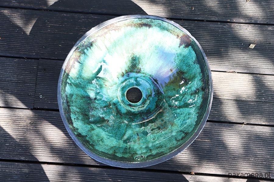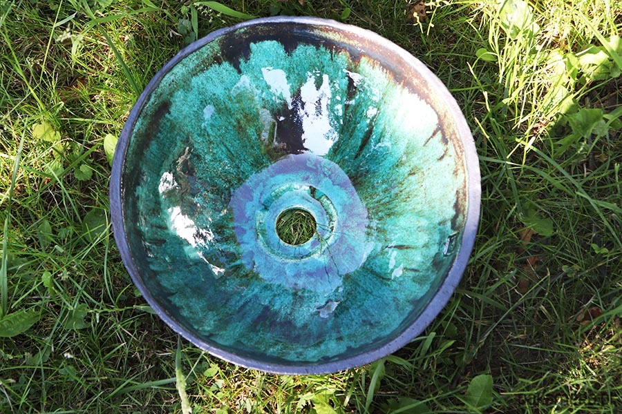 Turkusowa Funkia to ręcznie wykonana umywalka, będąca prawdziwym dziełem sztuki użytkowej. Wnętrze umywalki zdobi unikalny turkusowy kolor, nakrapiany ciemniejszymi plamkami, co nadaje jej naturalny i niepowtarzalny charakter.