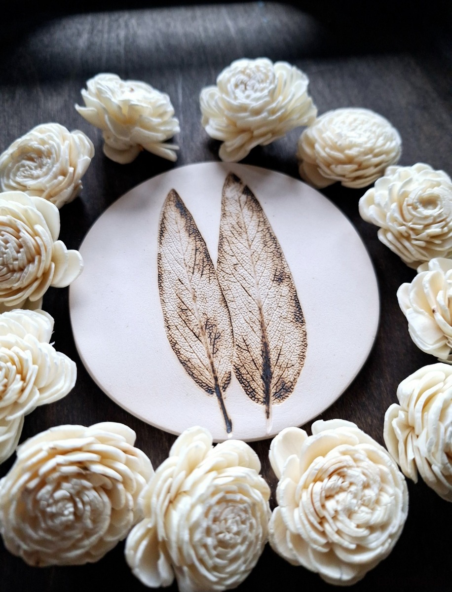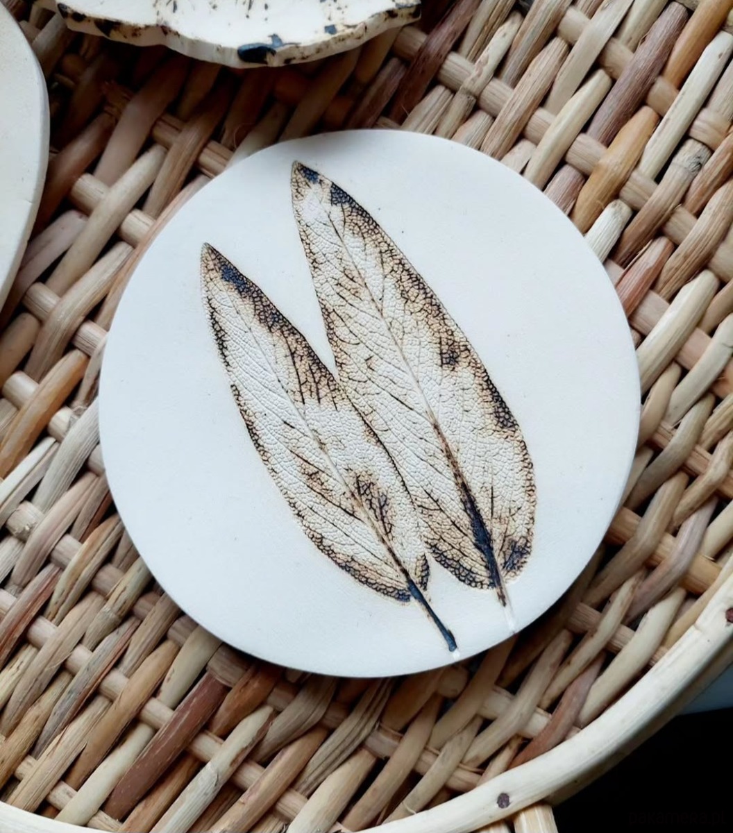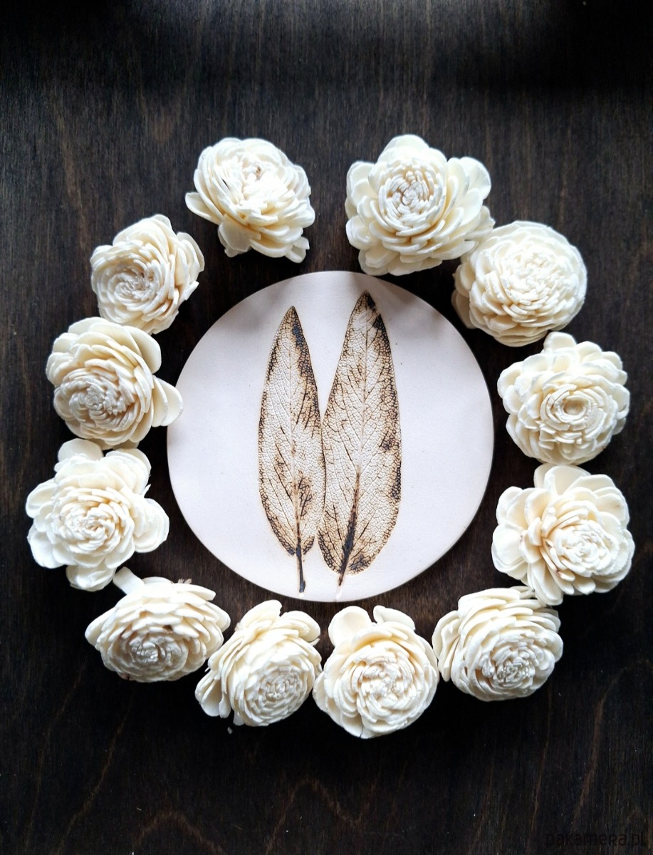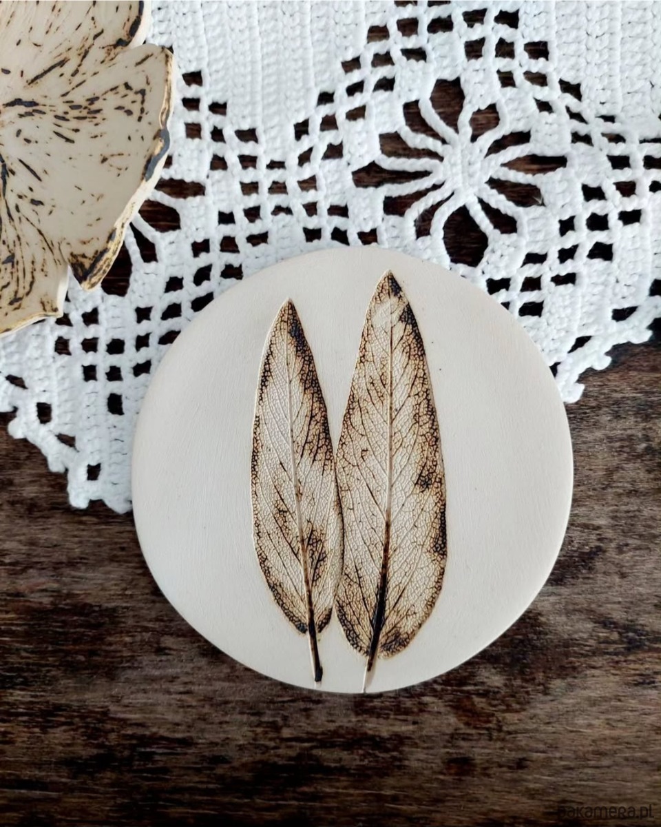 Ceramiczna zawieszka z motywem roślinnym, okrągła, posłużyć może jako dekor ścienny lub podstawka. Ręcznie wykonana ozdoba stanowi wypaloną glinę, motyw roślinny barwiony ciemnym szkliwem. Wyjątkowa ozdoba o nietuzinkowym charakterze, dla miłośnika natury.
