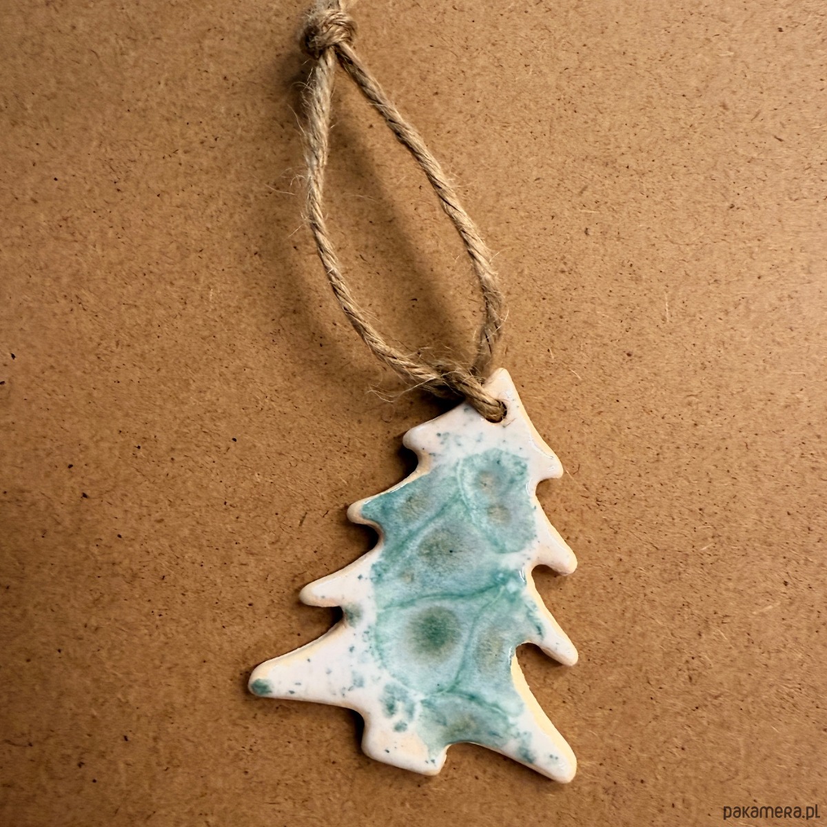 Ceramiczna ozdoba na choinkę w kształcie zielonej choinki przykrytej śniegiem wykonana własnoręcznie - każdy egzemplarz jest jedyny w swoim rodzaju.