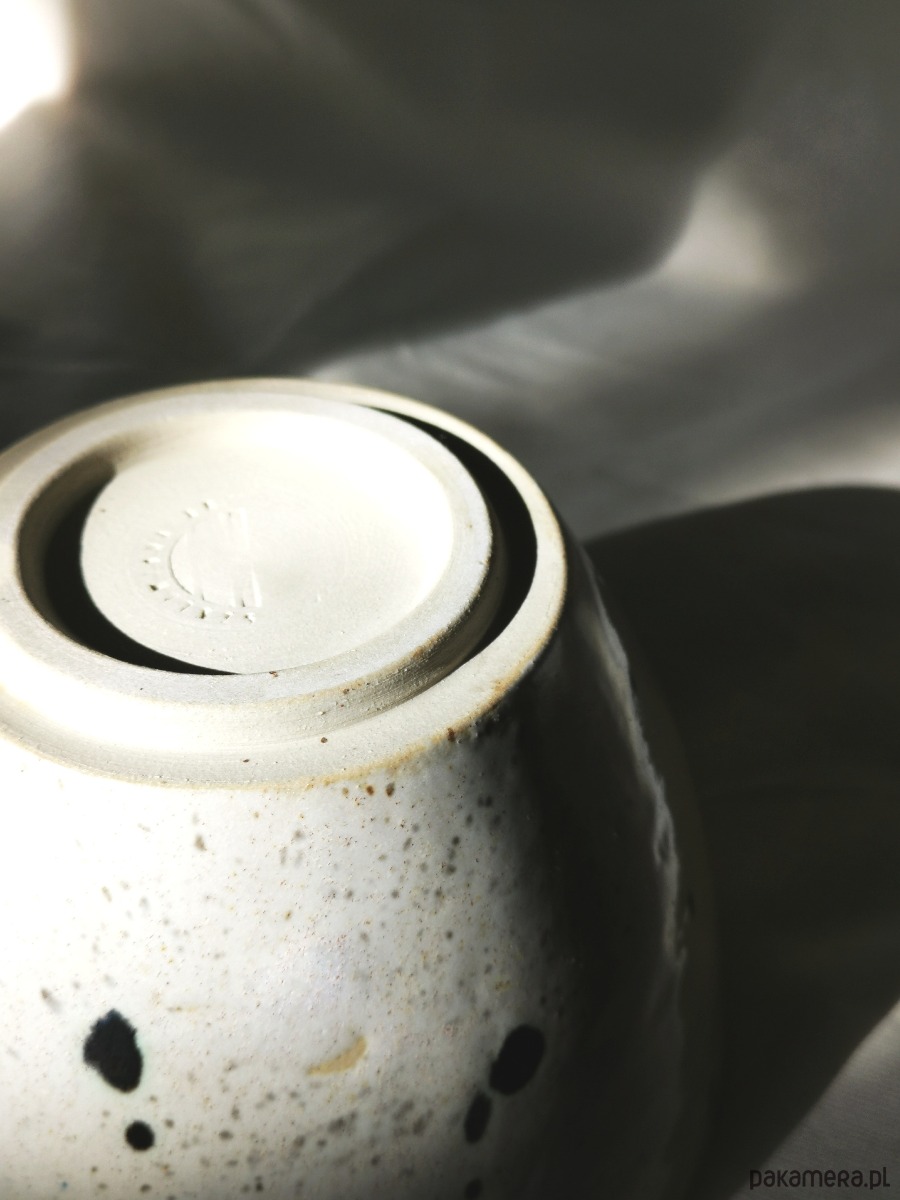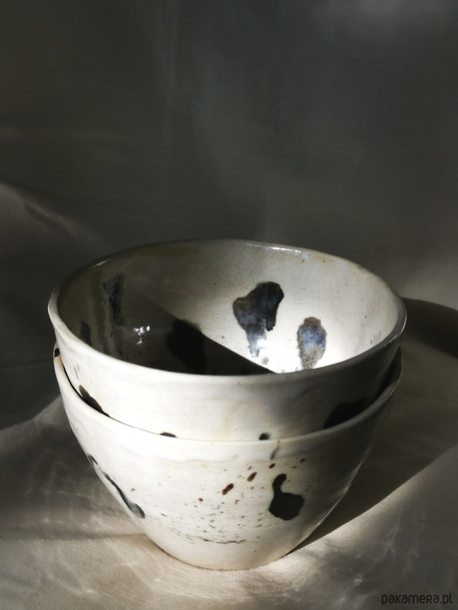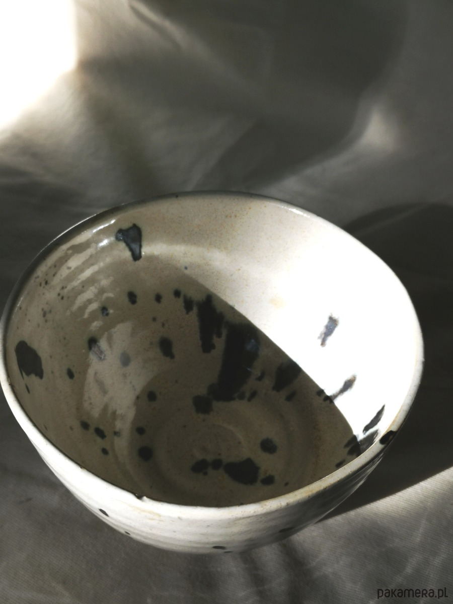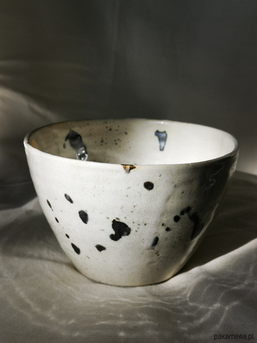Jasne, naturalne szkliwo z nieregularnymi, ciemnymi plamkami i subtelnymi śladami wypału sprawia, że każda miska jest unikatowa. Delikatne kontrasty i lekko surowe wykończenie nadają jej spokojny, organiczny charakter – bez nadmiaru ozdobników.