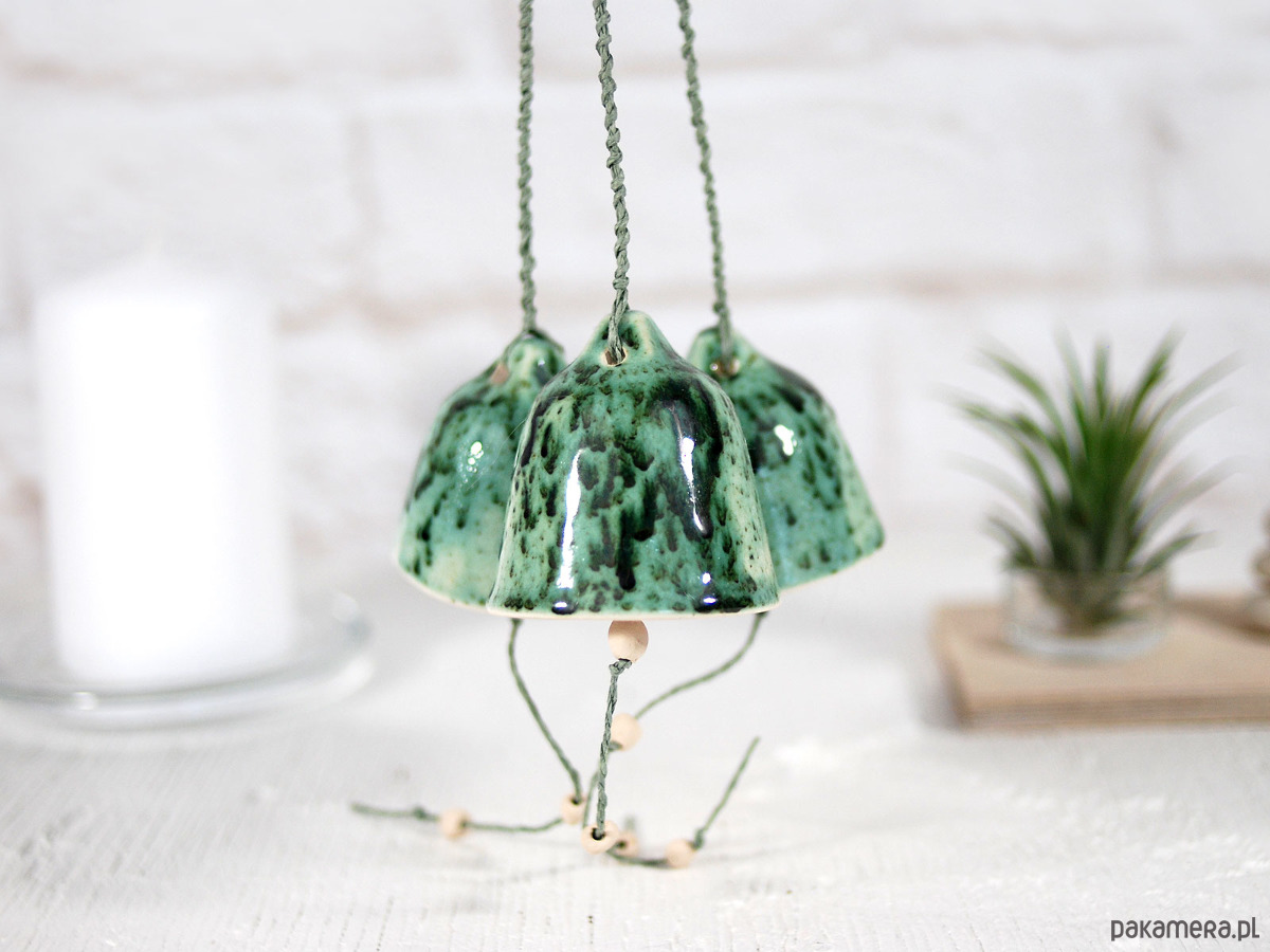Zestaw zawiera 3 ręcznie robione i malowane, ceramiczne dzwonki.