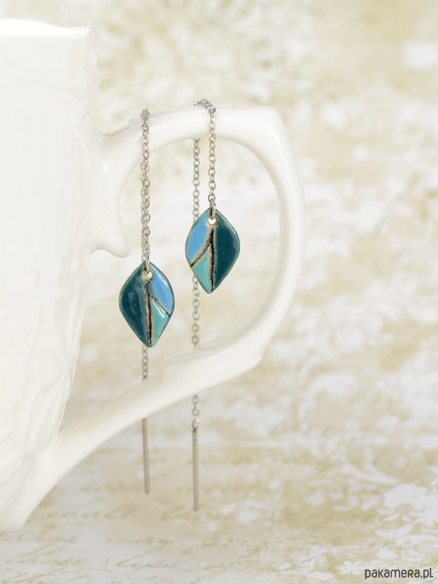 Nowa forma kolczyków z listkami:) Przeciągane na cieniutkim łańcuszku z zawieszkami w kształcie listków w rozmiarze 14x9mm. Elementy ceramiczne zostały przeze mnie dopracowane w najmniejszym szczególe i są bardzo efektowne :))) Kolorystyka to morska zieleń, niebieski i turkusowy.Tył listków jest gładki, w kolorze niebieskim .Długość przeciąganego łańcuszka z końcówką to 10cm .Kolczyki są leciutkie, a oprawę stanowi stal chirurgiczna. Polecam!! Wysyłam w ozdobnym pudełku