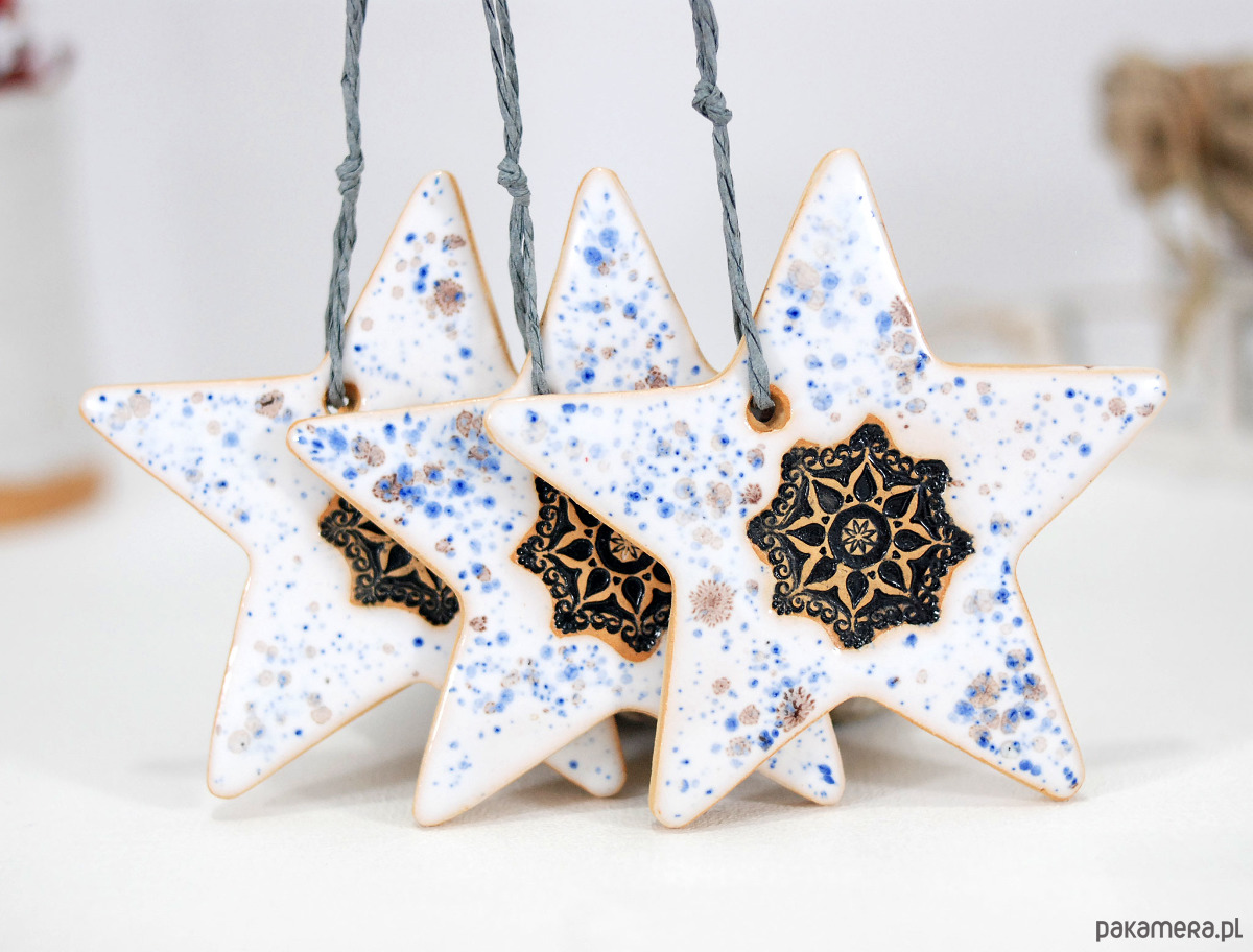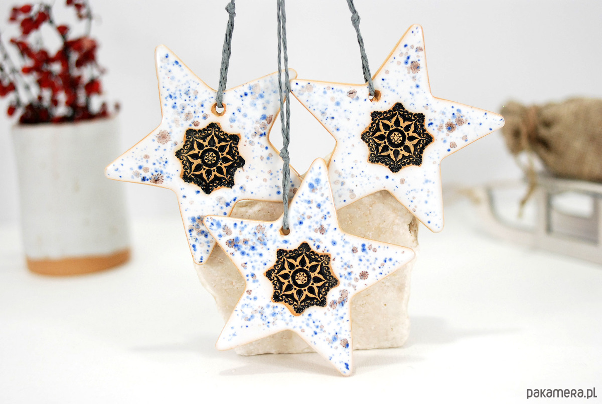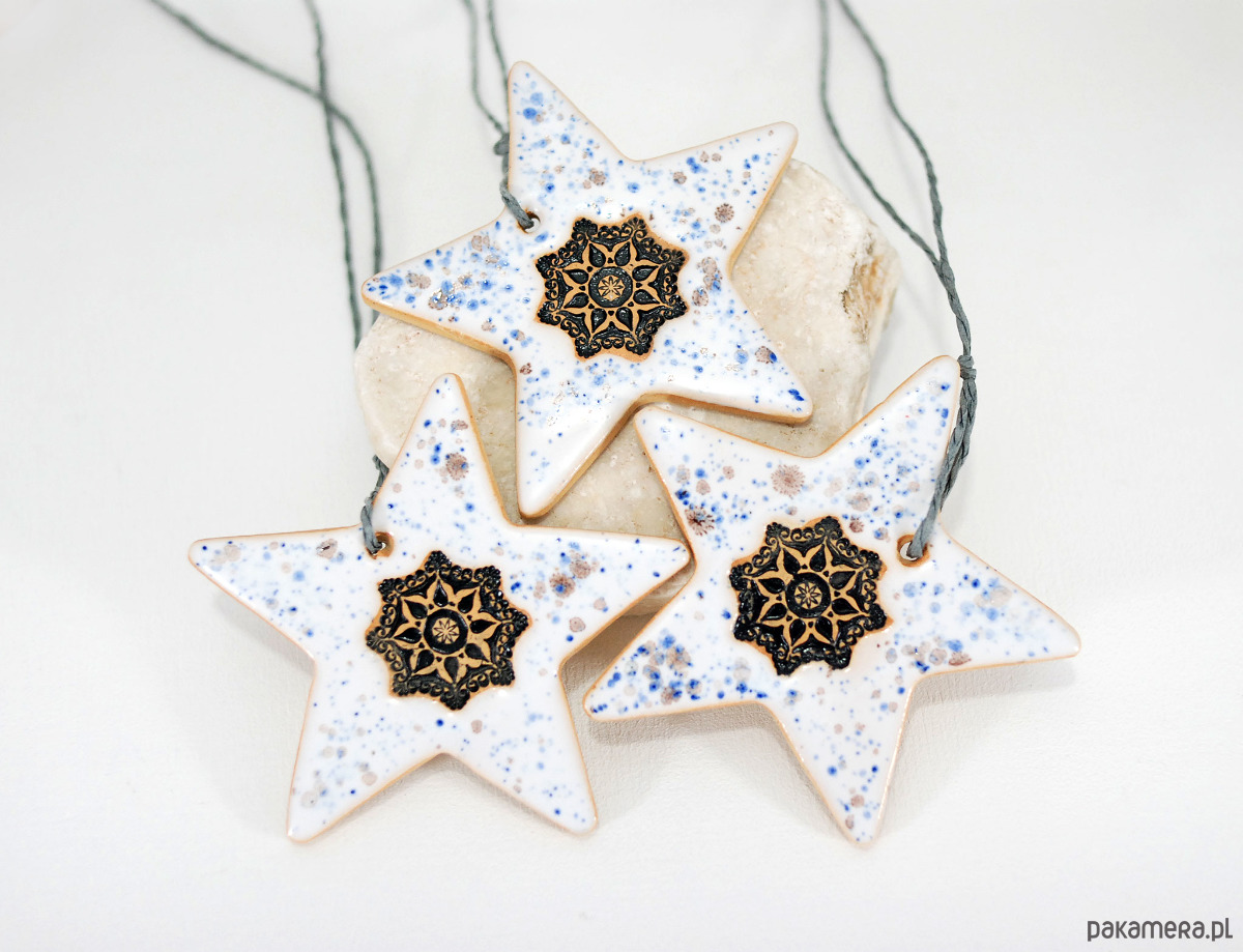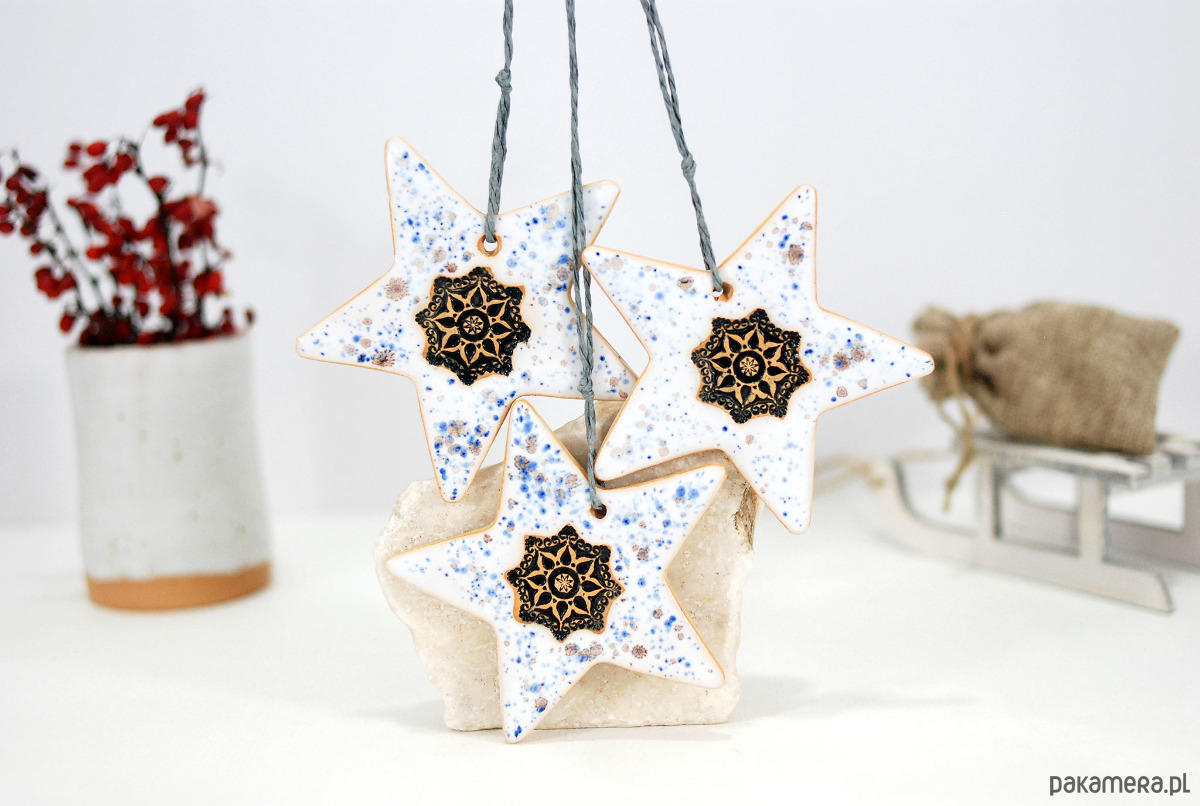 Komplet zawiera trzy ceramiczne gwiazdki choinkowe. Ozdoby są ręcznie robione i szkliwione co gwarantuje ich niepowtarzalność i indywidualny charakter. Można je powiesić klasycznie - na choince, ale pięknie będą się prezentować w oknie czy na ścianie. Ceramiczne ozdoby to również fajny pomysł na świąteczny prezent dla twoich najbliższych :)