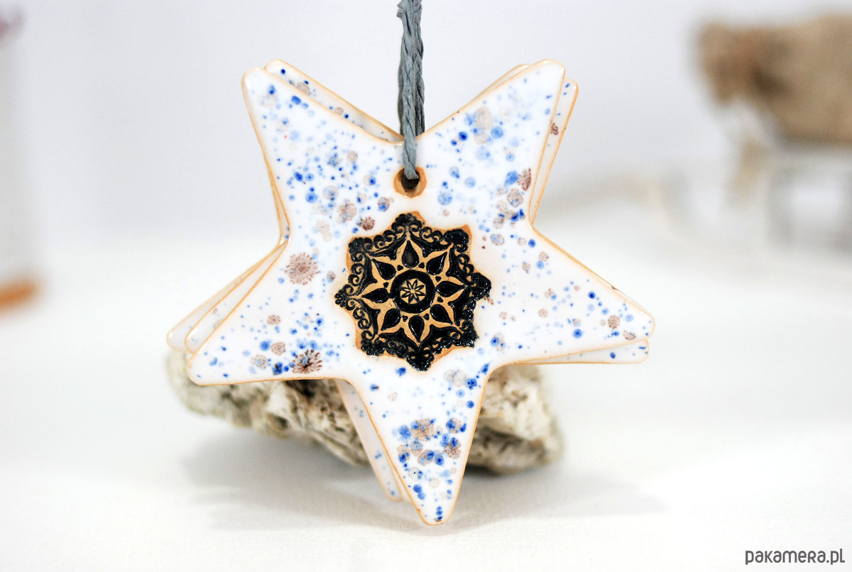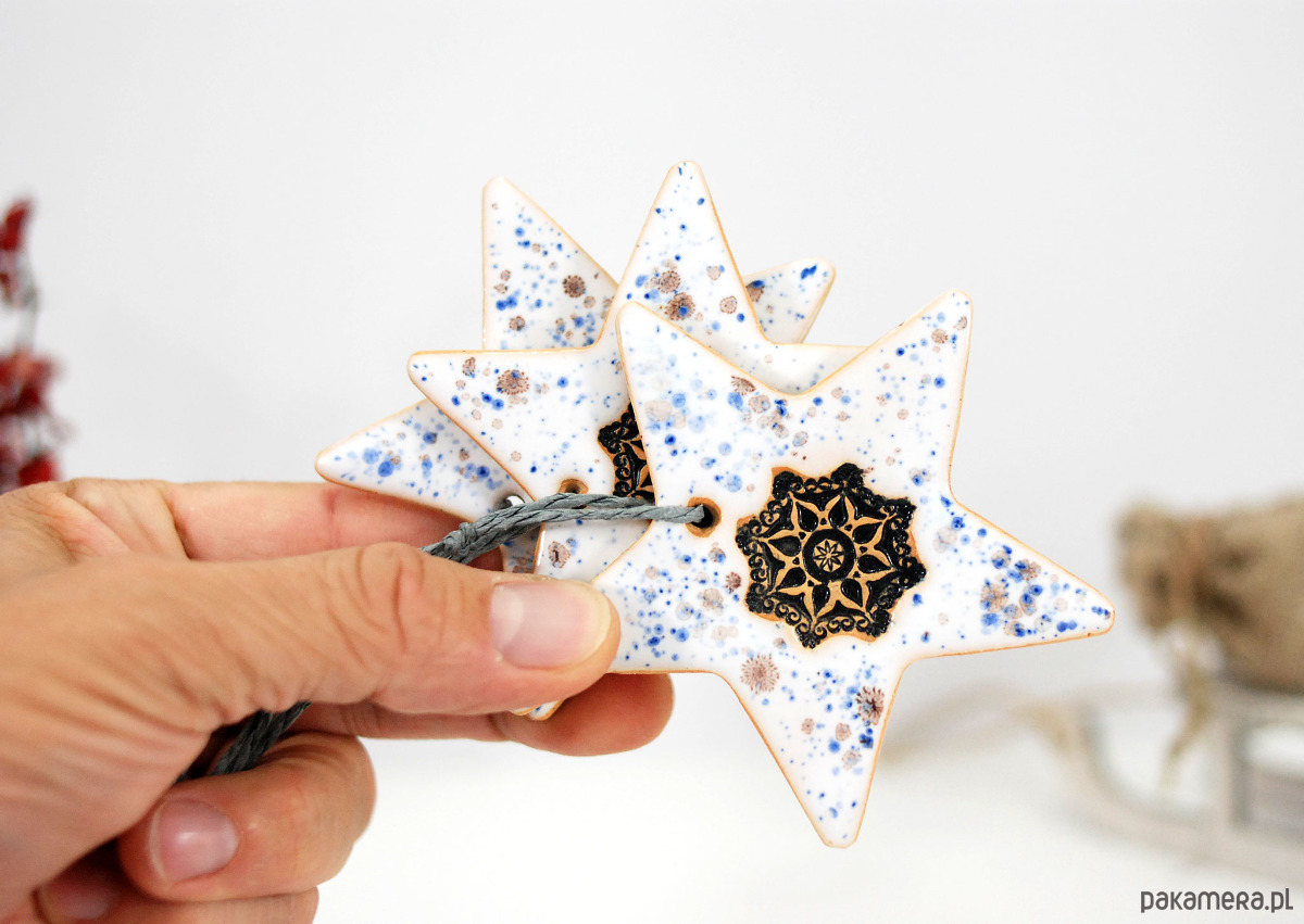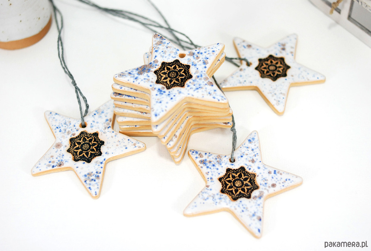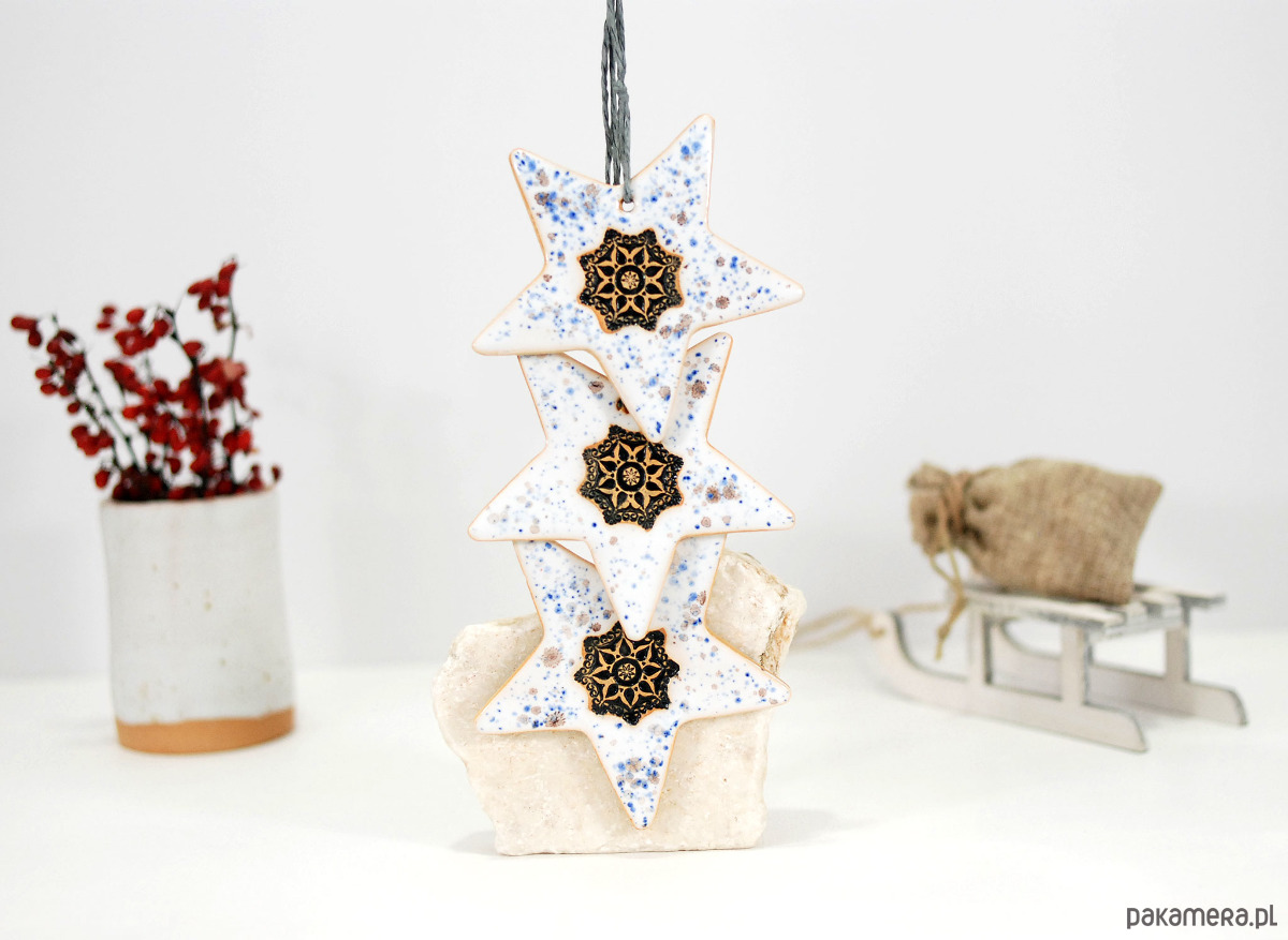 Komplet zawiera trzy ceramiczne gwiazdki choinkowe. Ozdoby są ręcznie robione i szkliwione co gwarantuje ich niepowtarzalność i indywidualny charakter. Można je powiesić klasycznie - na choince, ale pięknie będą się prezentować w oknie czy na ścianie. Ceramiczne ozdoby to również fajny pomysł na świąteczny prezent dla twoich najbliższych :)