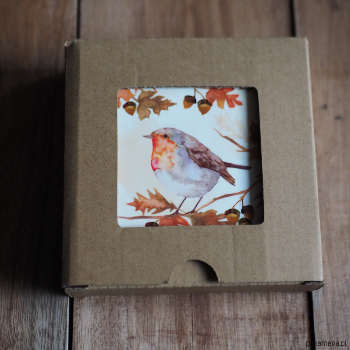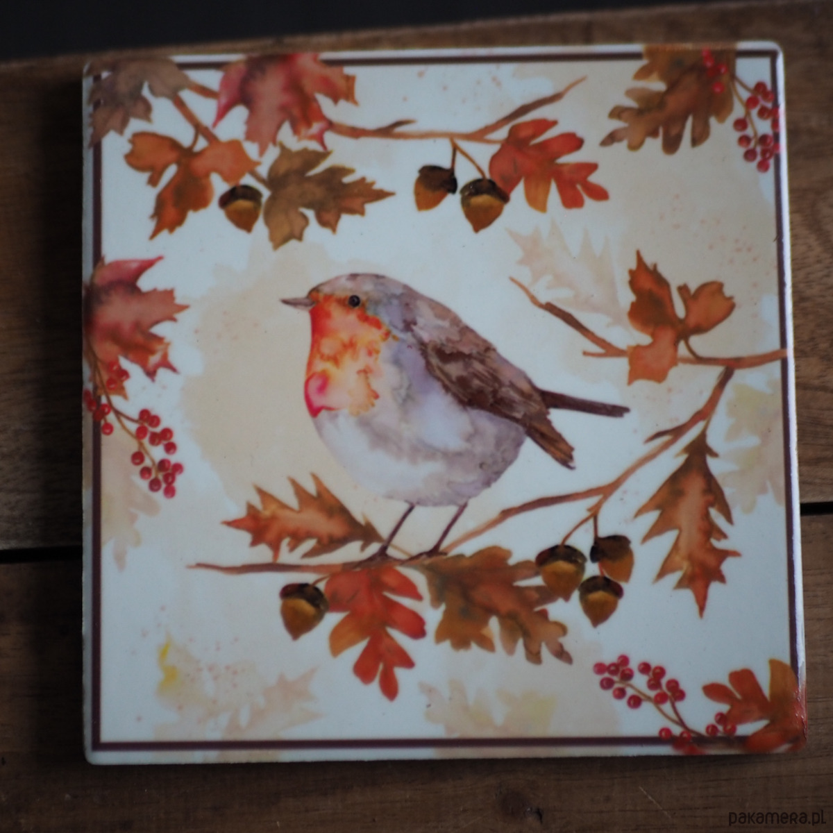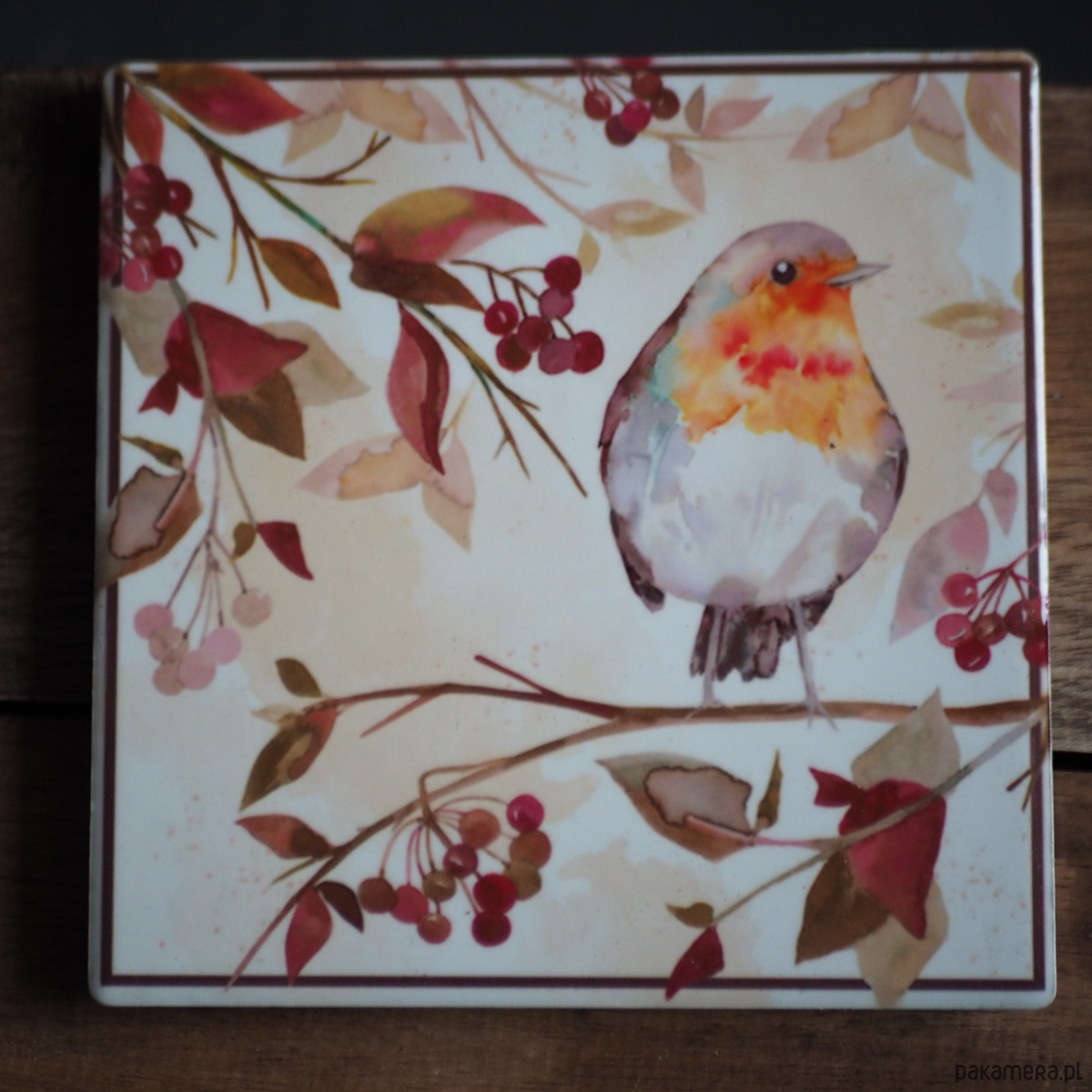 Jesienny urok: Każda podstawka zdobiona jest subtelnym wzorem jesiennych listków i uroczych ptaszków. Ta grafika odzwierciedla piękno złotej pory roku, idealnie komponując się z drewnem, naturalnymi tkaninami i wnętrzami w stylu hygge czy skandynawskim.