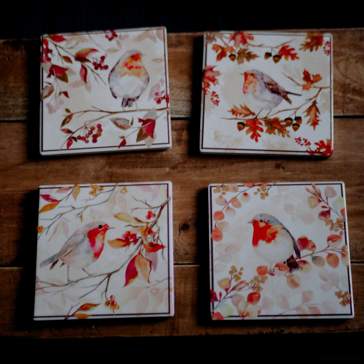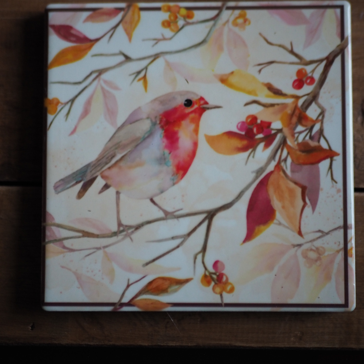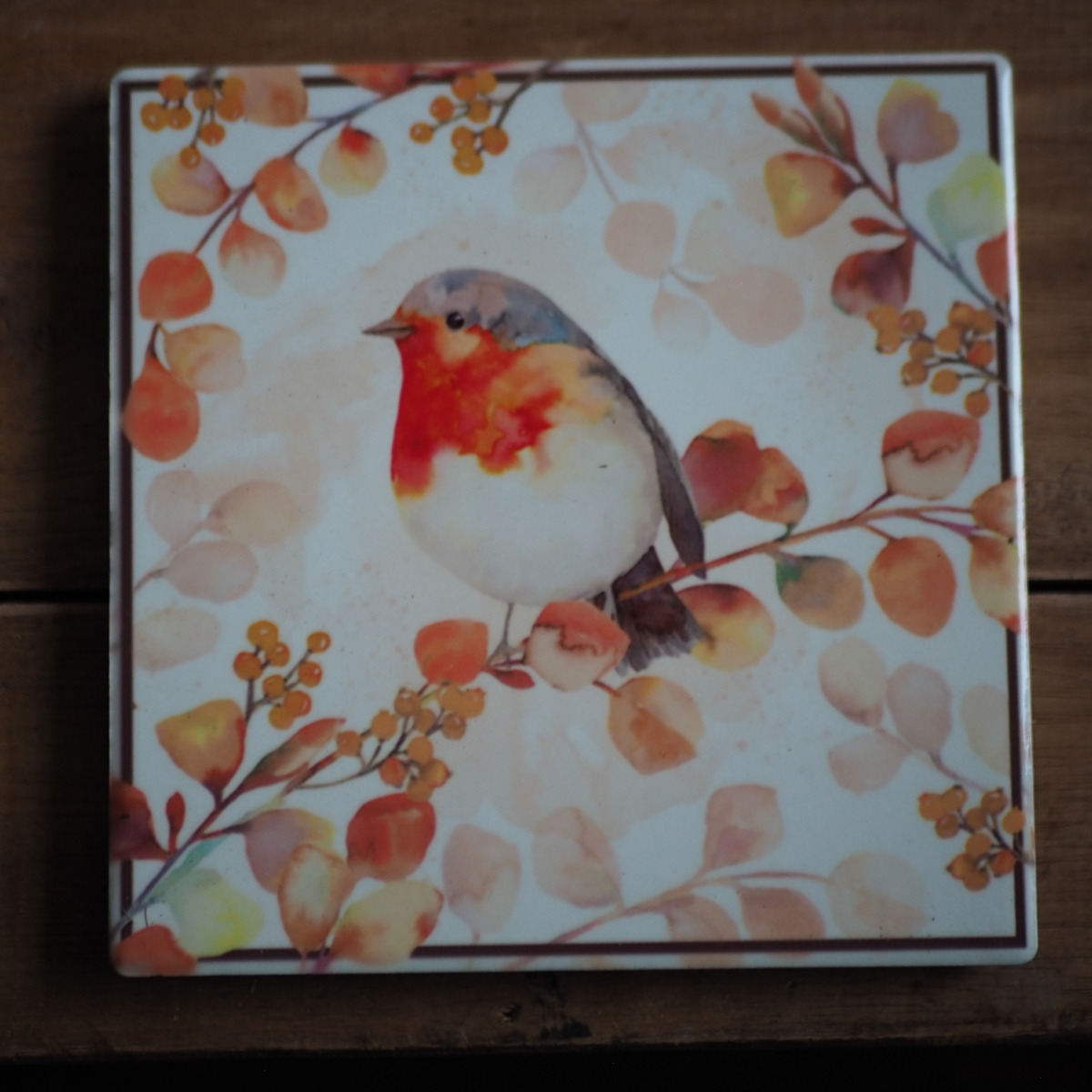Jesienny urok: Każda podstawka zdobiona jest subtelnym wzorem jesiennych listków i uroczych ptaszków. Ta grafika odzwierciedla piękno złotej pory roku, idealnie komponując się z drewnem, naturalnymi tkaninami i wnętrzami w stylu hygge czy skandynawskim.