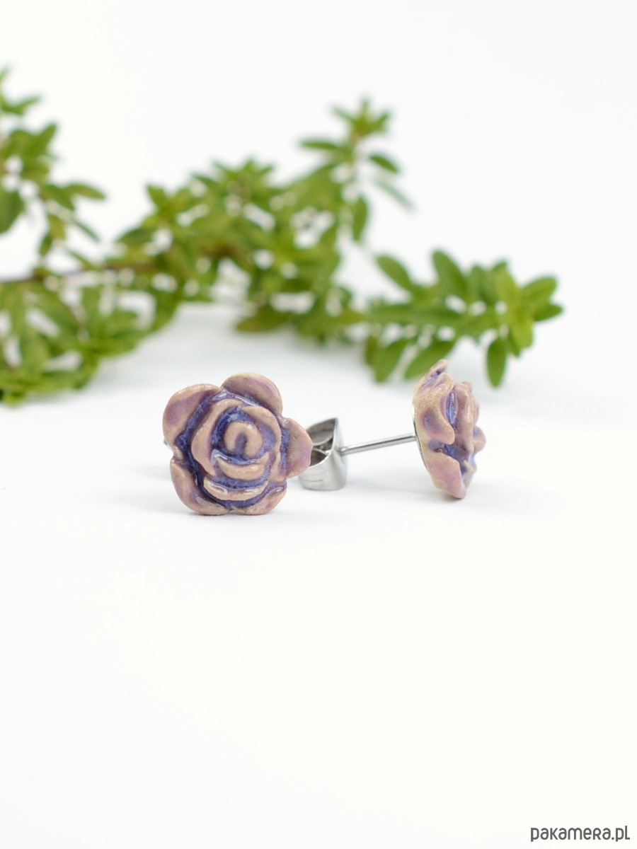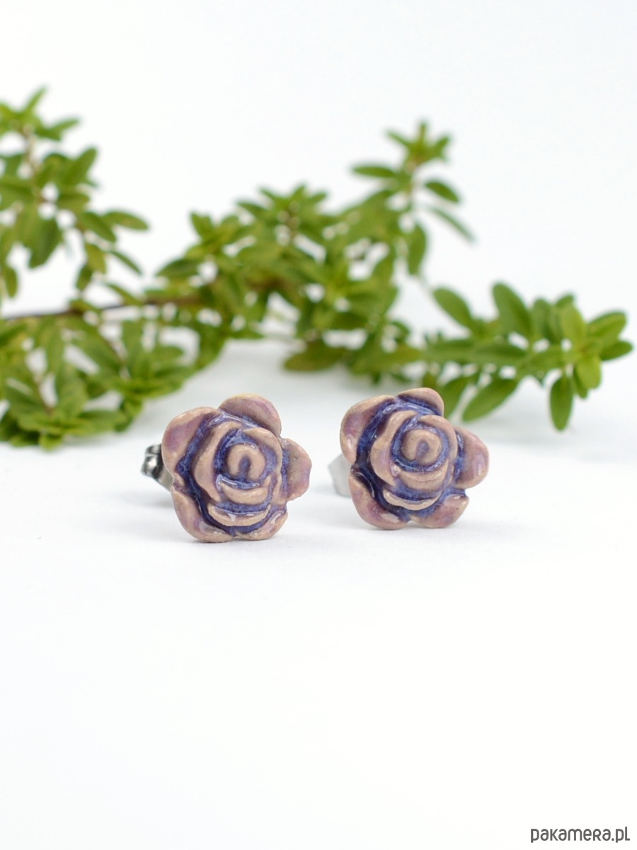Ceramiczne róże fiioletowe- kolczyki sztyfty 3d