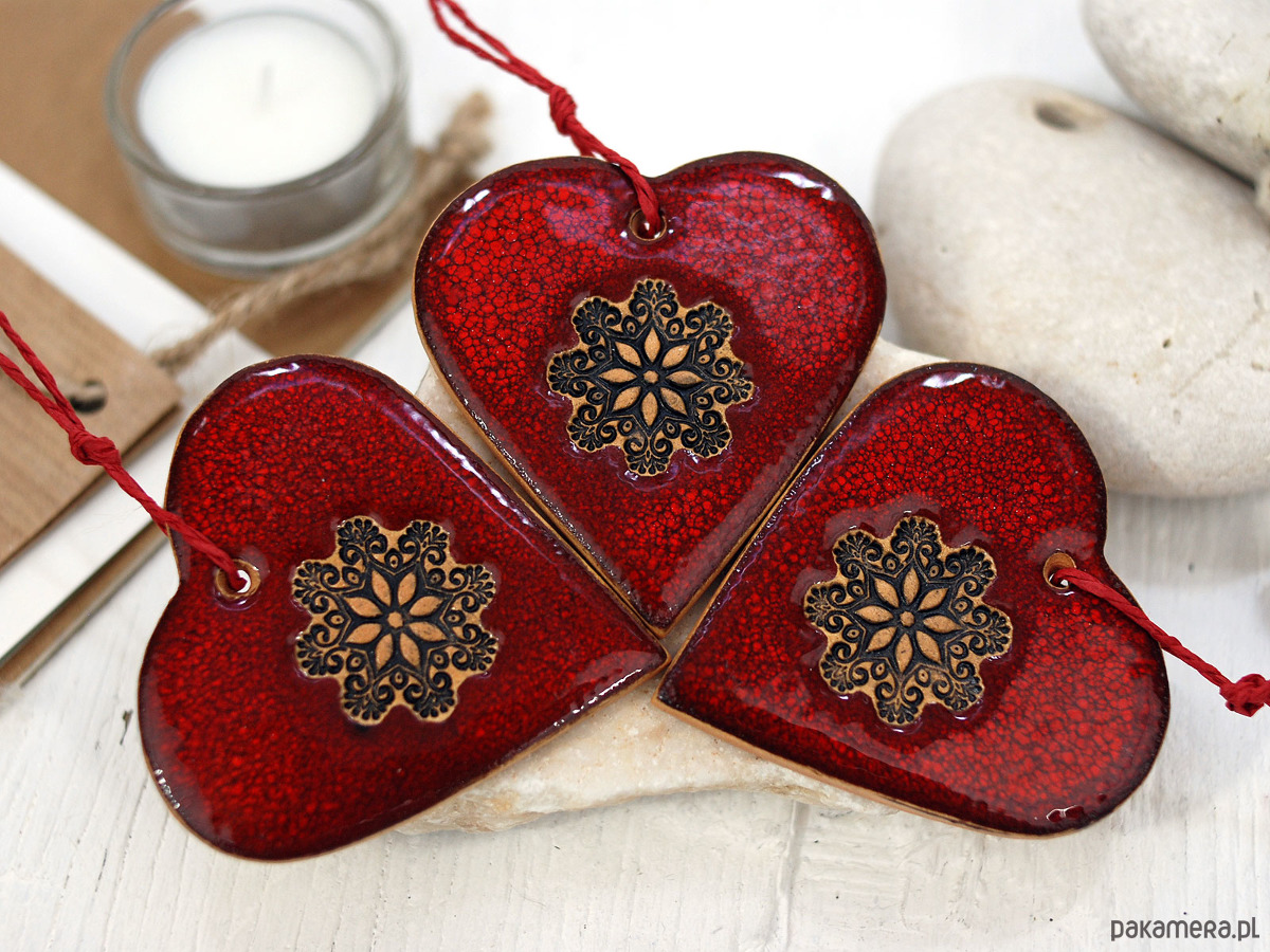 Zestaw zawiera 3 ręcznie robione i malowane ceramiczne ozdoby serca.