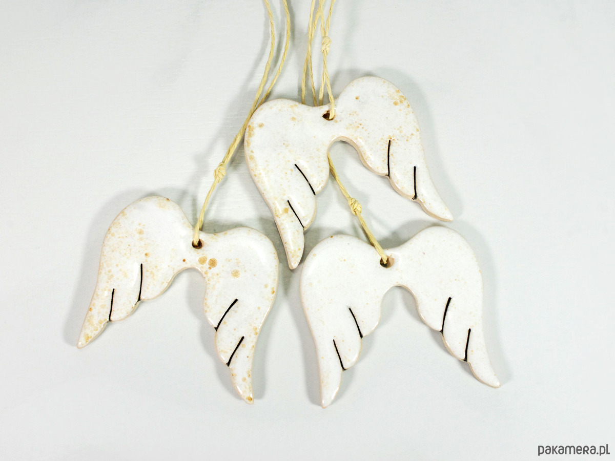Ręcznie robiony komplet trzech ceramicznych skrzydeł w kolorze bieli. To unikalny symbol ochrony i idealny pomysł na prezent na chrzest, komunię lub jako osobista pamiątka dla bliskiej osoby.