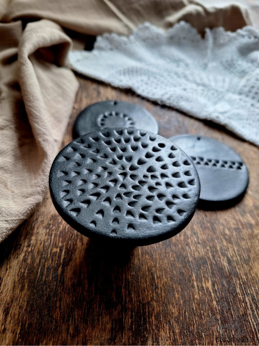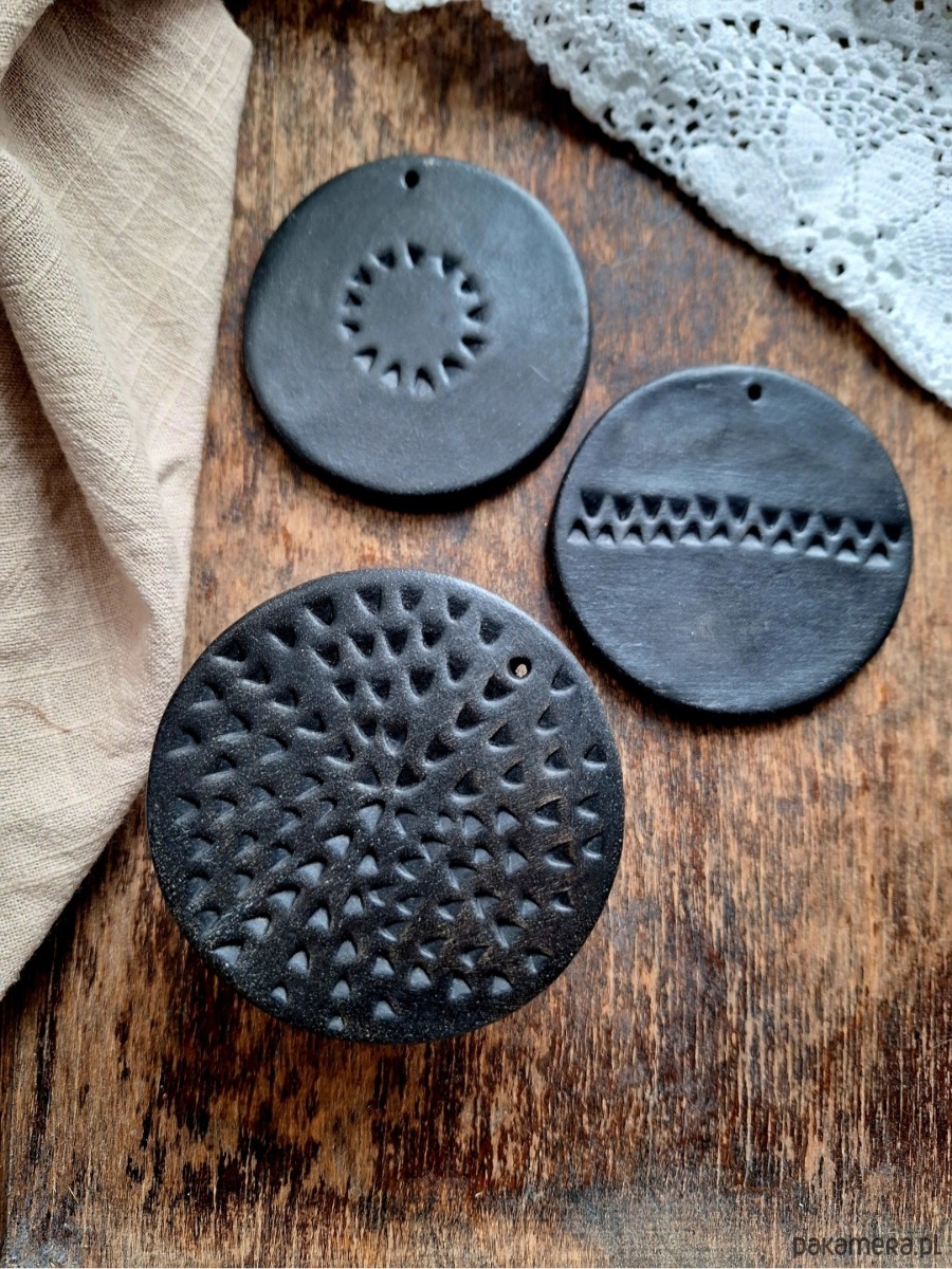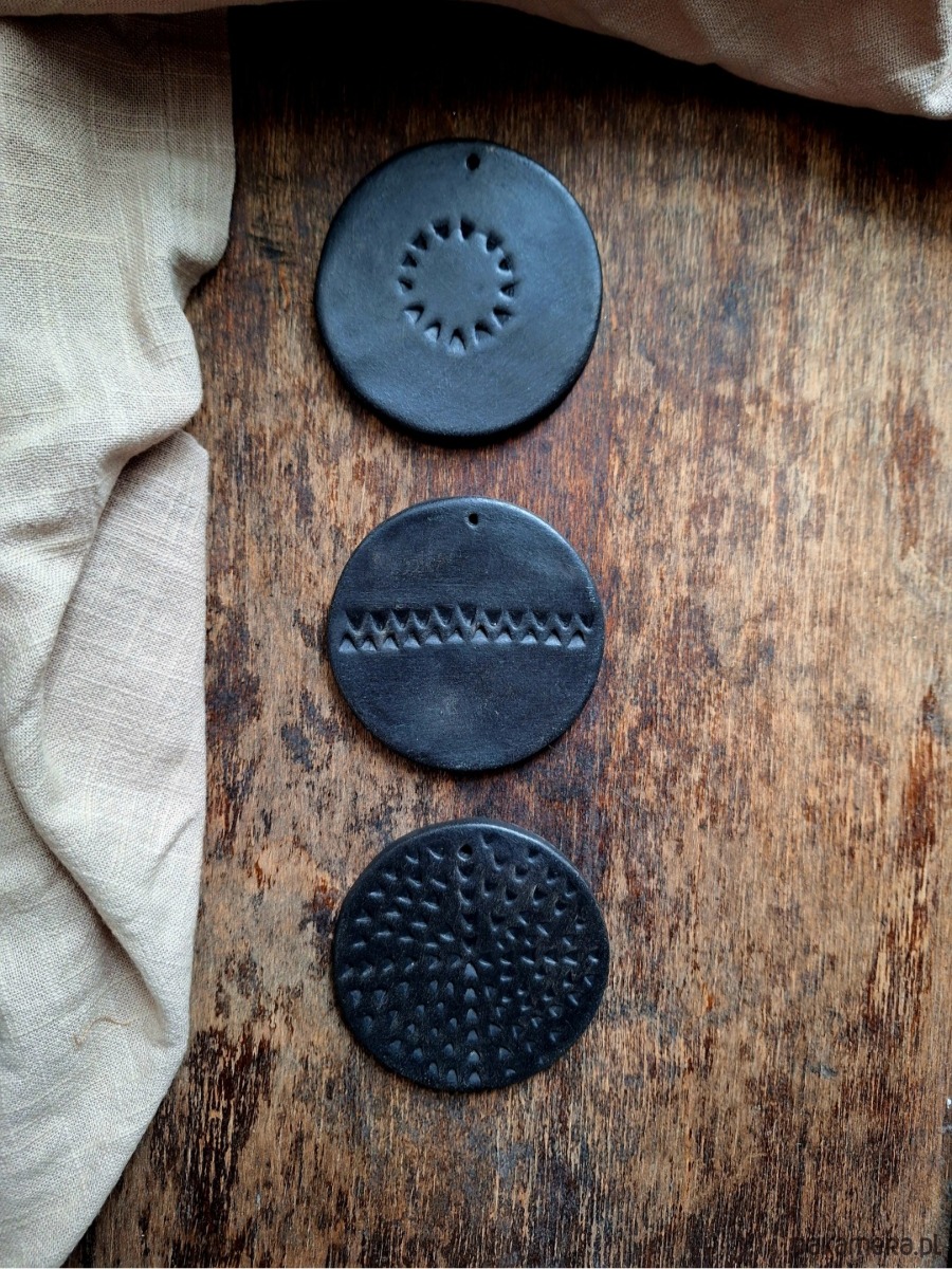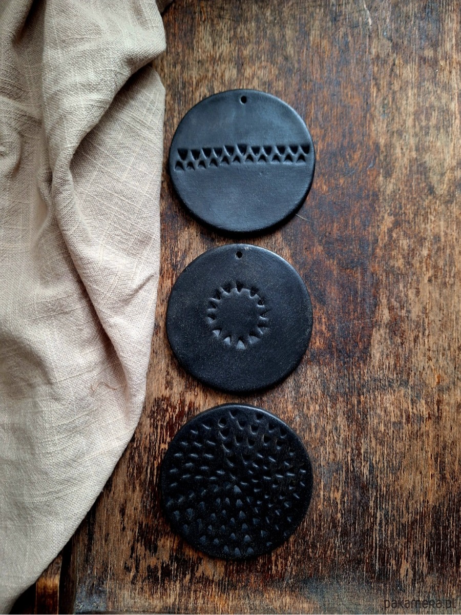Ceramiczne okrągłe zawieszki ze zdobieniami, zestaw 3 sztuk. Ozdoba stanowi wypalony biskwit barwiony czarnym pigmentem, bez szkliwienia, z błyszczącym wykończeniem. Kafelki artystyczne ręcznie formowane, mogą stanowić podstawkę pod świeczkę, stempel lub zawieszkę/ w każdej znajduje się mały otwór umożliwiający ich zawieszenie.