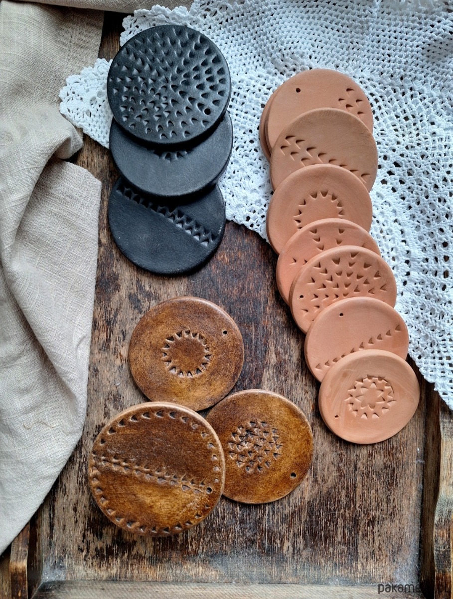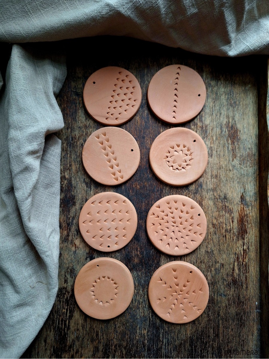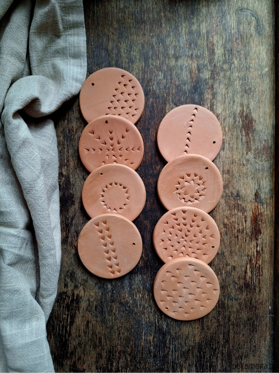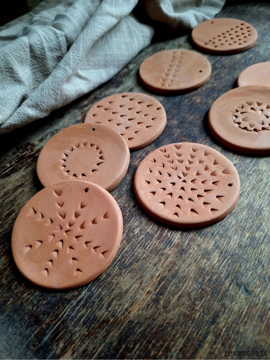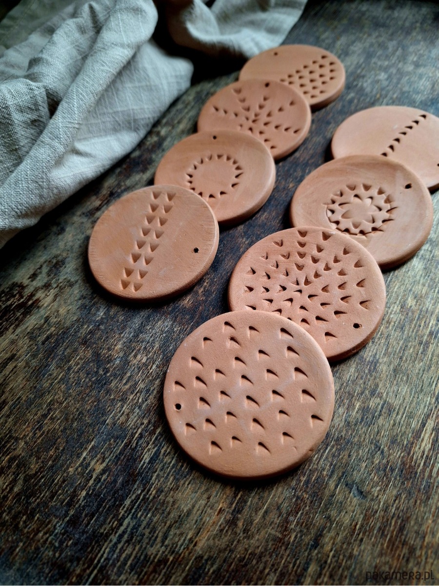 Ceramiczne okrągłe zawieszki ze zdobieniami, zestaw 8 sztuk. Ozdoba stanowi wypalony biskwit w kolorze rudym/pomarańczowym, bez szkliwienia. Kafelki artystyczne ręcznie formowane, mogą stanowić podstawkę pod świeczkę, stempel lub zawieszkę/ w każdej znajduje się mały otwór umożliwiający ich zawieszenie. Matowe wykończenie.
