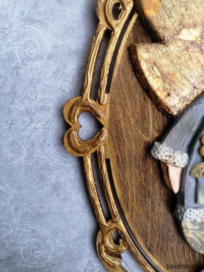 Umieszczona na drewnianej podstawie. Całość utrzymana w stylu retro. Wymiary 15 x 12 cm.