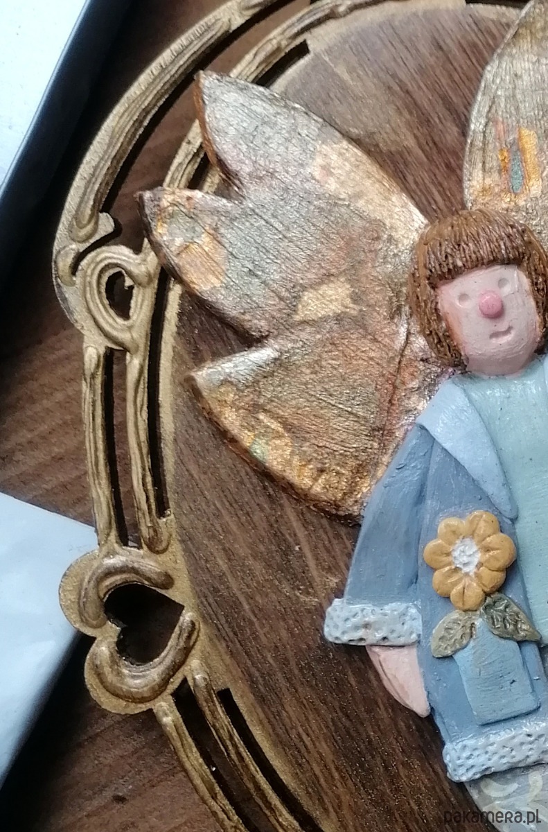 Figurka wykonana z glinki ceramicznej, ręcznie formowana i malowana. Złocenia wykonane za pomocą płatków.