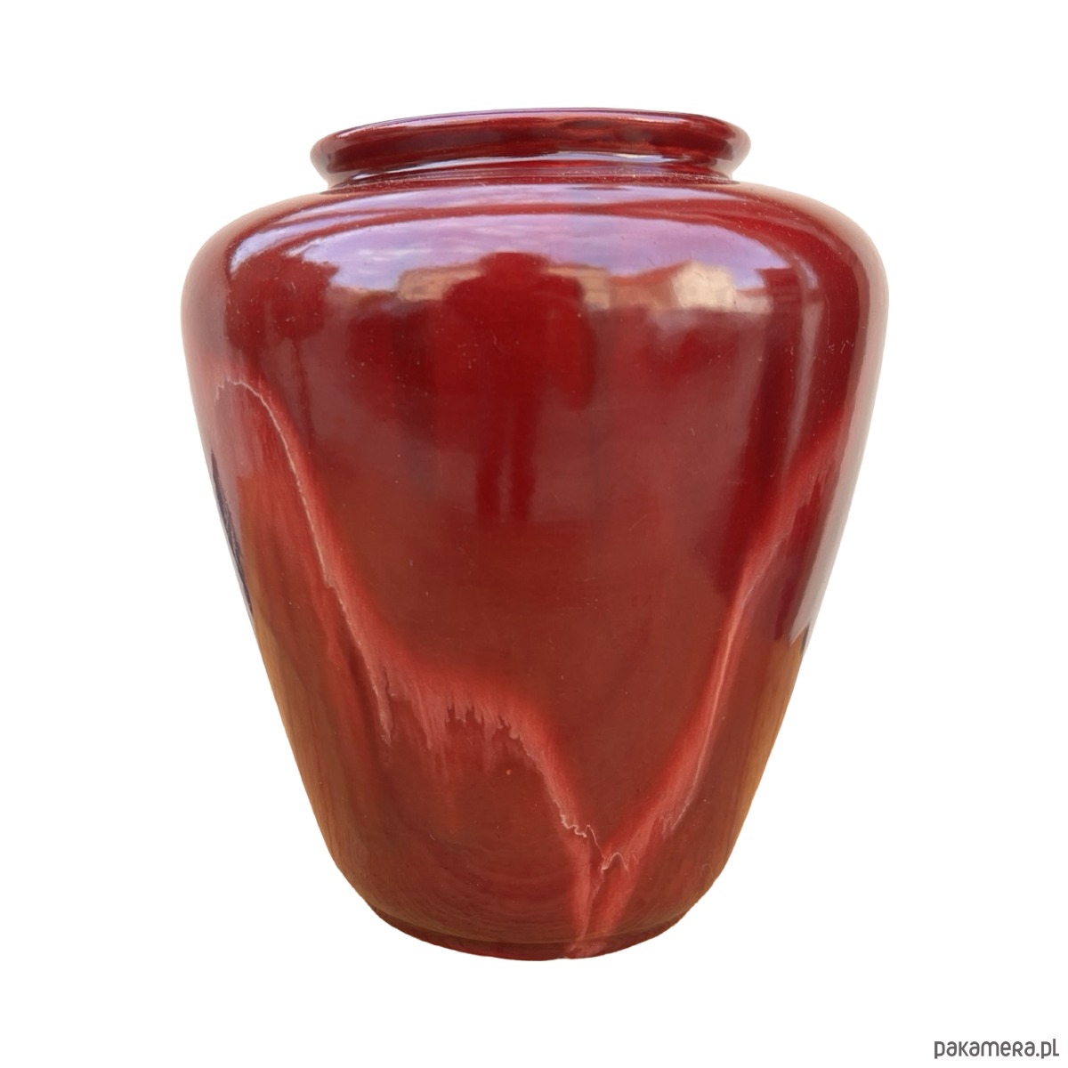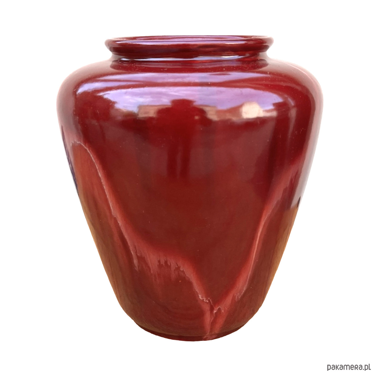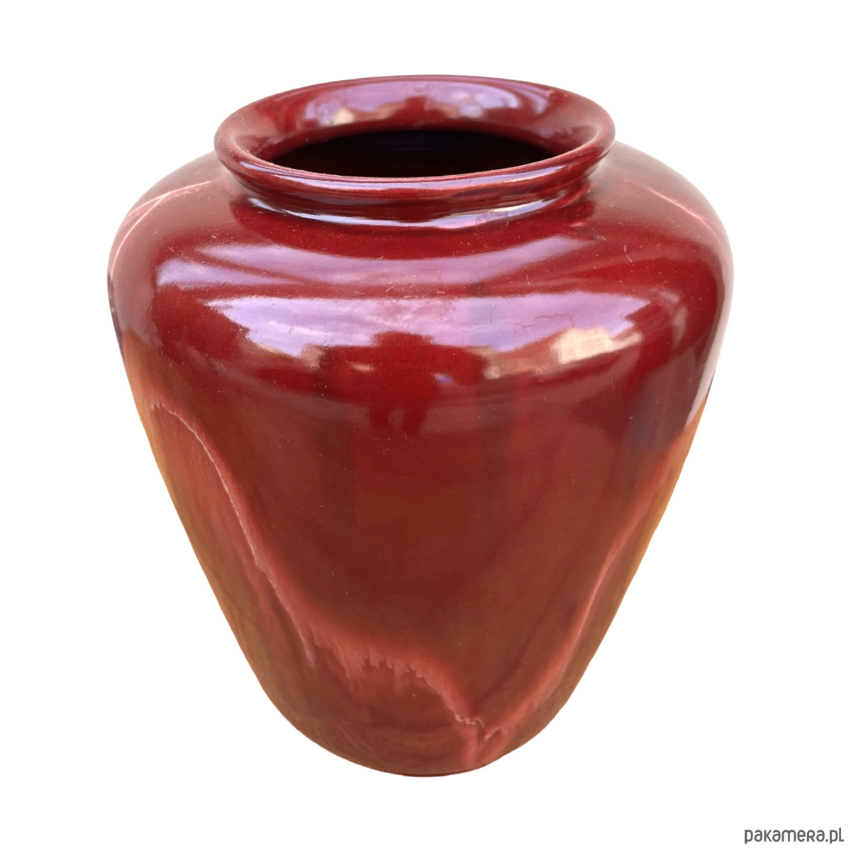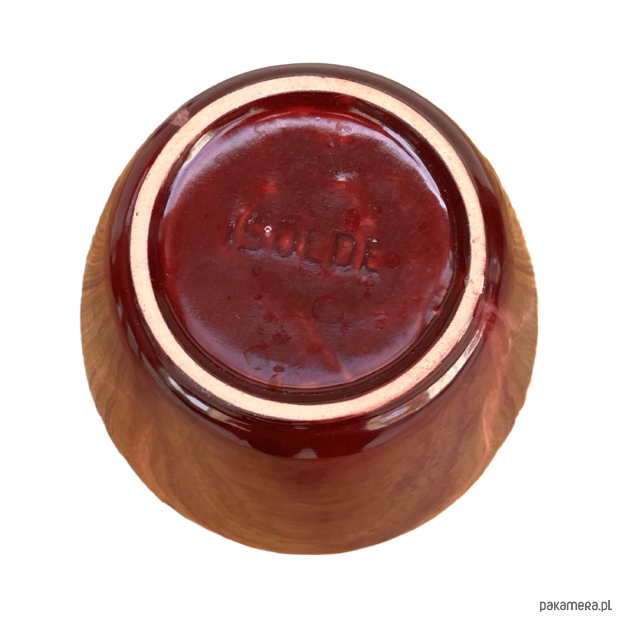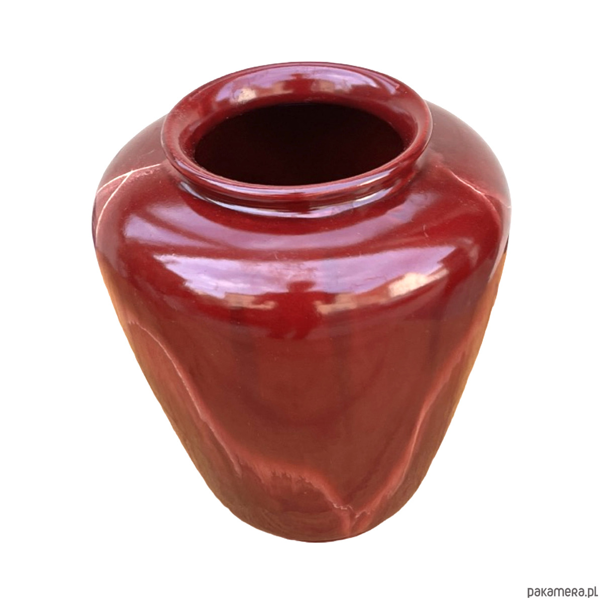Ceramiczny wazon w stylu modernistycznym został wykonany w Niemczech Zachodnich w małej manufakturze w drugiej połowie XX wieku. Wazon w kolorze bordowym z naciekami emalia szkliwiona. Zachowany jest w dobrym stanie, spękania emalii i rysy. Od spodu sygnatura "ISOLDE"