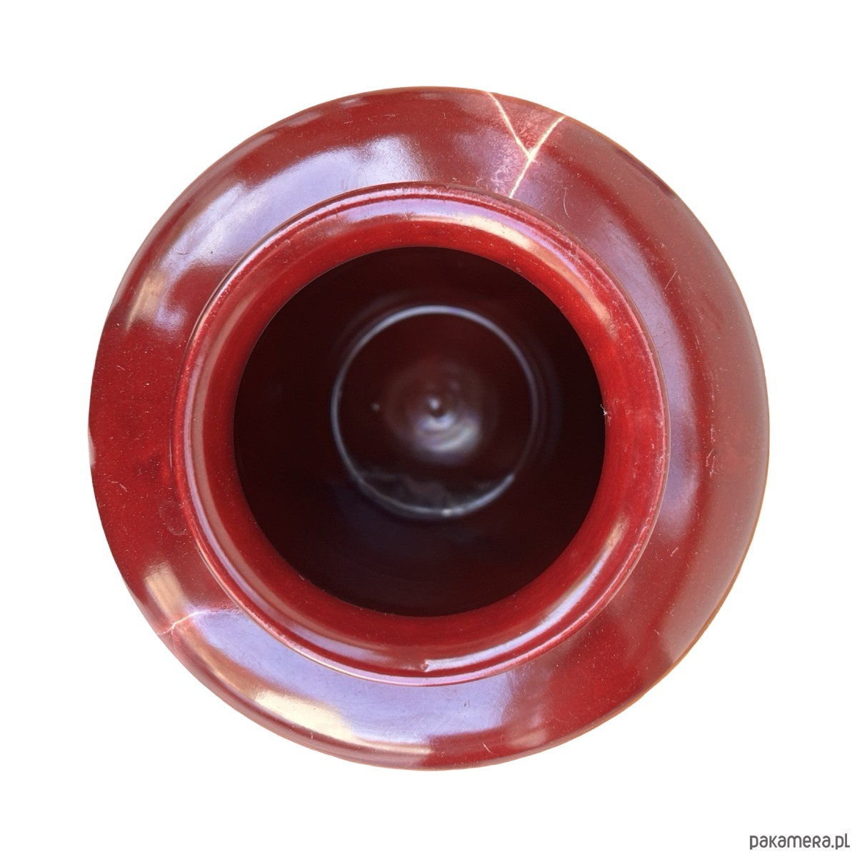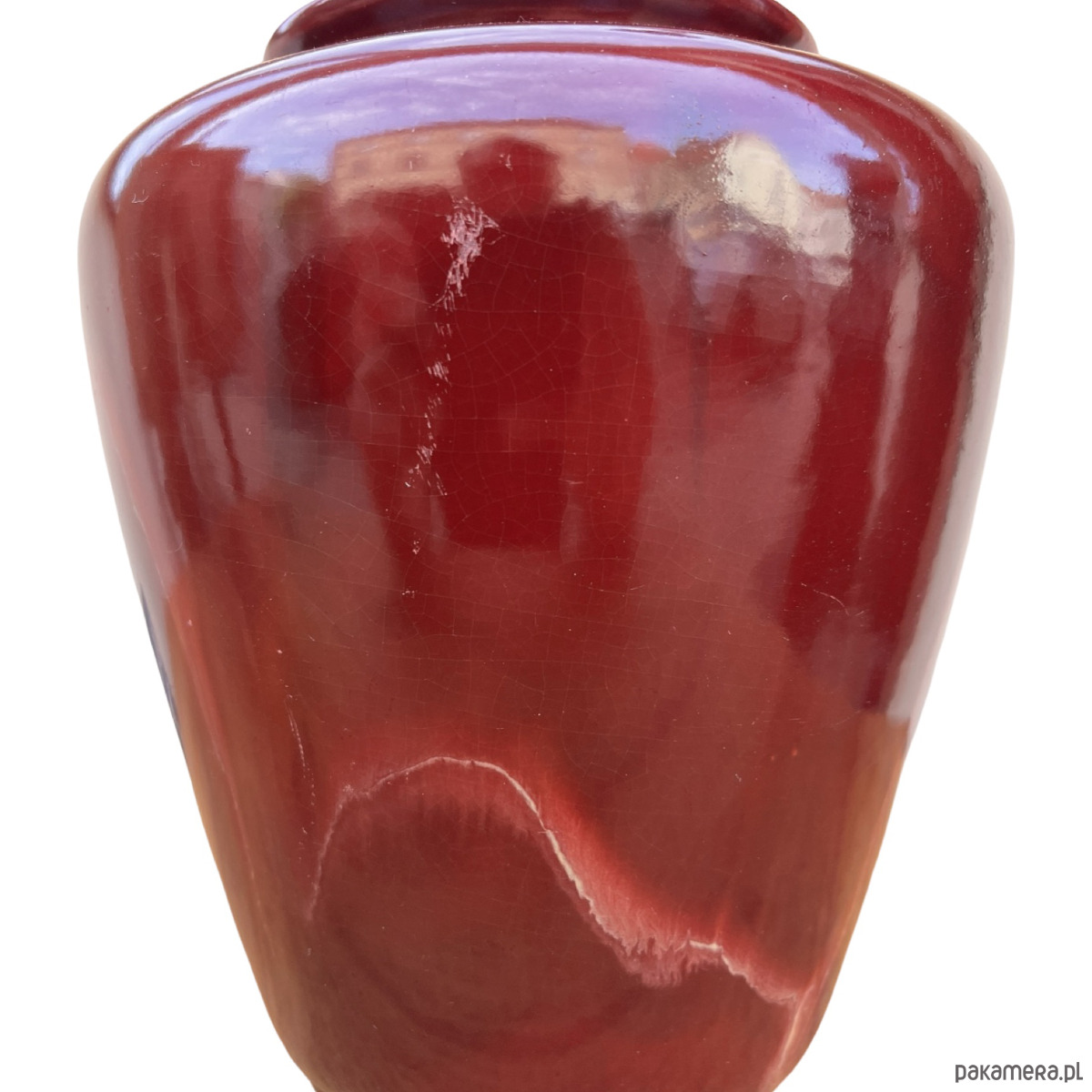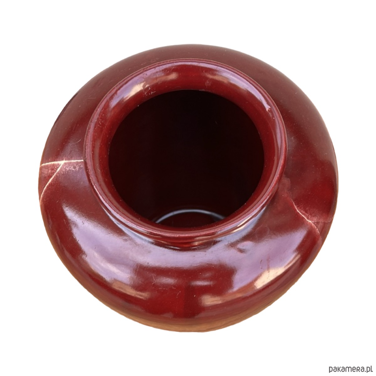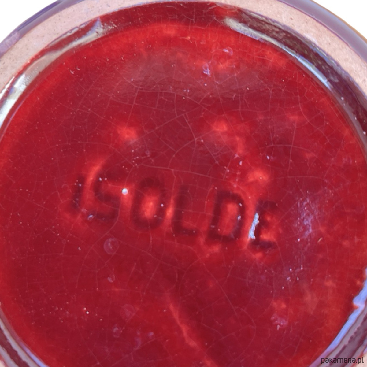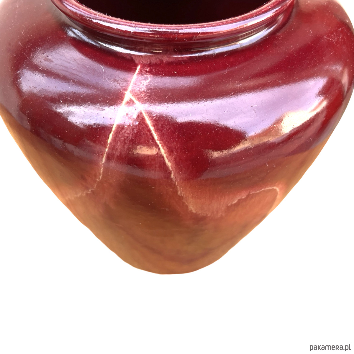 Ceramiczny wazon w stylu modernistycznym został wykonany w Niemczech Zachodnich w małej manufakturze w drugiej połowie XX wieku. Wazon w kolorze bordowym z naciekami emalia szkliwiona. Zachowany jest w dobrym stanie, spękania emalii i rysy. Od spodu sygnatura "ISOLDE"