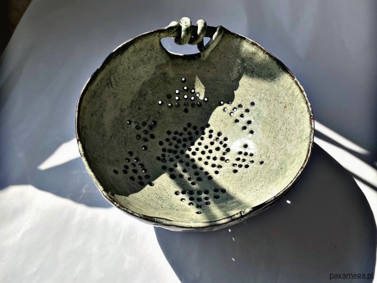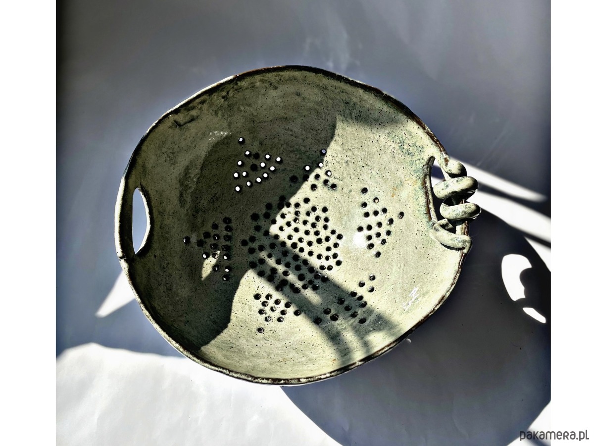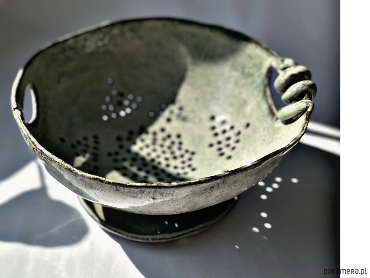 To nie tylko praktyczne naczynie – to codzienny rytuał w ceramicznej formie. Durszlak z dopasowaną podstawką, ręcznie wykonany z szaro-zielonej gliny, emanuje spokojem i naturalnością. Jego obecność w kuchni zaprasza do uważności: w myciu owoców, płukaniu ziół czy gotowaniu makaronu. A kiedy nie pracuje – staje się dekoracyjną misą, przyciągającą wzrok swoją surową elegancją.