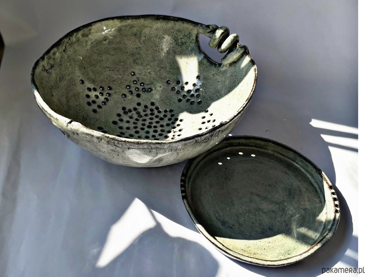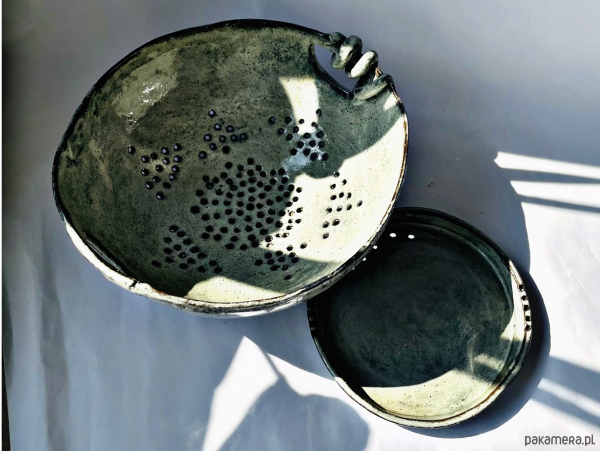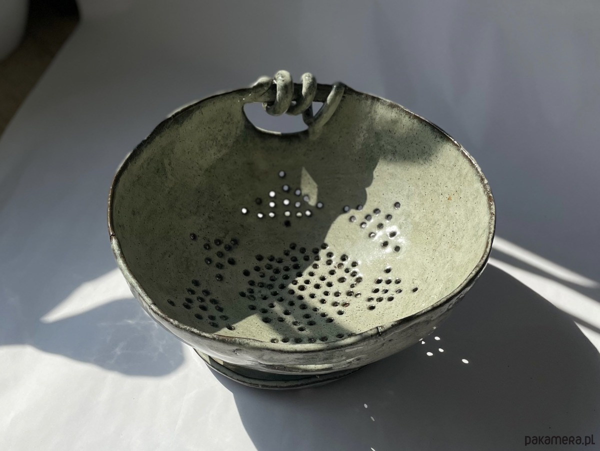To nie tylko praktyczne naczynie – to codzienny rytuał w ceramicznej formie. Durszlak z dopasowaną podstawką, ręcznie wykonany z szaro-zielonej gliny, emanuje spokojem i naturalnością. Jego obecność w kuchni zaprasza do uważności: w myciu owoców, płukaniu ziół czy gotowaniu makaronu. A kiedy nie pracuje – staje się dekoracyjną misą, przyciągającą wzrok swoją surową elegancją.
