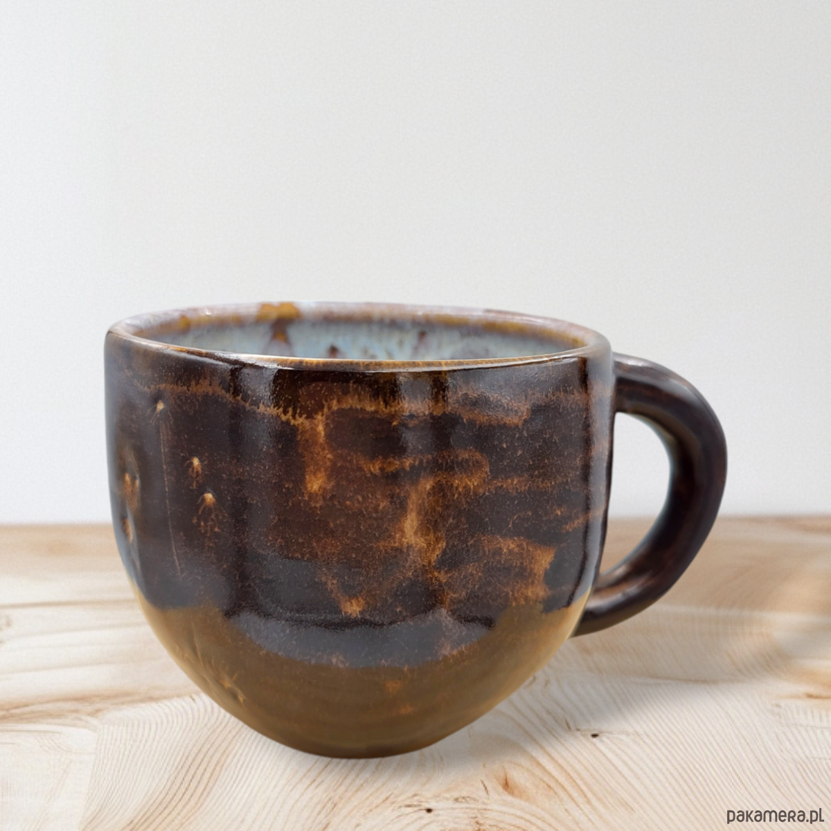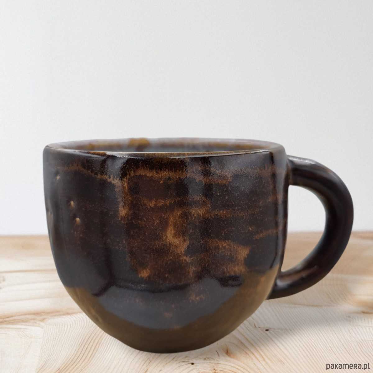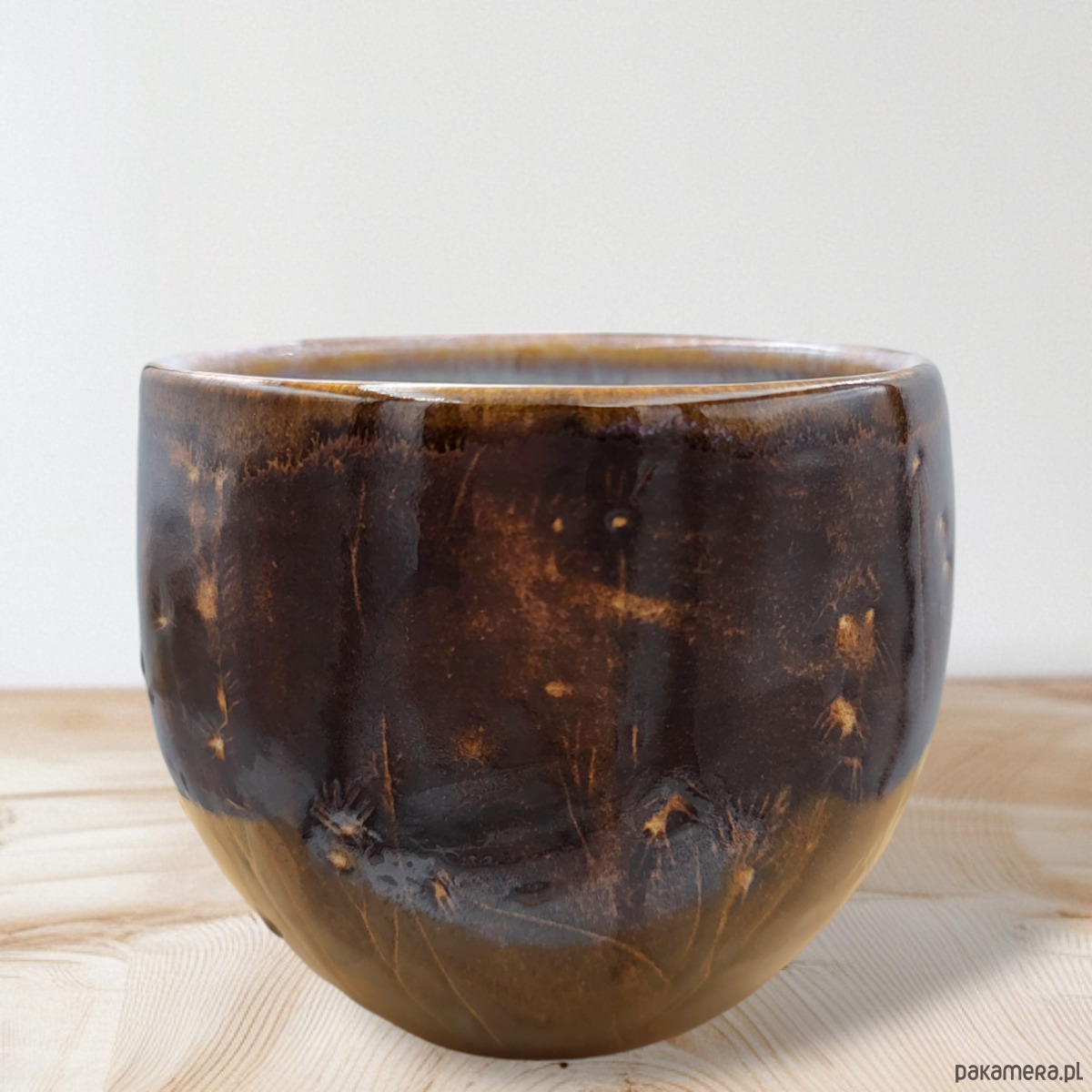 Szkliwiony bezpiecznymi szkliwami w odcieniach brązu.