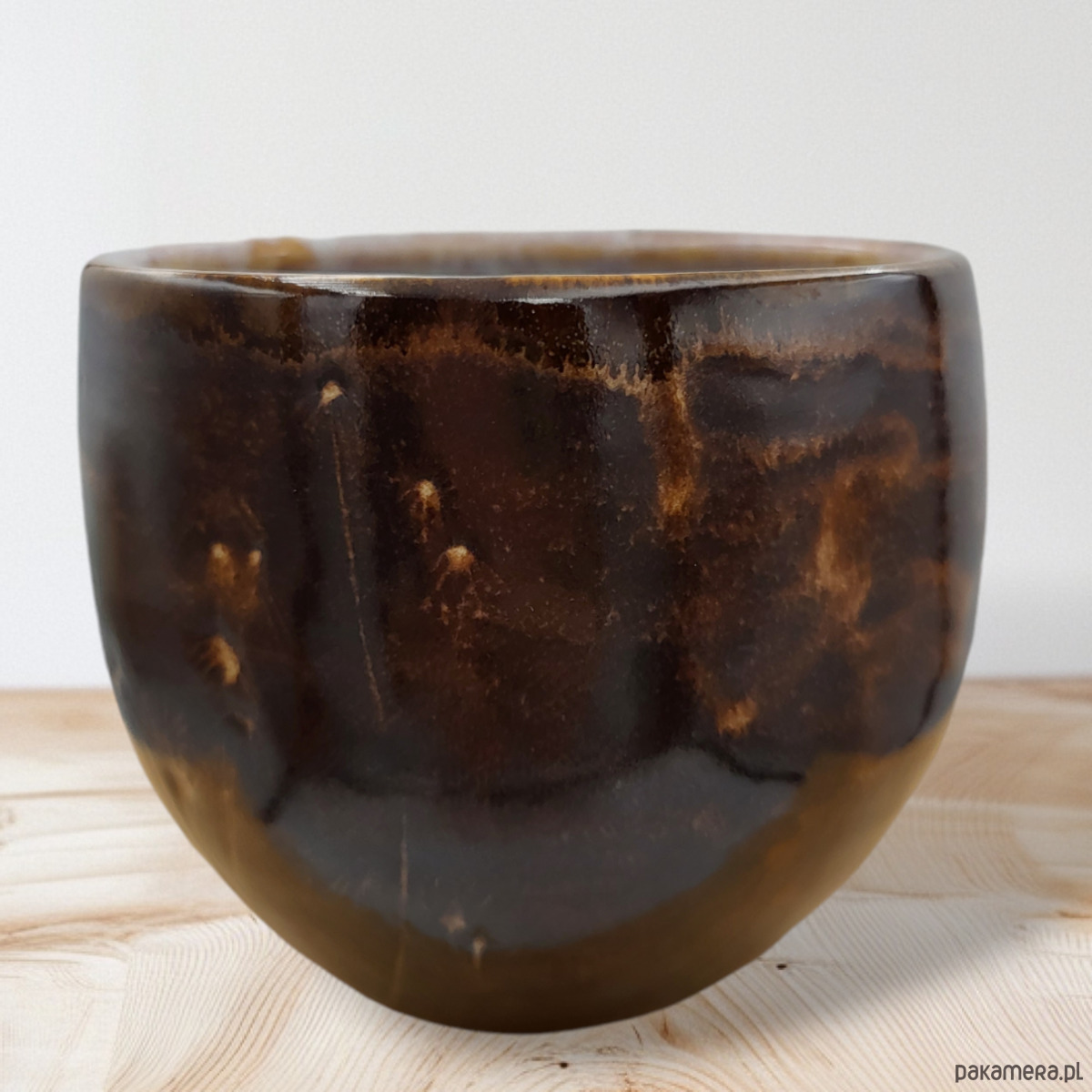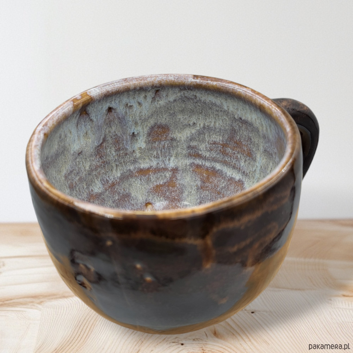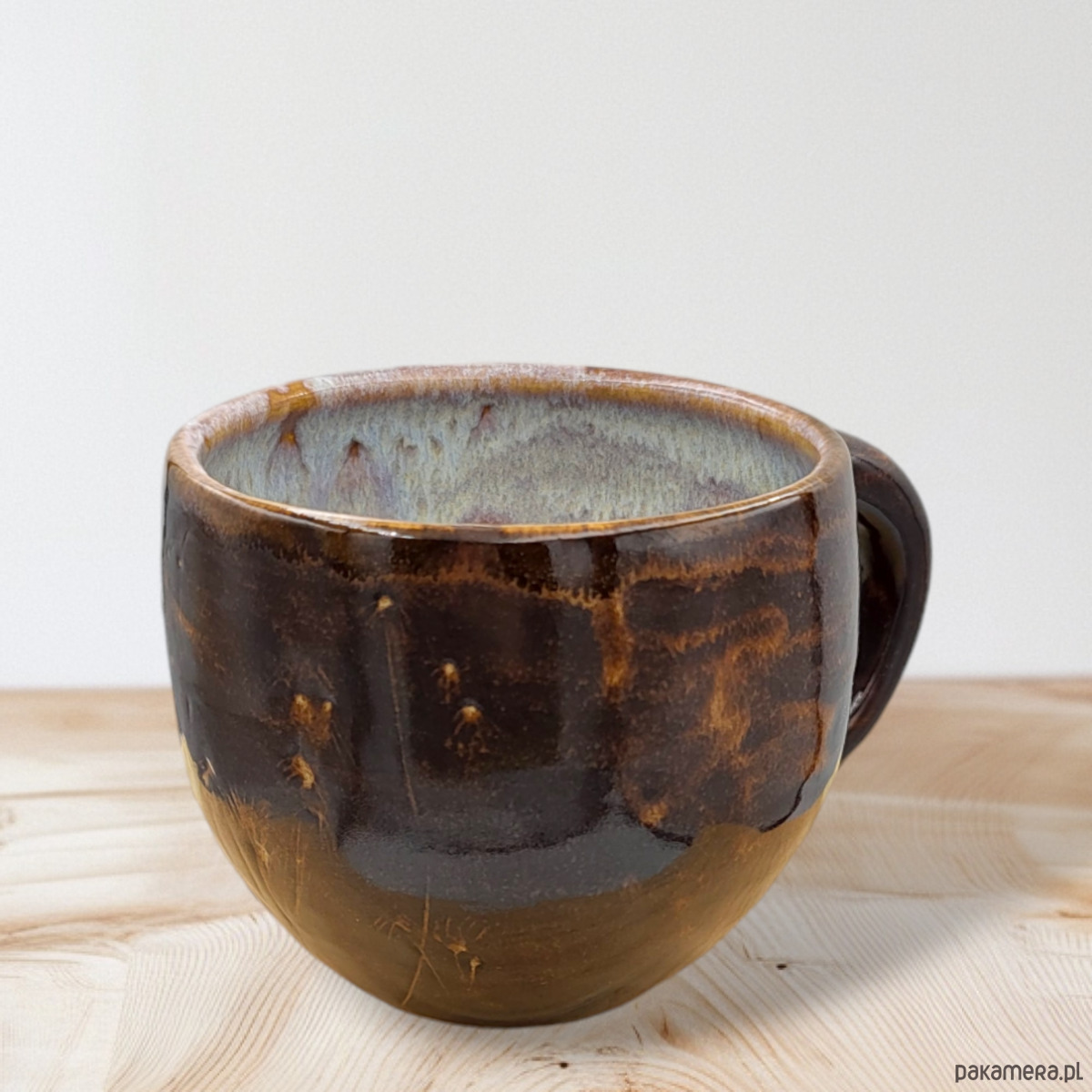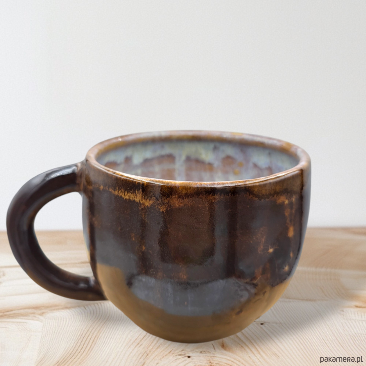 Szkliwiony bezpiecznymi szkliwami w odcieniach brązu.