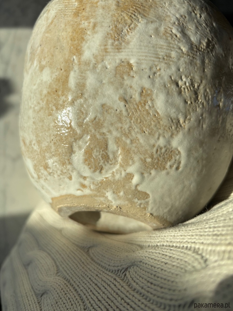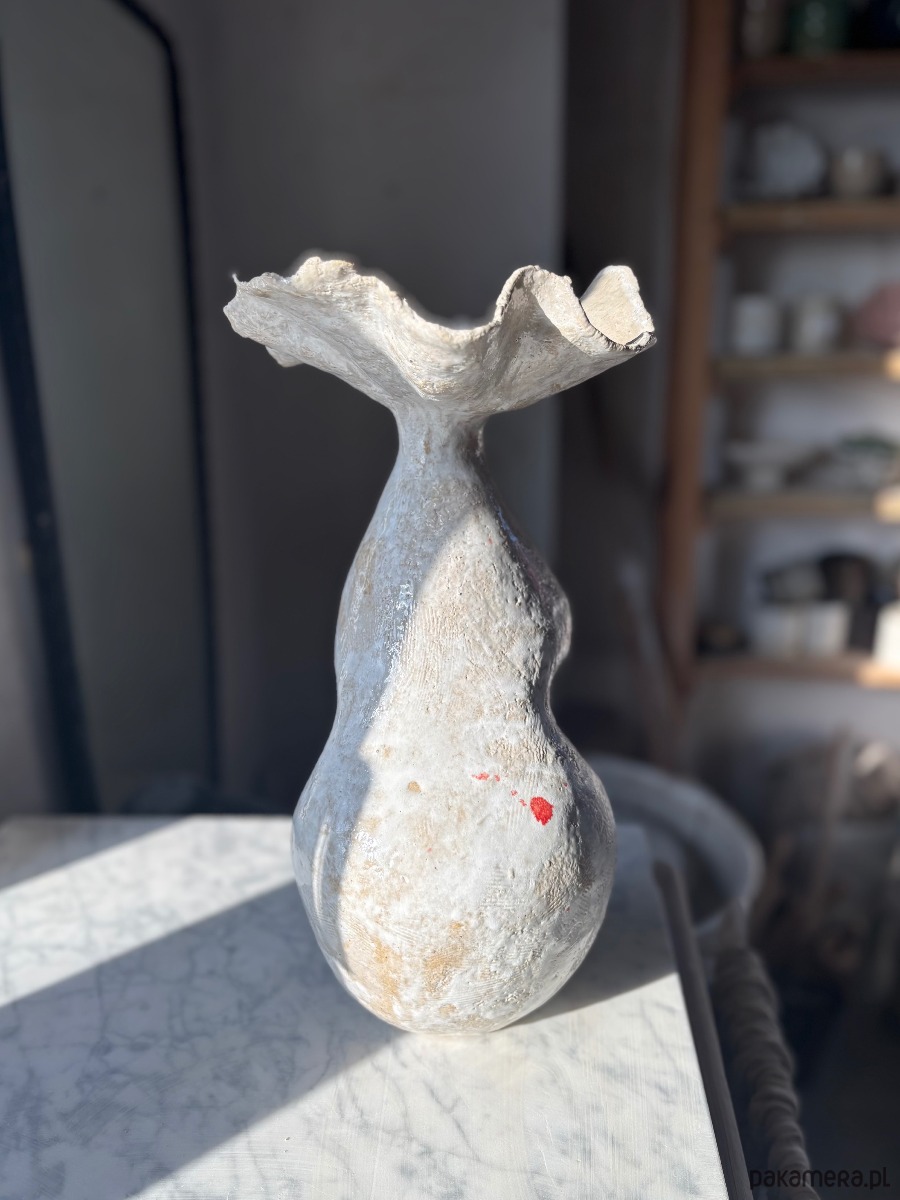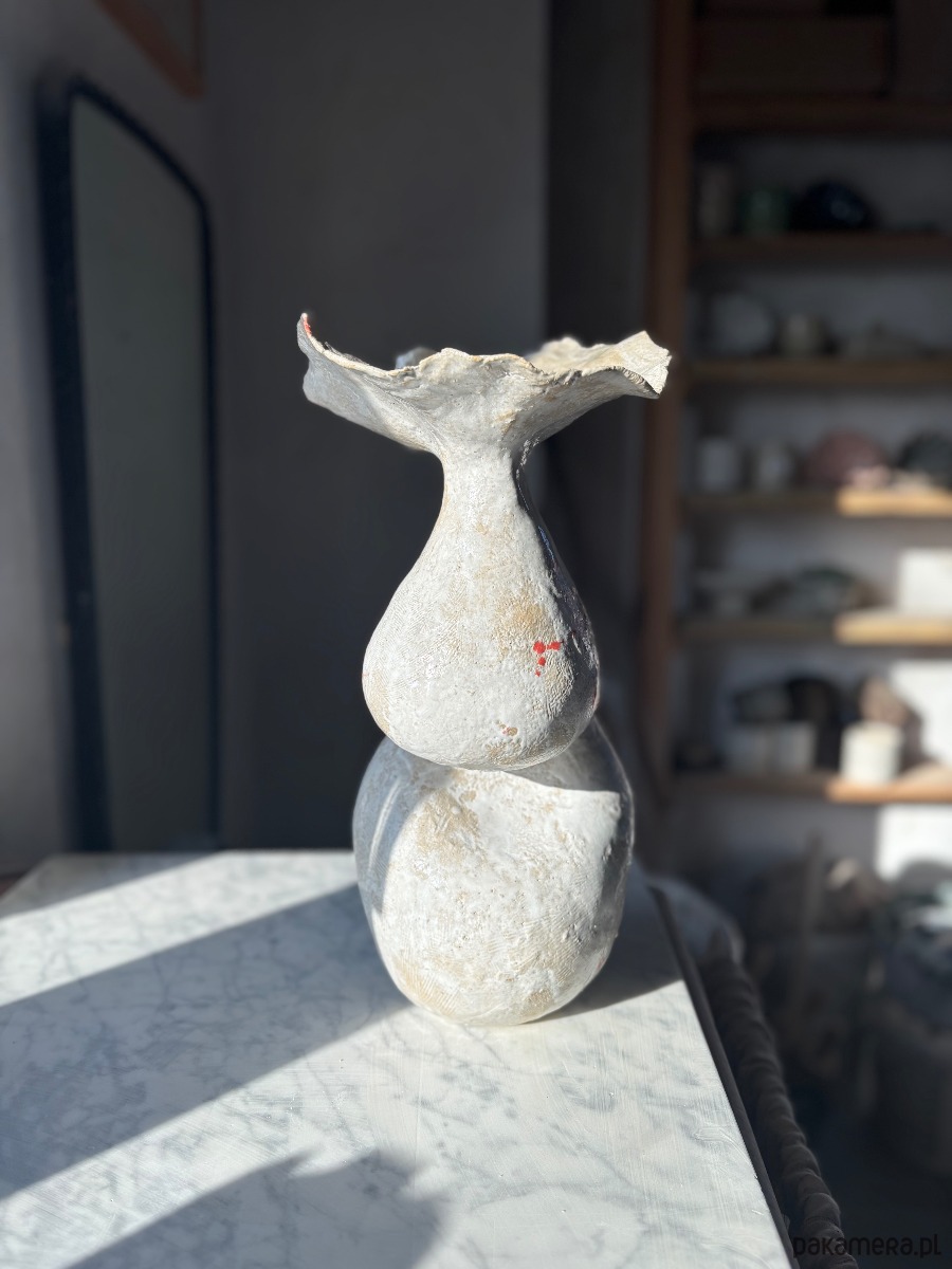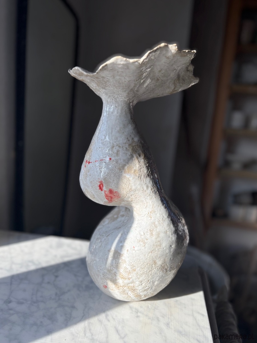 Obiekt powstał z jasnej, szorstkiej gliny szamotowej i został pokryty niejednorodnie nałożonym białym szkliwem. Tworzy ono subtelną paletę odcieni, od chłodnych beży po delikatne biele. Pojedyncze akcenty czerwieni dodają formie charakteru i przełamują jej stonowaną estetykę.