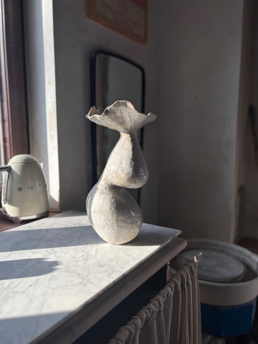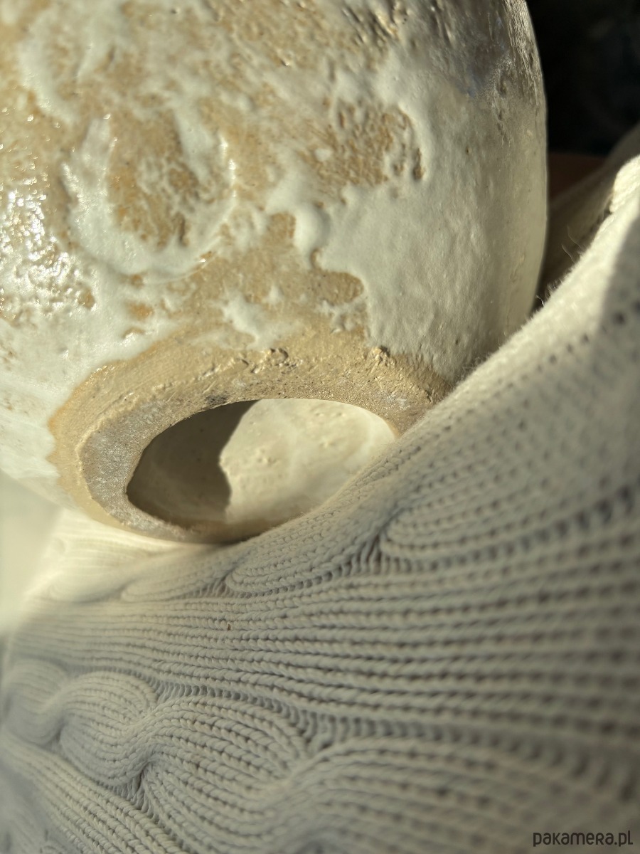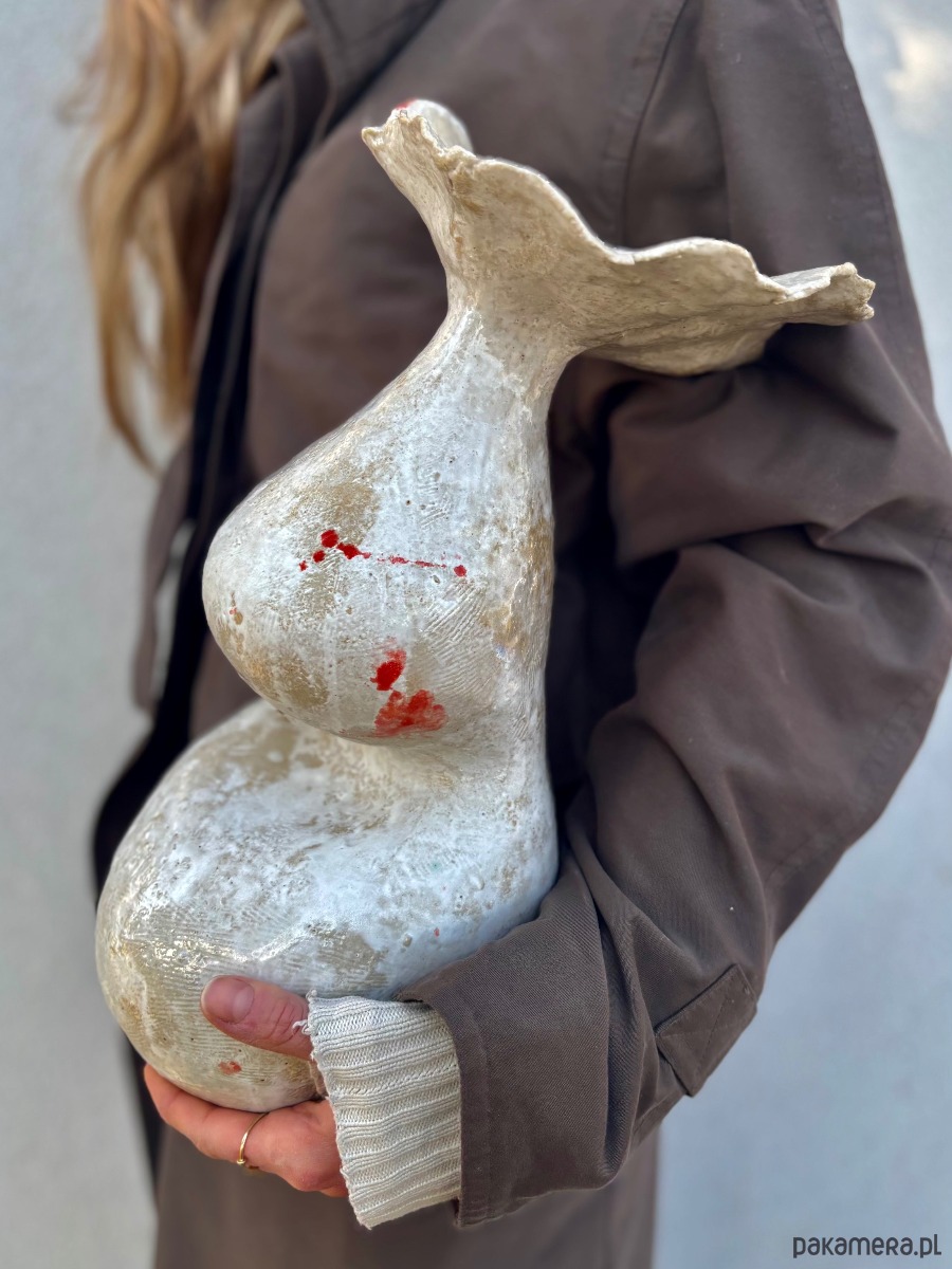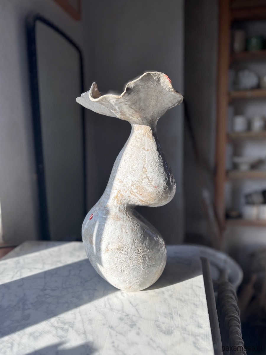 Obiekt powstał z jasnej, szorstkiej gliny szamotowej i został pokryty niejednorodnie nałożonym białym szkliwem. Tworzy ono subtelną paletę odcieni, od chłodnych beży po delikatne biele. Pojedyncze akcenty czerwieni dodają formie charakteru i przełamują jej stonowaną estetykę.