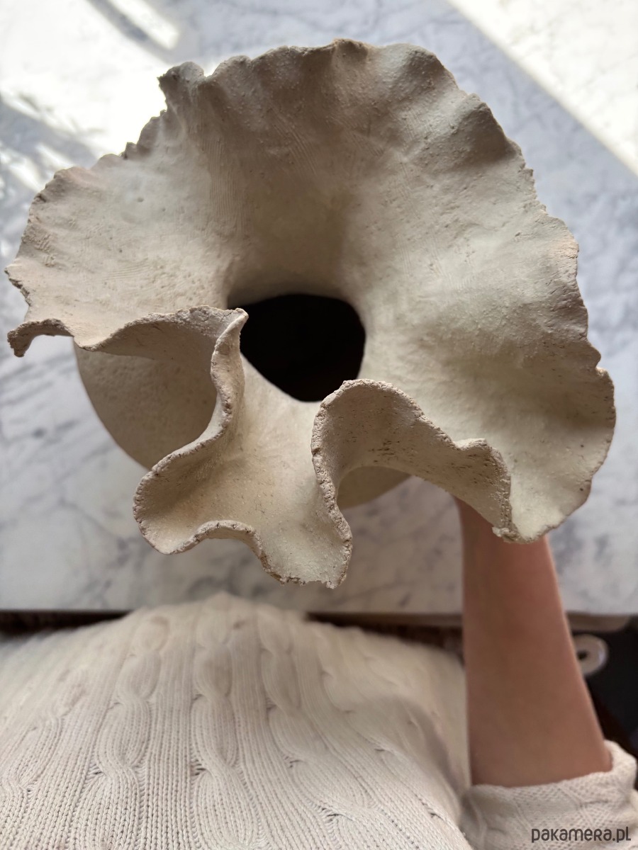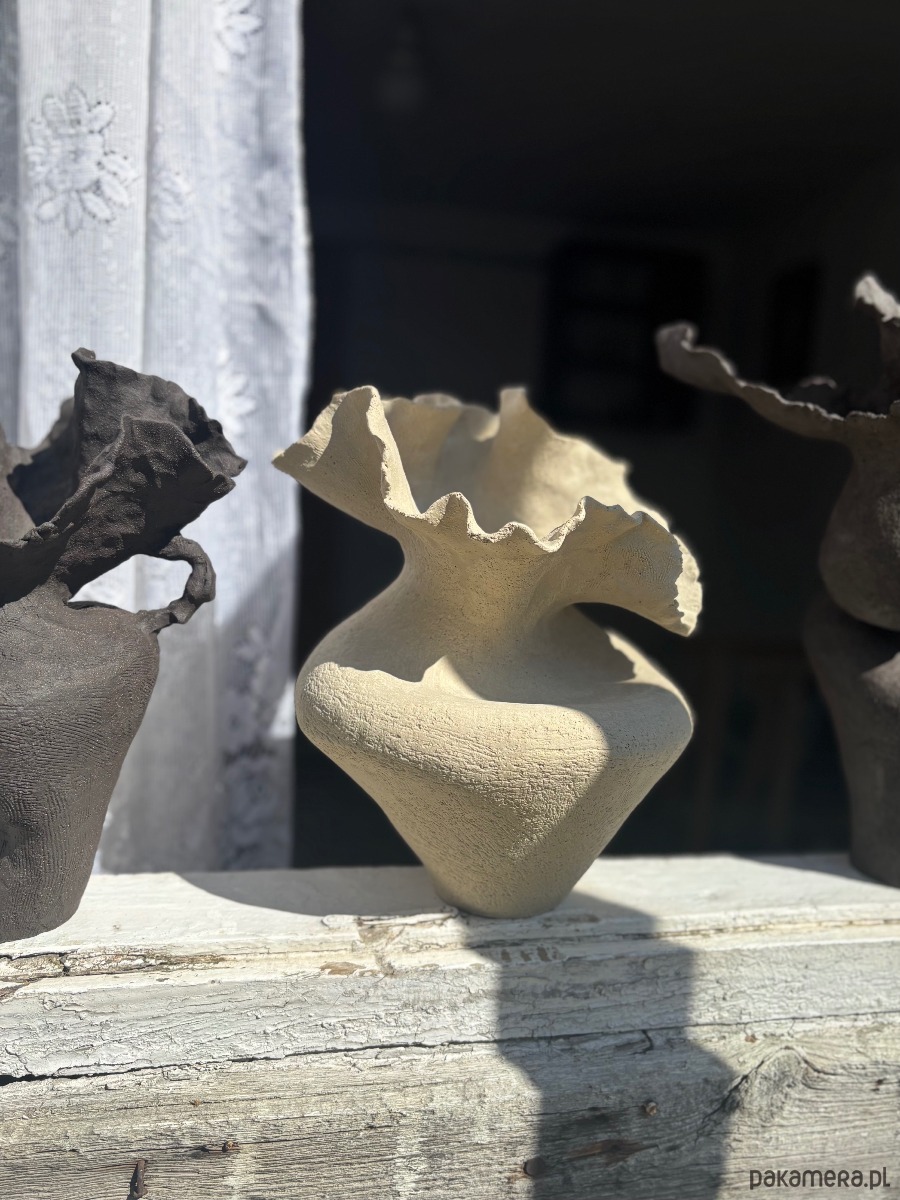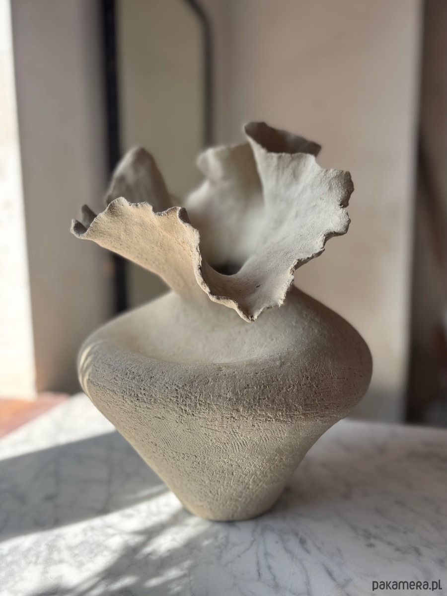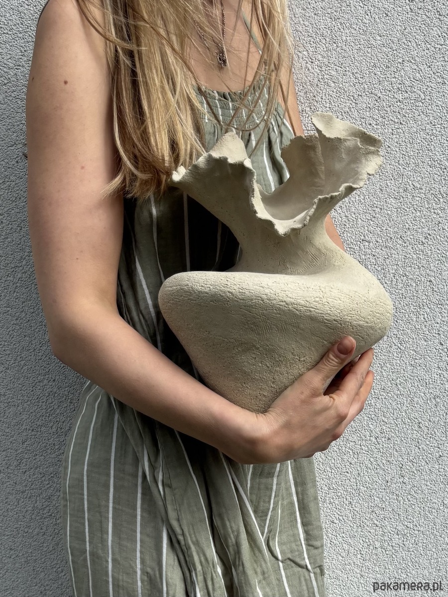 Wykonany ręcznie ceramiczny wazon o nieregularnym, organicznym kształcie, zbudowany z jasnej, szorstkiej szamotowej gliny, nieszkliwiony.