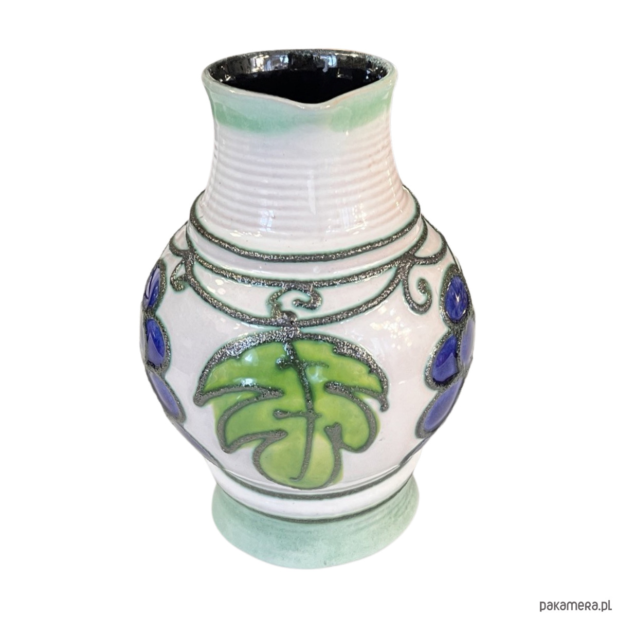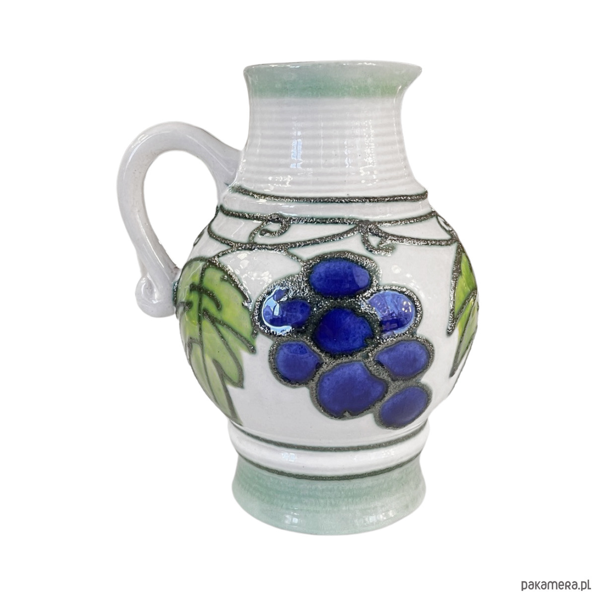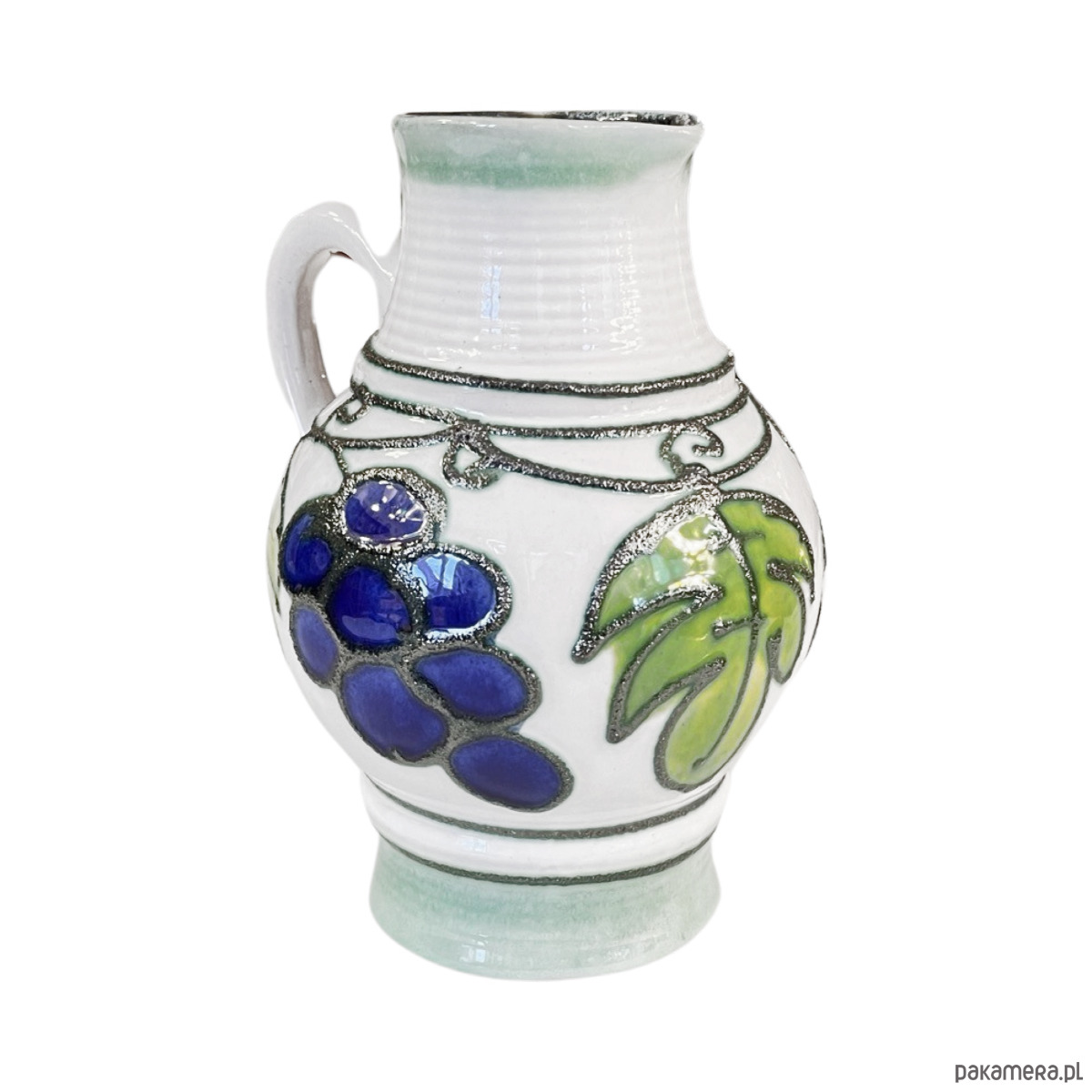 Ręcznie zdobiony dzbanek ceramiczny z uchem typ 9003 utrzymany w stylu rustykalnym został wyprodukowany przez Strehla Keramik w Niemczech w latach 70. Przedmiot w stanie oryginalnym, bardzo dobrym, nosi minimalne ślady użytkowania.