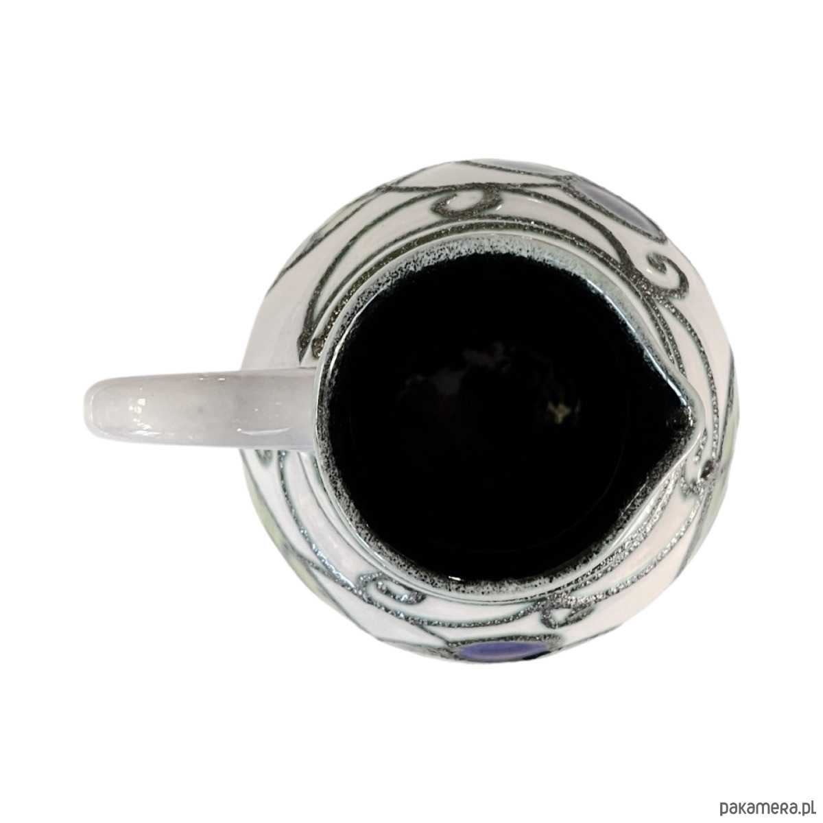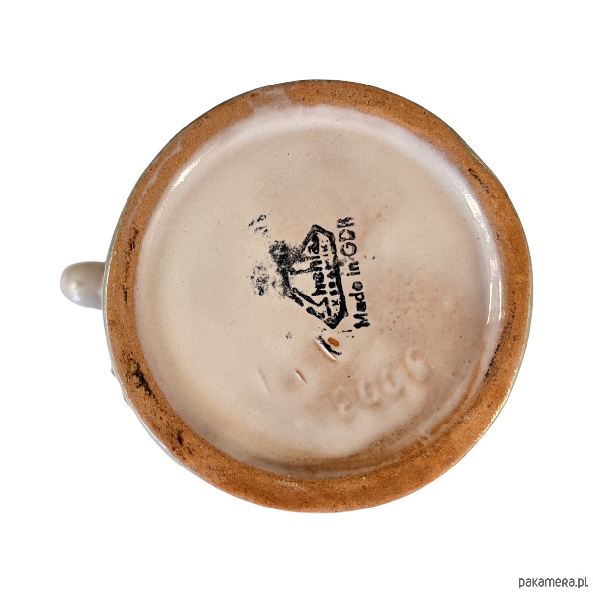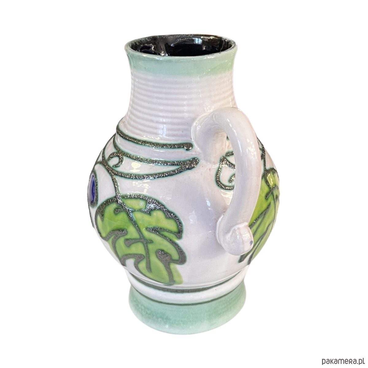 Ręcznie zdobiony dzbanek ceramiczny z uchem typ 9003 utrzymany w stylu rustykalnym został wyprodukowany przez Strehla Keramik w Niemczech w latach 70. Przedmiot w stanie oryginalnym, bardzo dobrym, nosi minimalne ślady użytkowania.