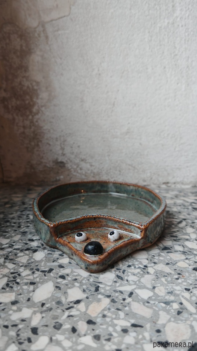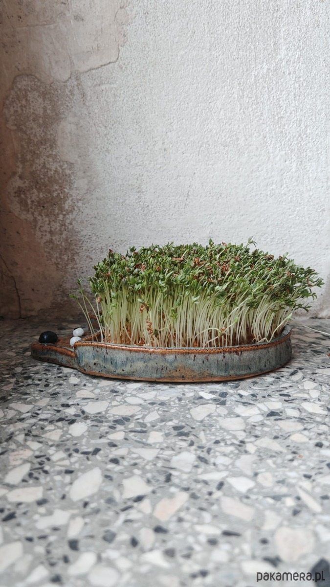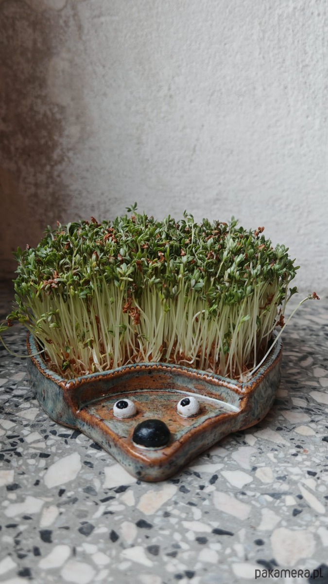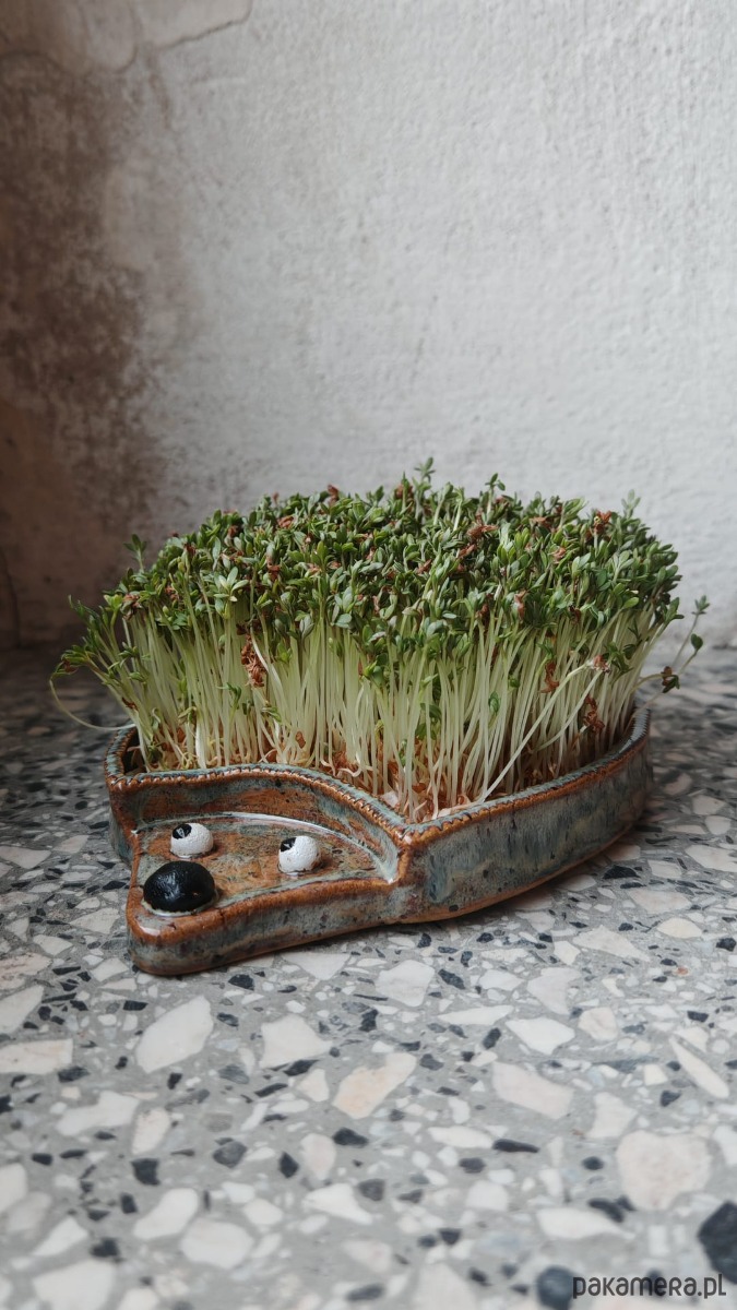 Ręcznie wykonany jeżyk ceramiczny na rzeżuchę, długość 17cm, wysokość 2cm, szerokość 11.5cm. Produkt nadaje się do mycia w zmywarce.