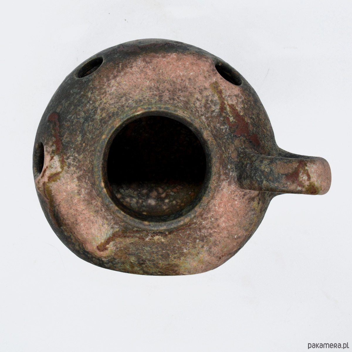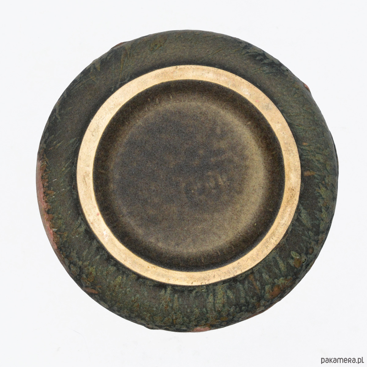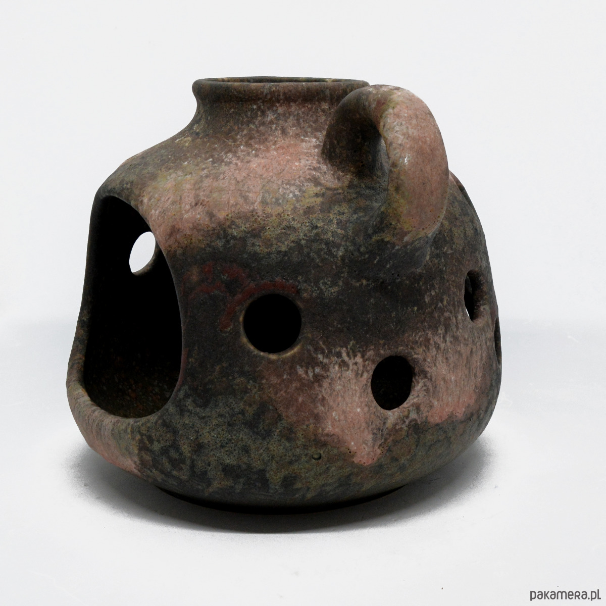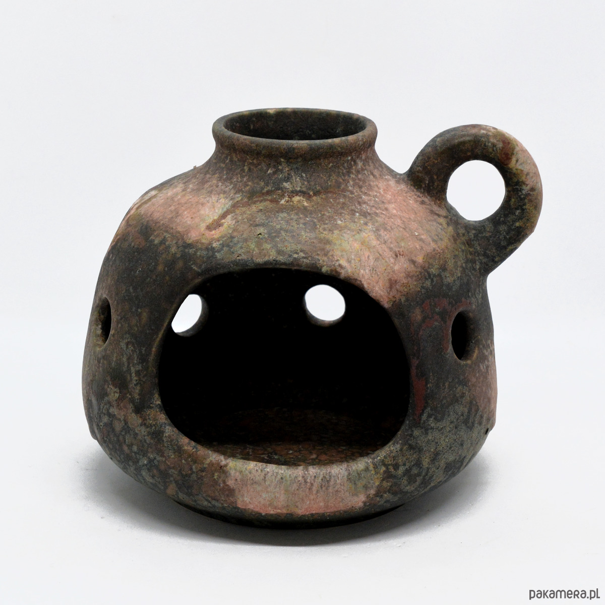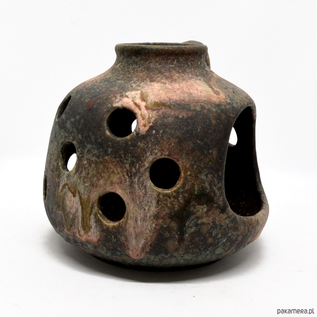 Wielki, ręcznie zdobiony komin na olejki eteryczne ze znanej niemieckiej manufaktury Ruscha Art Keramik wyprodukowany w drugiej połowie lat 70. Komin z serii Sahara, o niezwykłej malaturze strukturalnej inspirowanej roślinnością pustynną i wysuszoną, spękaną ziemią. Przedmiot w stanie bardzo dobrym - praktycznie nieużywany. Piękny przedmiot wykonany w sekcji artystycznej manufaktury Ruscha.