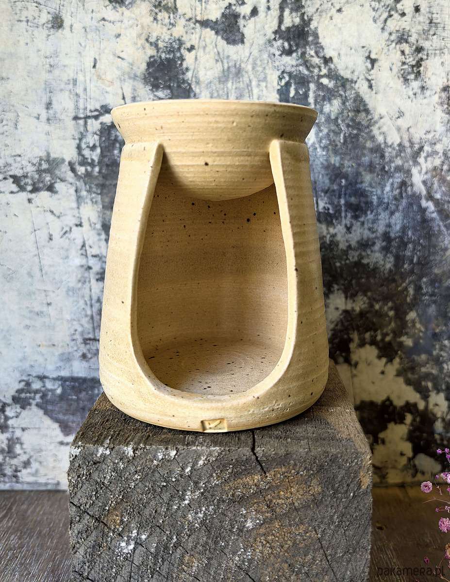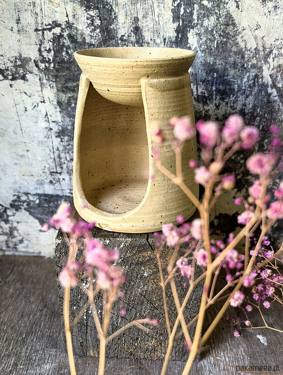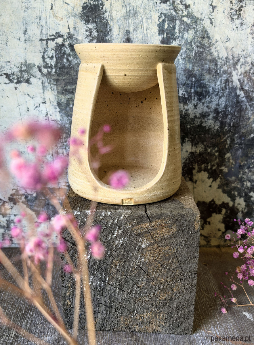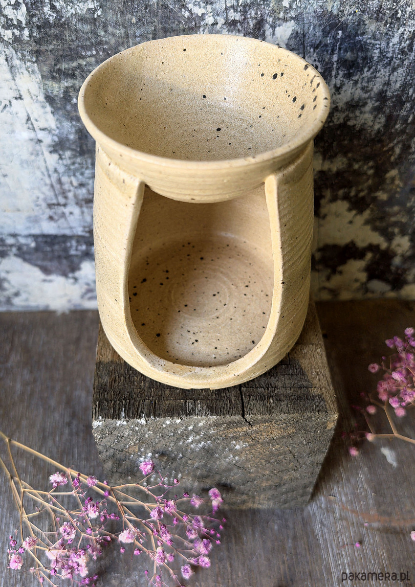 Ceramiczny kominek na olejki, wytoczony na kole garncarskim. Pokryty szkliwem w kolorze piasku z efektem nakropień. Wysokość 10cm.
